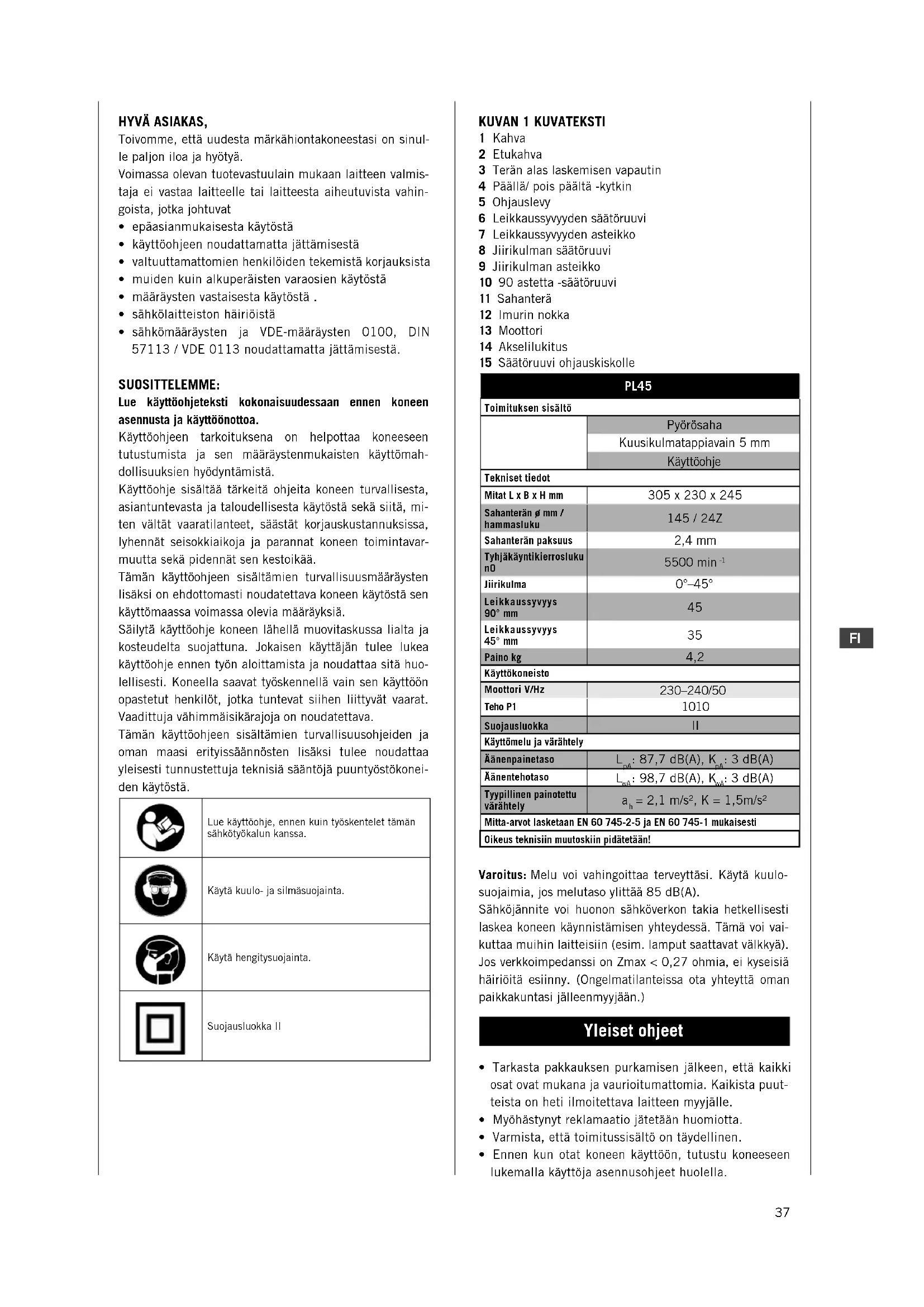 - sähkömääräysten ja VDE-määräysten 0100, DIN 57113 / VDE 0113 noudattamatta jättämisestä. SUOSITTELEMME: Lue käyttöohjeteksti kokonaisuudessaan ennen koneen asennusta ja käyttöönottoa. Käyttöohjeen tarkoituksena on helpottaa koneeseen tutustumista ja sen määräystenmukaisten käyttömah- dollisuuksien hyödyntämistä. Käyttöohje sisältää tärkeitä ohjeita koneen turvallisesta, asiantuntevasta ja taloudellisesta käytöstä sekä siitä, mi- ten vältät vaaratilanteet, säästät korjauskustannuksissa, lyhennät seisokkiaikoja ja parannat koneen toimintavar- muutta sekä pidennät sen kestoikää. Tämän käyttöohjeen sisältämien turvallisuusmääräysten lisäksi on ehdottomasti noudatettava koneen käytöstä sen käyttömaassa voimassa olevia määräyksiä. Säilytä käyttöohje koneen lähellä muovitaskussa lialta ja kosteudelta suojattuna. Jokaisen käyttäjän tulee lukea käyttöohje ennen työn aloittamista ja noudattaa sitä huo- lellisesti. Koneella saavat työskennellä vain sen käyttöön opastetut henkilöt, jotka tuntevat siihen liittyvät vaarat. Vaadittuja vähimmäisikärajoja on noudatettava. Tämän käyttöohjeen sisältämien turvallisuusohjeiden ja oman maasi erityissäännösten lisäksi tulee noudattaa yleisesti tunnustettuja teknisiä sääntöjä puuntyöstökonei- den käytöstä. Lue käyttöohje, ennen kuin työskentelet tämän sähkötyökalun kanssa.Käytä kuulo- ja silmäsuojainta.Käytä hengitysuojainta.Suojausluokka II KUVAN 1 KUVATEKSTI 1 Kahva 2 Etukahva 3 Terän alas laskemisen vapautin 4 Päällä/ pois päältä -kytkin 5 Ohjauslevy 6 Leikkaussyvyyden säätöruuvi 7 Leikkaussyvyyden asteikko 8 Jiirikulman säätöruuvi 9 Jiirikulman asteikko 10 90 astetta -säätöruuvi 11 Sahanterä 12 Imurin nokka 13 Moottori 14 Akselilukitus 15 Säätöruuvi ohjauskiskolle PL45 Toimituksen sisältö Pyörösaha Kuusikulmatappiavain 5 mm Käyttöohje Tekniset tiedotMitat L x B x H mm 305 x 230 x 245 Sahanterän ø mm / hammasluku 145 / 24Z Sahanterän paksuus 2,4 mm Tyhjäkäyntikierrosluku