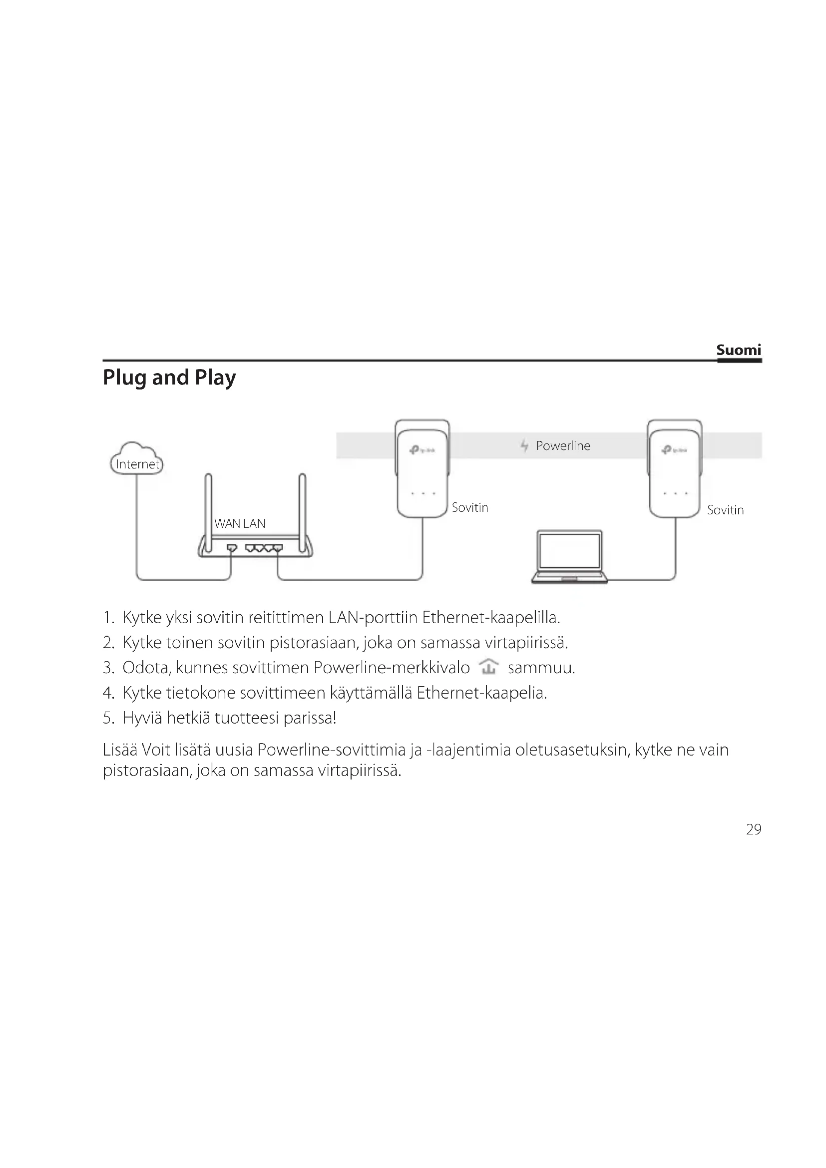 Lisää Voit lisätä uusia Powerline-sovittimia ja -laajentimia oletusasetuksin, kytke ne vain pistorasiaan, joka on samassa virtapiirissä. Internet WAN LAN Sovitin Sovitin PowerlineSuomi