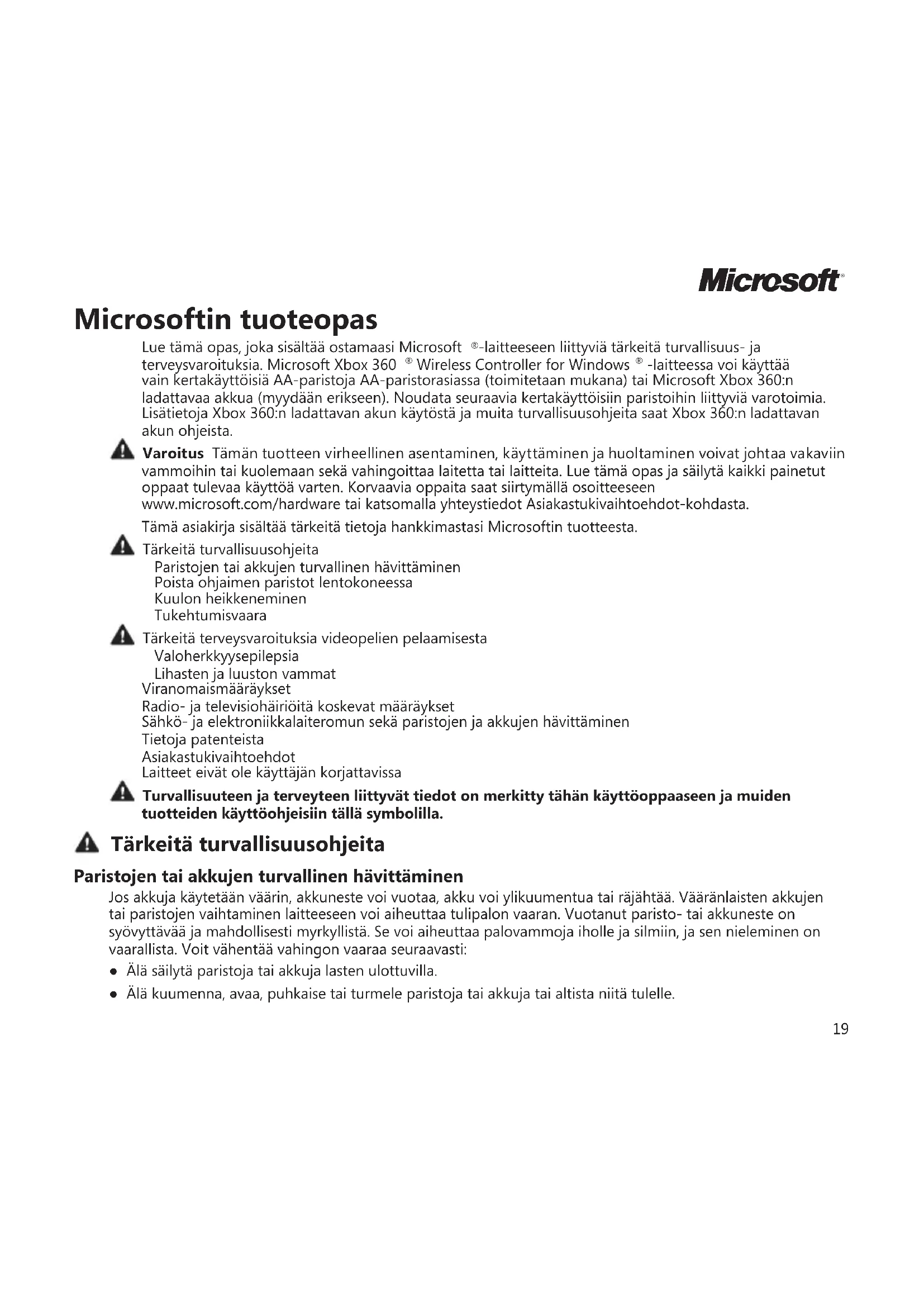 -laitteessa voi käyttää vain kertakäyttöisiä AA-paristoja AA-paristorasiassa (toimitetaan mukana) tai Microsoft Xbox 360:n ladattavaa akkua (myydään erikseen). Noudata seuraavia kertakäyttöisiin paristoihin liittyviä varotoimia. Lisätietoja Xbox 360:n ladattavan akun käytöstä ja muita turvallisuusohjeita saat Xbox 360:n ladattavan akun ohjeista. Varoitus Tämän tuotteen virheellinen asentaminen, käyttäminen ja huoltaminen voivat johtaa vakaviin vammoihin tai kuolemaan sekä vahingoittaa laitetta tai laitteita. Lue tämä opas ja säilytä kaikki painetut oppaat tulevaa käyttöä varten. Korvaavia oppaita saat siirtymällä osoitteeseen www.microsoft.com/hardware tai katsomalla yhteystiedot Asiakastukivaihtoehdot-kohdasta. Tämä asiakirja sisältää tärkeitä tietoja hankkimastasi Microsoftin tuotteesta. Tärkeitä turvallisuusohjeita Paristojen tai akkujen turvallinen hävittäminen Poista ohjaimen paristot lentokoneessa Kuulon heikkeneminen Tukehtumisvaara Tärkeitä terveysvaroituksia videopelien pelaamisesta Valoherkkyysepilepsia Lihasten ja luuston vammat Viranomaismääräykset Radio- ja televisiohäiriöitä koskevat määräykset Sähkö- ja elektroniikkalaiteromun sekä paristojen ja akkujen hävittäminen Tietoja patenteista Asiakastukivaihtoehdot Laitteet eivät ole käyttäjän korjattavissa Turvallisuuteen ja terveyteen liittyvät tiedot on merkitty tähän käyttöoppaaseen ja muiden tuotteiden käyttöohjeisiin tällä symbolilla. Tärkeitä turvallisuusohjeita Paristojen tai akkujen turvallinen hävittäminen Jos akkuja käytetään väärin, akkuneste voi vuotaa, akku voi ylikuumentua tai räjähtää. Vääränlaisten akkujen tai paristojen vaihtaminen laitteeseen voi aiheuttaa tulipalon vaaran. Vuotanut paristo- tai akkuneste on syövyttävää ja mahdollisesti myrkyllistä. Se voi aiheuttaa palovammoja iholle ja silmiin, ja sen nieleminen on vaarallista. Voit vähentää vahingon vaaraa seuraavasti: ● Älä säilytä paristoja tai akkuja lasten ulottuvilla. ● Älä kuumenna, avaa, puhkaise tai turmele paristoja tai akkuja tai altista niitä tulelle.