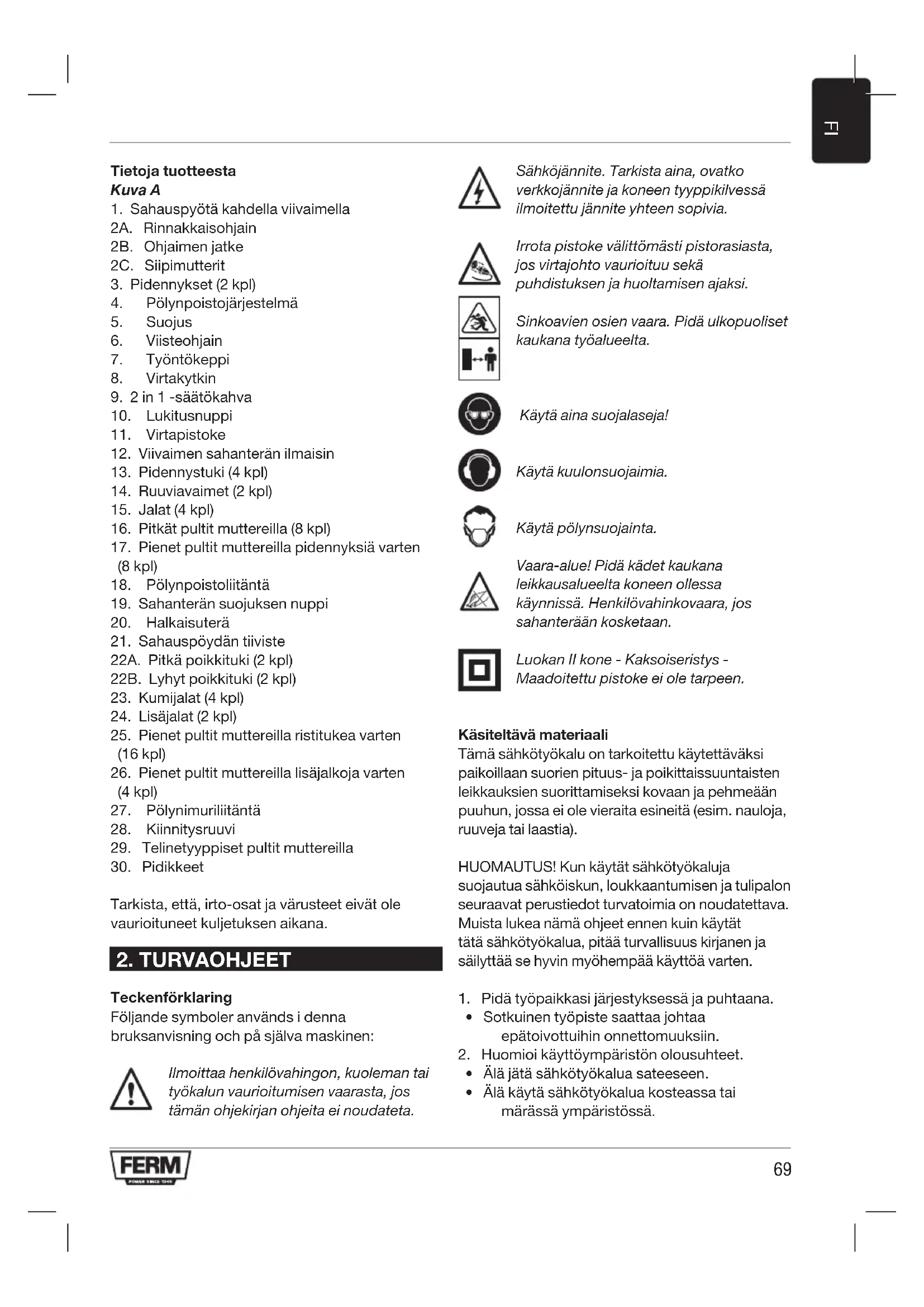 TSM1035 Kiitämme tämän FERM-tuotteen hankkimisesta. Olette hankkineet erinomaisen tuotteen, jonka tarjoaa yksi Euroopan johtavista toimittajista. Kaikki Fermin valmistamat tuotteet on valmistettu korkeimpien suorituskykyä ja turvallisuutta koskevien standardien mukaisesti. Osana filosofiaamme tarjoamme myös korkealuokkaisen asiakaspalvelun sekä kaiken kattavan takuun. Toivomme, että nautitte tämän tuotteen käytöstä monien vuosien ajan. Tekstin numerot viittaavat kaavioihin sivulla 2 - 6. Lue sähkölaitteiden ohjeet aina huolellisesti ennen käyttöä. Ohjeiden avulla ymmärrät laitteen toiminnan paremmin ja osaat välttää tarpeettomia riskejä. Pane ohjekirja huolellisesti talteen vastaisen varalle. Sisällys