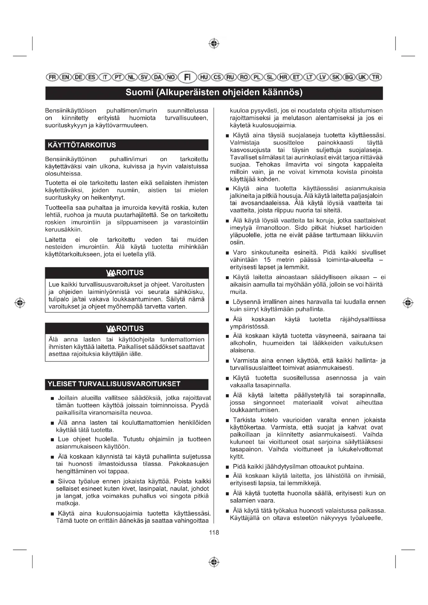 Bensiinikäyttöinen puhallin/imuri on tarkoitettu käytettäväksi vain ulkona, kuivissa ja hyvin valaistuissa olosuhteissa. Tuotetta ei ole tarkoitettu lasten eikä sellaisten ihmisten käytettäväksi, joiden ruumiin, aistien tai mielen suorituskyky on heikentynyt. Tuotteella saa puhaltaa ja imuroida kevyitä roskia, kuten lehtiä, ruohoa ja muuta puutarhajätettä. Se on tarkoitettu roskien imurointiin ja silppuamiseen ja varastointiin keruusäkkiin. Laitetta ei ole tarkoitettu veden tai muiden nesteiden imurointiin. Älä käytä tuotetta mihinkään käyttötarkoitukseen, jota ei luetella yllä. VAROITUS Lue kaikki turvallisuusvaroitukset ja ohjeet. Varoitusten ja ohjeiden laiminlyönnistä voi seurata sähköisku, tulipalo ja/tai vakava loukkaantuminen. Säilytä nämä varoitukset ja ohjeet myöhempää tarvetta varten. VAROITUS Älä anna lasten tai käyttöohjeita tuntemattomien ihmisten käyttää laitetta. Paikalliset säädökset saattavat asettaa rajoituksia käyttäjän iälle. YLEISET TURVALLISUUSVAROITUKSET ■ Joillain alueilla vallitsee säädöksiä, jotka rajoittavat tämän tuotteen käyttöä joissain toiminnoissa. Pyydä paikallisilta viranomaisilta neuvoa. ■ Älä anna lasten tai kouluttamattomien henkilöiden käyttää tätä tuotetta. ■ Lue ohjeet huolella. Tutustu ohjaimiin ja tuotteen asianmukaiseen käyttöön. ■ Älä koskaan käynnistä tai käytä puhallinta suljetussa tai huonosti ilmastoidussa tilassa. Pakokaasujen hengittäminen voi tappaa. ■ Siivoa työalue ennen jokaista käyttöä. Poista kaikki sellaiset esineet kuten kivet, lasinpalat, naulat, johdot ja langat, jotka voimakas puhallus voi singota pitkiä matkoja. ■ Käytä aina kuulonsuojaimia tuotetta käyttäessäsi. Tämä tuote on erittäin äänekäs ja saattaa vahingoittaa kuuloa pysyvästi, jos ei noudateta ohjeita altistumisen rajoittamiseksi ja melutason alentamiseksi ja jos ei käytetä kuulosuojaimia. ■ Käytä aina täysiä suojalaseja tuotetta käyttäessäsi. Valmistaja suosittelee painokkaasti täyttä kasvosuojusta tai täysin suljettuja suojalaseja. Tavalliset silmälasit tai aurinkolasit eivät tarjoa riittävää suojaa. Tehokas ilmavirta voi singota kappaleita milloin vain, ja ne voivat kimmota kovista pinoista käyttäjää kohden. ■ Käytä aina tuotetta käyttäessäsi asianmukaisia jalkineita ja pitkiä housuja. Älä käytä laitetta paljasjaloin tai avosandaaleissa. Älä käytä löysiä vaatteita tai vaatteita, joista riippuu nuoria tai siteitä. ■ Älä käytä löysiä vaatteita tai koruja, jotka saattaisivat imeytyä ilmanottoon. Sido pitkät hiukset hartioiden yläpuolelle, jotta ne eivät pääse tarttumaan liikkuviin osiin. ■ Varo sinkoutuneita esineitä. Pidä kaikki sivulliset vähintään 15 metrin päässä toiminta-alueelta – erityisesti lapset ja lemmikit. ■ Käytä laitetta ainoastaan säädylliseen aikaan – ei aikaisin aamulla tai myöhään yöllä, jolloin se voi häiritä muita. ■ Löysennä irrallinen aines haravalla tai luudalla ennen kuin siirryt käyttämään puhallinta. ■ Älä koskaan käytä tuotetta räjähdysalttiissa ympäristössä. ■ Älä koskaan käytä tuotetta väsyneenä, sairaana tai alkoholin, huumeiden tai lääkkeiden vaikutuksen alaisena. ■ Varmista aina ennen käyttöä, että kaikki hallinta- ja turvallisuuslaitteet toimivat asianmukaisesti. ■ Käytä tuotetta suositellussa asennossa ja vain vakaalla tasapinnalla. ■ Älä käytä laitetta päällystetyllä tai sorapinnalla, jossa singonneet materiaalit voivat aiheuttaa loukkaantumisen. ■ Tarkista kotelo vaurioiden varalta ennen jokaista käyttökertaa. Varmista, että suojat ja kahvat ovat paikoillaan ja kiinnitetty asianmukaisesti. Vaihda kuluneet tai vioittuneet osat sarjoina säilyttääksesi tasapainon. Vaihda vioittuneet ja lukukelvottomat kyltit. ■ Pidä kaikki jäähdytysilman ottoaukot puhtaina. ■ Älä koskaan käytä laitetta, jos lähistöllä on ihmisiä, erityisesti lapsia, tai lemmikkejä. ■ Älä käytä tuotetta huonolla säällä, erityisesti kun on salamien vaara. ■ Älä käytä tätä työkalua huonosti valaistussa paikassa. Käyttäjällä on oltava esteetön näkyvyys työalueelle,119 Suomi (Alkuperäisten ohjeiden käännös) jotta hän näkee mahdolliset vaaratekijät. ■ Samankaltaisten laitteiden käyttö lähettyvillä kasvattaa kuulovaurion riskiä sekä vaaraa, että joku muu tulee työalueellesi. ■ Seiso rinteissä aina tukevasti. Kävele, älä koskaan juokse. ■ Pysyttele tukevasti jaloillasi äläkä kurkota käsivartta liian kauas. Älä kurkota liian pitkälle. Liian pitkälle kurkotta minen saattaa johtaa tasapainon menettämiseen. ■ Älä päästä käsiä, muita ruumiinosia tai vaatteita pyörivien syöttökammioon, poistoaukkoon tai liikkuvien osien lähelle. ■ Älä koskaan käytä tuotetta, jos suojat tai suojukset ovat epäkunnossa tai ilman suojalaitteita, kuten roskien kerääjää. ■ Älä muunna laitetta millään tavoin tai käytä osia tai lisävarusteita, jotka eivät ole valmistajan suosittelemia. VAROITUS Ennen kuin laitetta voidaan käyttää imuritoiminnolla, sen ylempi ja alempi imuputki on koottava yhteen. Tämä täytyy tehdä vain kerran. Älä koskaan käytä imuria pelkällä ylemmällä imuputkella. Loukkaantumisen vaara lisääntyy huomattavasti, jos et noudata tätä varoitusta. VAROITUS Jos tuote putoaa, saa kovan iskun tai alkaa täristä normaalia enemmän, sammuta se heti ja tarkista se vaurioiden varalta tai paikanna tärinän syy. Valtuutetun huoltopisteen on korjattava tai vaihdettava vioittuneet osat asianmukaisesti. ■ Älä kosketa tuotteen äänenvaimenninta tai sylinteriä ympäröivää aluetta, sillä nämä osat kuumenevat käytön aikana. ■ Aina ennen polttoaineen lisäämistä sammuta puhallin ja anna sen jäähtyä kokonaan. ■ Kun lisäät tai sekoitat polttoainetta, tee se aina hyvin ilmastoidussa tilassa, etäällä avotulen aiheuttamist