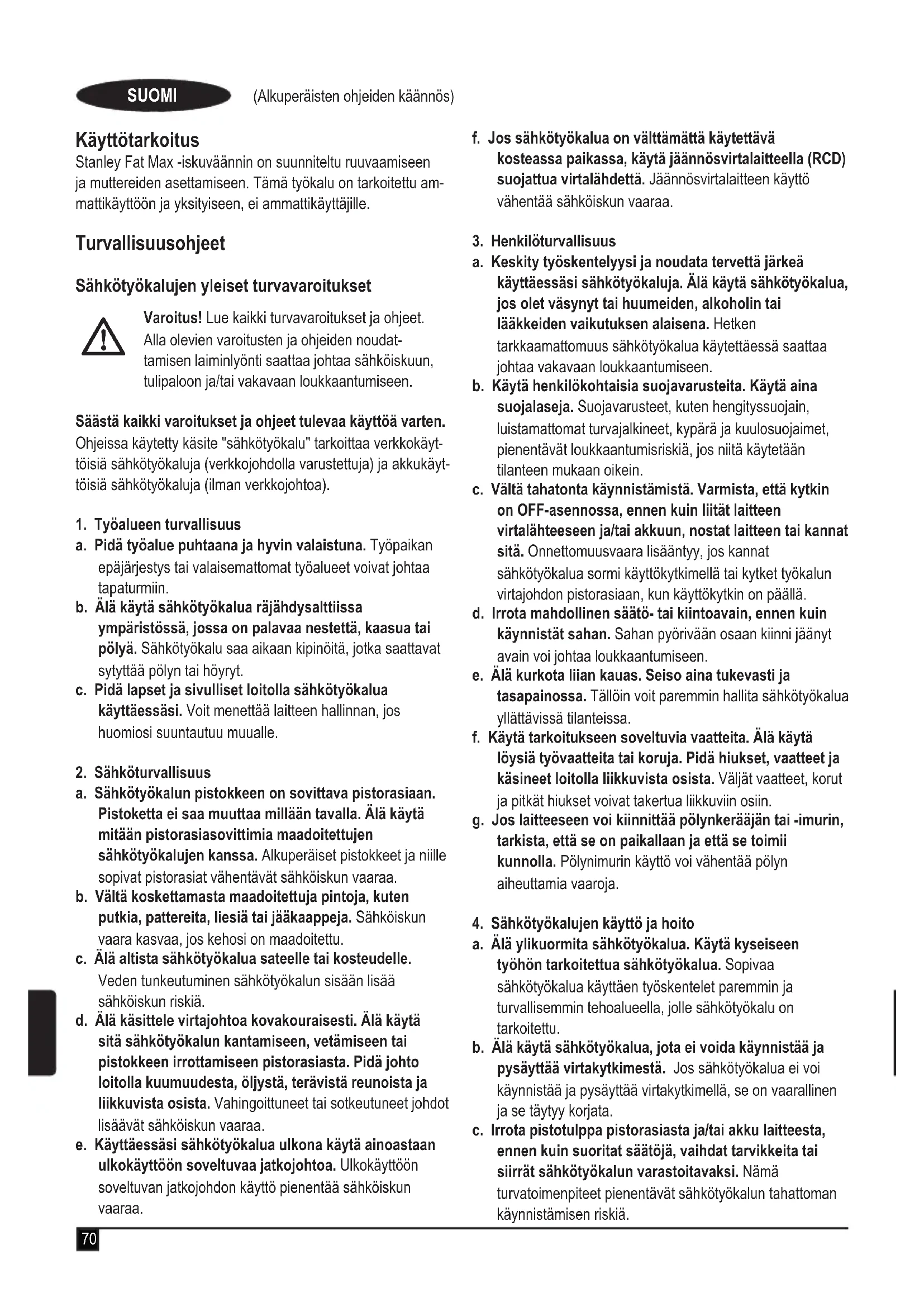 Varoitus! Lue kaikki turvavaroitukset ja ohjeet. Alla olevien varoitusten ja ohjeiden noudat- tamisen laiminlyönti saattaa johtaa sähköiskuun, tulipaloon ja/tai vakavaan loukkaantumiseen. Säästä kaikki varoitukset ja ohjeet tulevaa käyttöä varten. Ohjeissa käytetty käsite "sähkötyökalu" tarkoittaa verkkokäyt- töisiä sähkötyökaluja (verkkojohdolla varustettuja) ja akkukäyt- töisiä sähkötyökaluja (ilman verkkojohtoa).