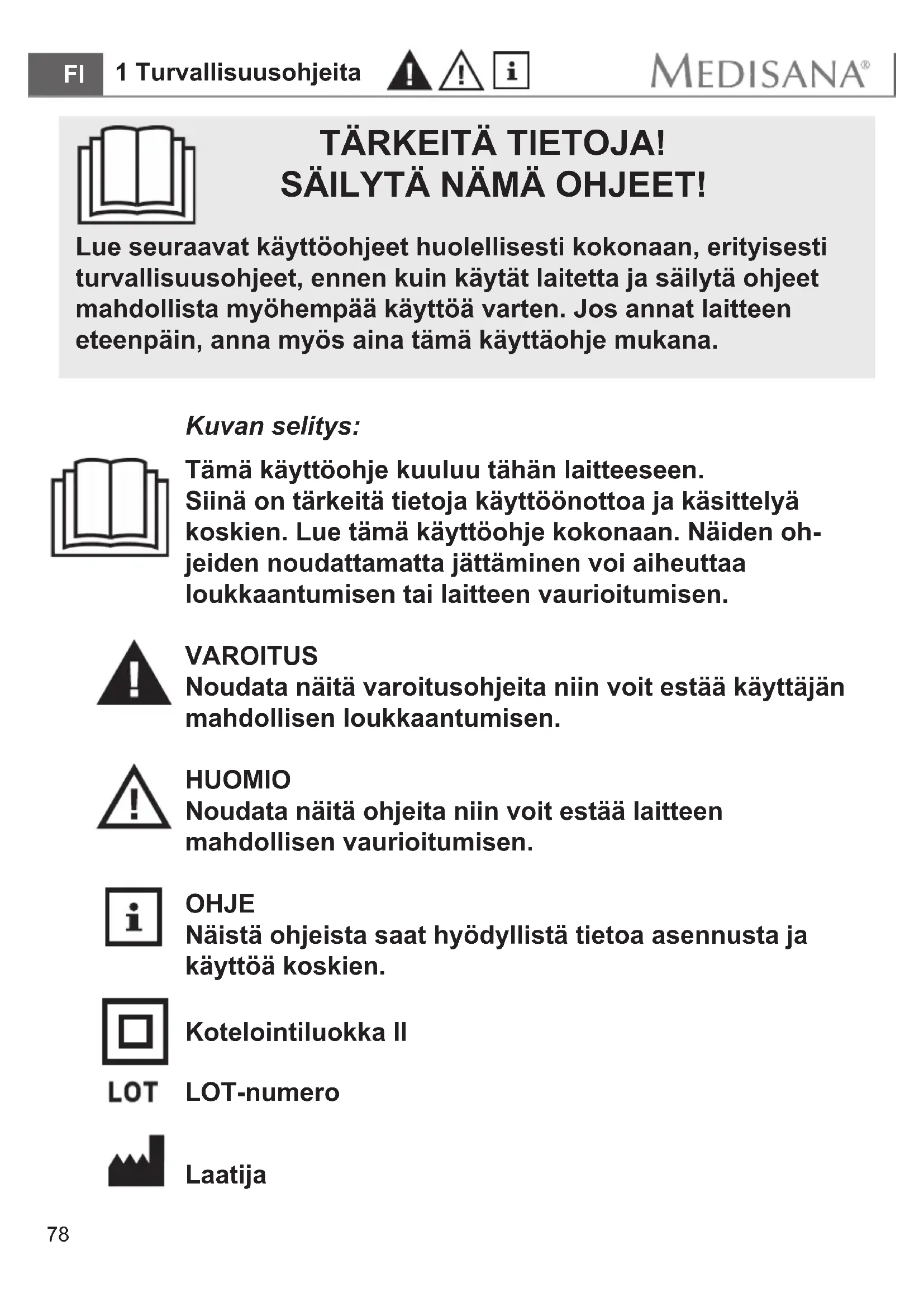 TÄRKEITÄ TIETOJA! SÄILYTÄ NÄMÄ OHJEET! Lue seuraavat käyttöohjeet huolellisesti kokonaan, erityisesti turvallisuusohjeet, ennen kuin käytät laitetta ja säilytä ohjeet mahdollista myöhempää käyttöä varten. Jos annat laitteen eteenpäin, anna myös aina tämä käyttäohje mukana. Kuvan selitys: Tämä käyttöohje kuuluu tähän laitteeseen. Siinä on tärkeitä tietoja käyttöönottoa ja käsittelyä koskien. Lue tämä käyttöohje kokonaan. Näiden oh- jeiden noudattamatta jättäminen voi aiheuttaa loukkaantumisen tai laitteen vaurioitumisen. VAROITUS Noudata näitä varoitusohjeita niin voit estää käyttäjän mahdollisen loukkaantumisen. HUOMIO Noudata näitä ohjeita niin voit estää laitteen mahdollisen vaurioitumisen. OHJE Näistä ohjeista saat hyödyllistä tietoa asennusta ja käyttöä koskien. LOT-numero Laatija Kotelointiluokka II79 Virransyöttö