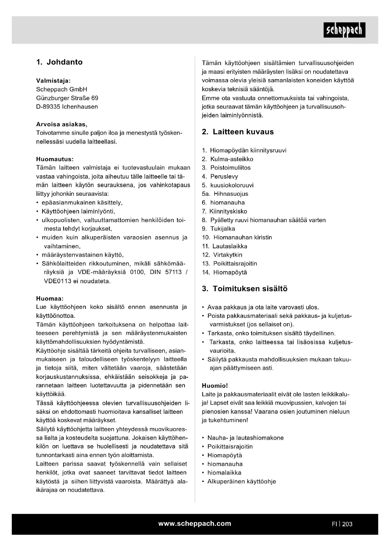 Valmistaja: Scheppach GmbH Günzburger Straße 69 D-89335 Ichenhausen Arvoisa asiakas, Toivotamme sinulle paljon iloa ja menestystä työsken- nellessäsi uudella laitteellasi. Huomautus: Tämän laitteen valmistaja ei tuotevastuulain mukaan vastaa vahingoista, joita aiheutuu tälle laitteelle tai tä- män laitteen käytön seurauksena, jos vahinkotapaus liittyy johonkin seuraavista: