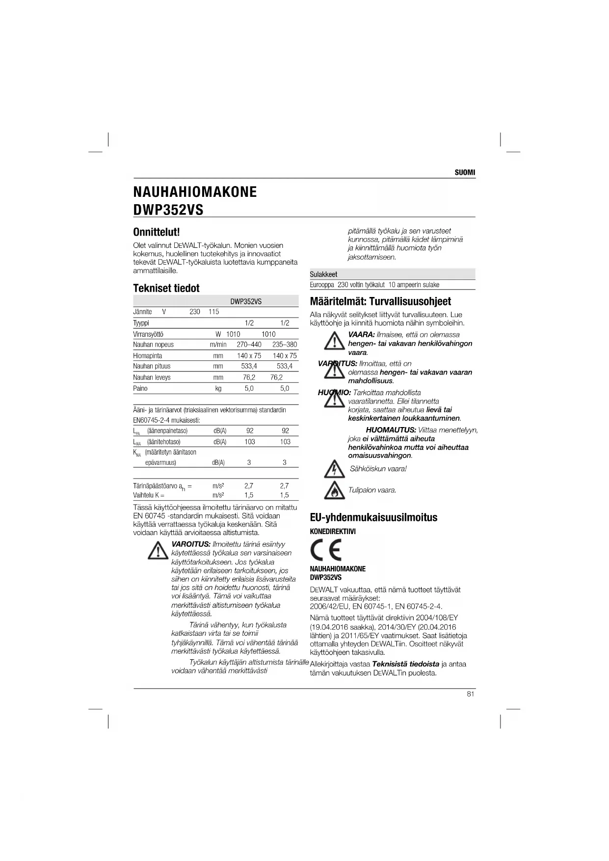 liikkeillä. Anna hiomakoneen tehdä työ.88 SUOMI vain vedellä ja miedolla pesuaineella kostutettua kangasta. Älä päästä mitään nestettä laitteen sisään. Älä upota mitään laitteen osaa nesteeseen. Lisävarusteet VAROITUS: Muita kuin DEWALT- lisävarusteita ei ole testattu tämän työkalun kanssa, joten niiden käyttäminen voi olla vaarallista. Käytä tämän laitteen kanssa vain DEWALTin suosittelemia varusteita vahingoittumisvaaran vähentämiseksi. Saat lisätietoja jälleenmyyjältäsi. Ympäristön suojeleminen Toimita tämä laite kierrätykseen. Tätä tuotetta ei saa hävittää kotitalousjätteen mukana. Jos DEWALT-tuote on tullut elinkaarensa päähän tai jos et enää tarvitse sitä, älä hävitä sitä kotitalousjätteenä. Toimita se kierrätykseen. Kierrätykseen toimitetut käytetyt tuotteet ja pakkaus voidaan käyttää uudelleen. Tämä suojelee ympäristöä ja vähentää raaka-aineiden tarvetta. Paikallisissa määräyksissä voidaan edellyttää, että sähkölaitteet on toimitettava kierrätysasemalle tai jälleenmyyjälle, jolta ostit uuden tuotteen. DEWALT kierrättää DEWALT-tuotteet, kun ne ovat tulleet elinkaarensa päähän. Voit käyttää tätä palvelua palauttamalla tuotteen valtuutettuun huoltokorjaamoon. Se toimitetaan sieltä meille. Saat lähimmän valtuutetun DEWALT- huoltokorjaamon tiedot ottamalla yhteyden lähimpään DEWALT-toimipisteeseen. Yhteystiedot ovat tässä käyttöohjeessa. Luettelo valtuutetuista DEWALT-huoltokorjaamoista ja myynnin jälkeisestä palvelusta on Internet-sivustossa www.2helpU. com.89 SVENSKA utföra sitt arbete. Detta kan avsevärt minska exponeringsnivån under hela dess arbetstid. Identifiera ytterligare säkerhetsåtgärder för att skydda handhavaren mot verkningarna av vibration, såsom att: underhålla verktyget och tillbehören, hålla händerna varma, organisera arbetsgången. Säkringar Europa 230 Volt verktyg 10 Ampere, starkström Defi nitioner: Säkerhetsriktlinjer Nedanstående definitioner beskriver allvarlighetsnivån för varje signalord. Var god läs handboken och uppmärksamma dessa symboler. FARA: Indikerar en omedelbart riskfylld situation som, om den inte undviks, kommer att resultera i dödsfall eller allvarlig personskada. VARNING: Indikerar en potentiellt riskfylld situation som, om den inte undviks, skulle kunna resultera i dödsfall eller allvarlig personskada. SE UPP! Indikerar en potentiellt riskfylld situation som, om den inte undviks, kan resultera i mindre eller medelmåttig personskada. OBSERVERA: Anger en praxis som inte är relaterad till personskada som, om den inte undviks, skulle kunna resultera i egendomsskada. Anger risk för elektrisk stöt. Anger risk för eldsvåda. EC-Följsamhetsdeklaration MASKINDIREKTIV BANDSLIPMASKIN DWP352VS DEWALT deklarerar att dessa produkter, beskrivna under Tekniska data uppfyller: 2006/42/EC, EN 60745-1, EN 60745-2-4. Gratulerar! Du har valt ett DEWALT-verktyg. År av erfarenhet, grundlig produktutveckling och innovation gör DEWALT till en av de pålitligaste partnerna för fackmannamässiga elverktygs-användare. Tekniska data DWP352VS Spänning V 230 115 Typ 1/2 1/2 Strömförsörjning W 1010 1010 Bandhastighet m/min 270–440 235–380 Slipyta mm 140 x 75 140 x 75 Bandlängd mm 533,4 533,4 Bandbredd mm 76,2 76,2 Vikt kg 5,0 5,0 Buller- och vibrationsvärden (triax vektorsumma) i enlighet med EN60745-2-4: