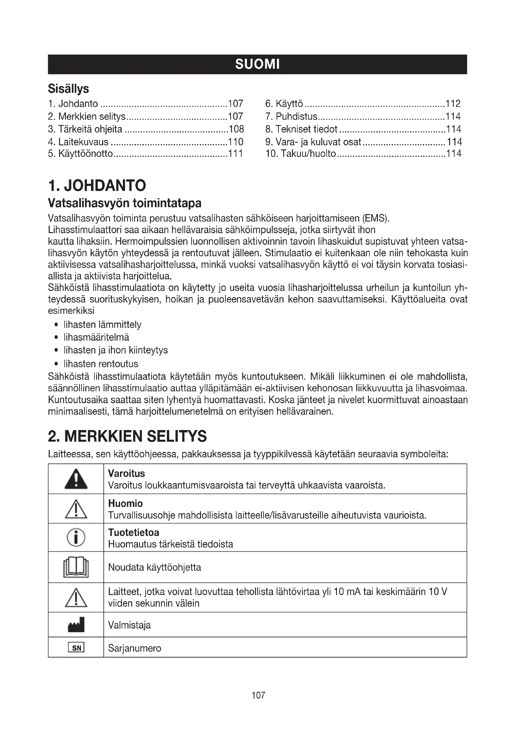 - Käytä laitteen kanssa ainoastaan mukana toimitettuja lisävarusteosia.109 Ohje Harvoissa tapauksissa iholla voi esiintyä ärsytystä elektrodien alueella. Asiaton käyttö