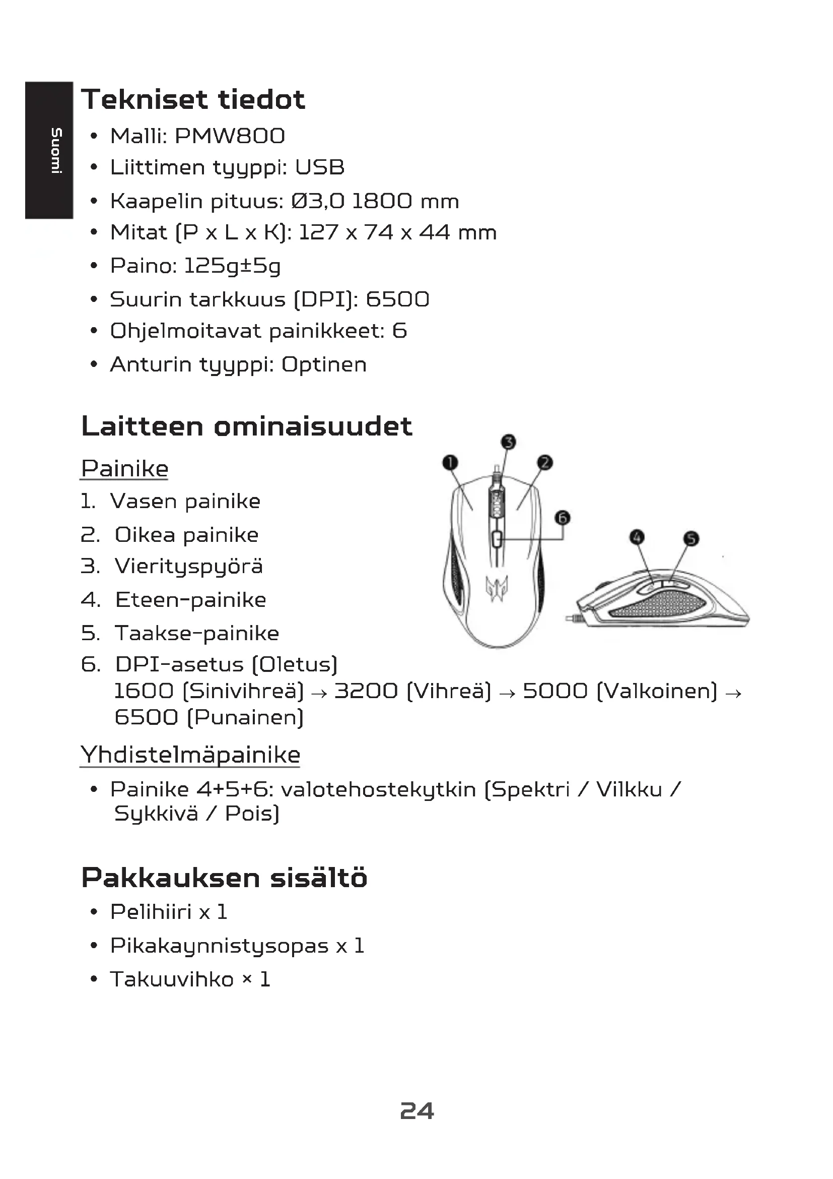 | Tekniset ominaisuudet | Optinen hiiri, PMW800-anturi, tarkkuus jopa 8000 DPI, 5 säädettävää DPI-tasoa |