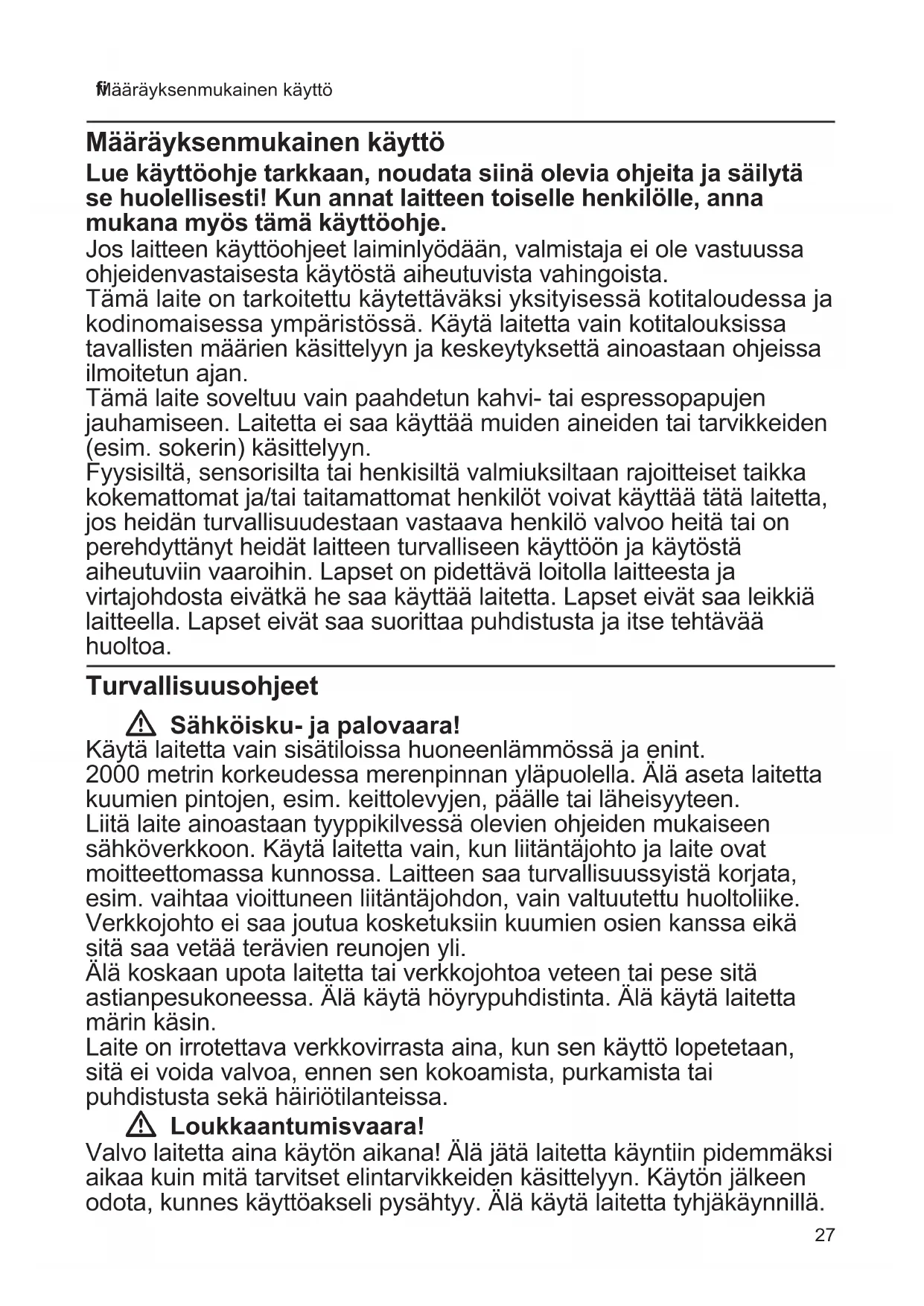 - Määräyksenmukainen käyttö Määräyksenmukainen käyttö Lue käyttöohje tarkkaan, noudata siinä olevia ohjeita ja säilytä se huolellisesti! Kun annat laitteen toiselle henkilölle, anna mukana myös tämä käyttöohje. Jos laitteen käyttöohjeet laiminlyödään, valmistaja ei ole vastuussa ohjeidenvastaisesta käytöstä aiheutuvista vahingoista. Tämä laite on tarkoitettu käytettäväksi yksityisessä kotitaloudessa ja kodinomaisessa ympäristössä. Käytä laitetta vain kotitalouksissa tavallisten määrien käsittelyyn ja keskeytyksettä ainoastaan ohjeissa ilmoitetun ajan. Tämä laite soveltuu vain paahdetun kahvi- tai espressopapujen jauhamiseen. Laitetta ei saa käyttää muiden aineiden tai tarvikkeiden (esim. sokerin) käsittelyyn. Fyysisiltä, sensorisilta tai henkisiltä valmiuksiltaan rajoitteiset taikka kokemattomat ja/tai taitamattomat henkilöt voivat käyttää tätä laitetta, jos heidän turvallisuudestaan vastaava henkilö valvoo heitä tai on perehdyttänyt heidät laitteen turvalliseen käyttöön ja käytöstä aiheutuviin vaaroihin. Lapset on pidettävä loitolla laitteesta ja virtajohdosta eivätkä he saa käyttää laitetta. Lapset eivät saa leikkiä laitteella. Lapset eivät saa suorittaa puhdistusta ja itse tehtävää huoltoa. Turvallisuusohjeet W Sähköisku- ja palovaara! Käytä laitetta vain sisätiloissa huoneenlämmössä ja enint. 2000 metrin korkeudessa merenpinnan yläpuolella. Älä aseta laitetta kuumien pintojen, esim. keittolevyjen, päälle tai läheisyyteen. Liitä laite ainoastaan tyyppikilvessä olevien ohjeiden mukaiseen sähköverkkoon. Käytä laitetta vain, kun liitäntäjohto ja laite ovat moitteettomassa kunnossa. Laitteen saa turvallisuussyistä korjata, esim. vaihtaa vioittuneen liitäntäjohdon, vain valtuutettu huoltoliike. Verkkojohto ei saa joutua kosketuksiin kuumien osien kanssa eikä sitä saa vetää terävien reunojen yli. Älä koskaan upota laitetta tai verkkojohtoa veteen tai pese sitä astianpesukoneessa. Älä käytä höyrypuhdistinta. Älä käytä laitetta märin käsin. Laite on irrotettava verkkovirrasta aina, kun sen käyttö lopetetaan, sitä ei voida valvoa, ennen sen kokoamista, purkamista tai puhdistusta sekä häiriötilanteissa. W Loukkaantumisvaara! Valvo laitetta aina käytön aikana! Älä jätä laitetta käyntiin pidemmäksi aikaa kuin mitä tarvitset elintarvikkeiden käsittelyyn. Käytön jälkeen odota, kunnes käyttöakseli pysähtyy. Älä käytä laitetta tyhjäkäynnillä.28 Turvallisuusohjeet W Tärkeää! Jos laitetta on käytetty kolme kertaa ilman taukoa, on pidettävä noin tunnin tauko. Laite on ehdottomasti puhdistettava ohjeiden mukaan aina käytön jälkeen tai kun sitä ei ole käytetty pitkään aikaan. X ”Puhdistus ja hoito” katso sivu 28 Onneksi olkoon, valintasi on Bosch. Lisätietoja tuotteistamme löydät internet-sivuiltamme. Sisältö Määräyksenmukainen käyttö p. 27