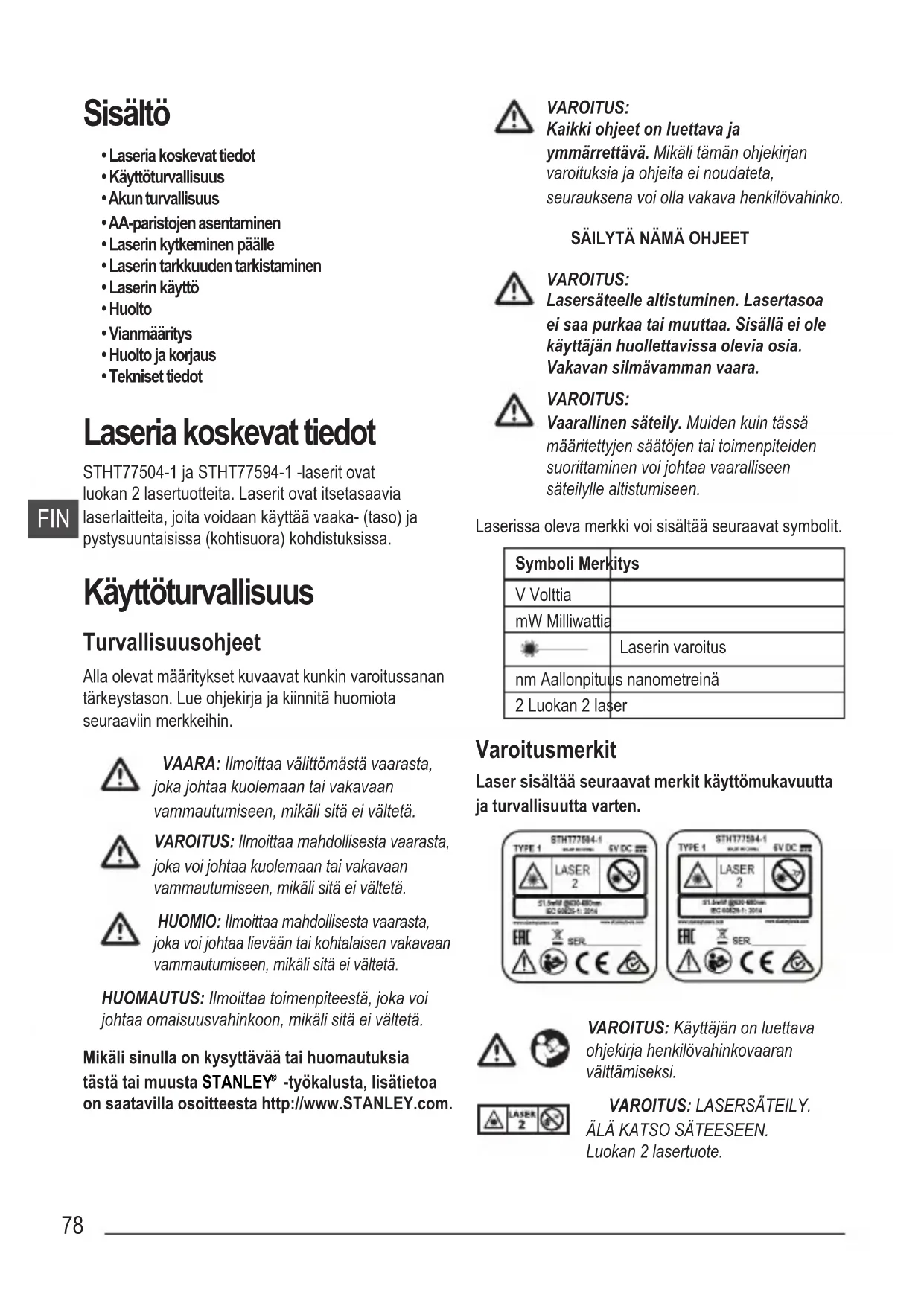 - Tekniset tiedot Laseria koskevat tiedot STHT77504-1 ja STHT77594-1 -laserit ovat luokan 2 lasertuotteita. Laserit ovat itsetasaavia laserlaitteita, joita voidaan käyttää vaaka- (taso) ja pystysuuntaisissa (kohtisuora) kohdistuksissa. Käyttöturvallisuus Turvallisuusohjeet Alla olevat määritykset kuvaavat kunkin varoitussanan tärkeystason. Lue ohjekirja ja kiinnitä huomiota seuraaviin merkkeihin. VAARA: Ilmoittaa välittömästä vaarasta, joka johtaa kuolemaan tai vakavaan vammautumiseen, mikäli sitä ei vältetä. VAROITUS: Ilmoittaa mahdollisesta vaarasta, joka voi johtaa kuolemaan tai vakavaan vammautumiseen, mikäli sitä ei vältetä. HUOMIO: Ilmoittaa mahdollisesta vaarasta, joka voi johtaa lievään tai kohtalaisen vakavaan vammautumiseen, mikäli sitä ei vältetä. HUOMAUTUS: Ilmoittaa toimenpiteestä, joka voi johtaa omaisuusvahinkoon, mikäli sitä ei vältetä. Mikäli sinulla on kysyttävää tai huomautuksia tästä tai muusta STANLEY
