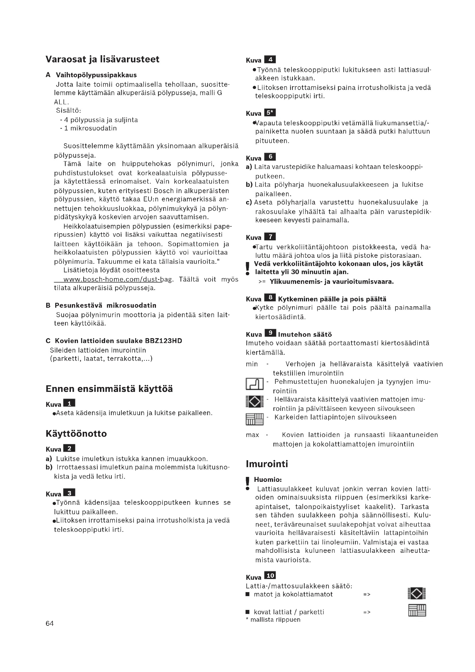 Vaihtopölypussipakkaus Jotta laite toimii optimaalisella tehollaan, suositte- lemme käyttämään alkuperäisiä pölypusseja, malli G ALL. Sisältö: - 4 pölypussia ja suljinta - 1 mikrosuodatin Suosittelemme käyttämään yksinomaan alkuperäisiä pölypusseja. Tämä laite on huipputehokas pölynimuri, jonka puhdistustulokset ovat korkealaatuisia pölypusse- ja käytettäessä erinomaiset. Vain korkealaatuisten pölypussien, kuten erityisesti Bosch in alkuperäisten pölypussien, käyttö takaa EU:n energiamerkissä an- nettujen tehokkuusluokkaa, pölynimukykyä ja pölyn- pidätyskykyä koskevien arvojen saavuttamisen. Heikkolaatuisempien pölypussien (esimerkiksi pape- ripussien) käyttö voi lisäksi vaikuttaa negatiivisesti laitteen käyttöikään ja tehoon. Sopimattomien ja heikkolaatuisten pölypussien käyttö voi vaurioittaa pölynimuria. Takuumme ei kata tällaisia vaurioita." Lisätietoja löydät osoitteesta www.bosch-home.com/dust-bag. Täältä voit myös tilata alkuperäisiä pölypusseja. B Pesunkestävä mikrosuodatin Suojaa pölynimurin moottoria ja pidentää siten lait- teen käyttöikää. C Kovien lattioiden suulake BBZ123HD Sileiden lattioiden imurointiin (parketti, laatat, terrakotta,...) Ennen ensimmäistä käyttöä Kuva