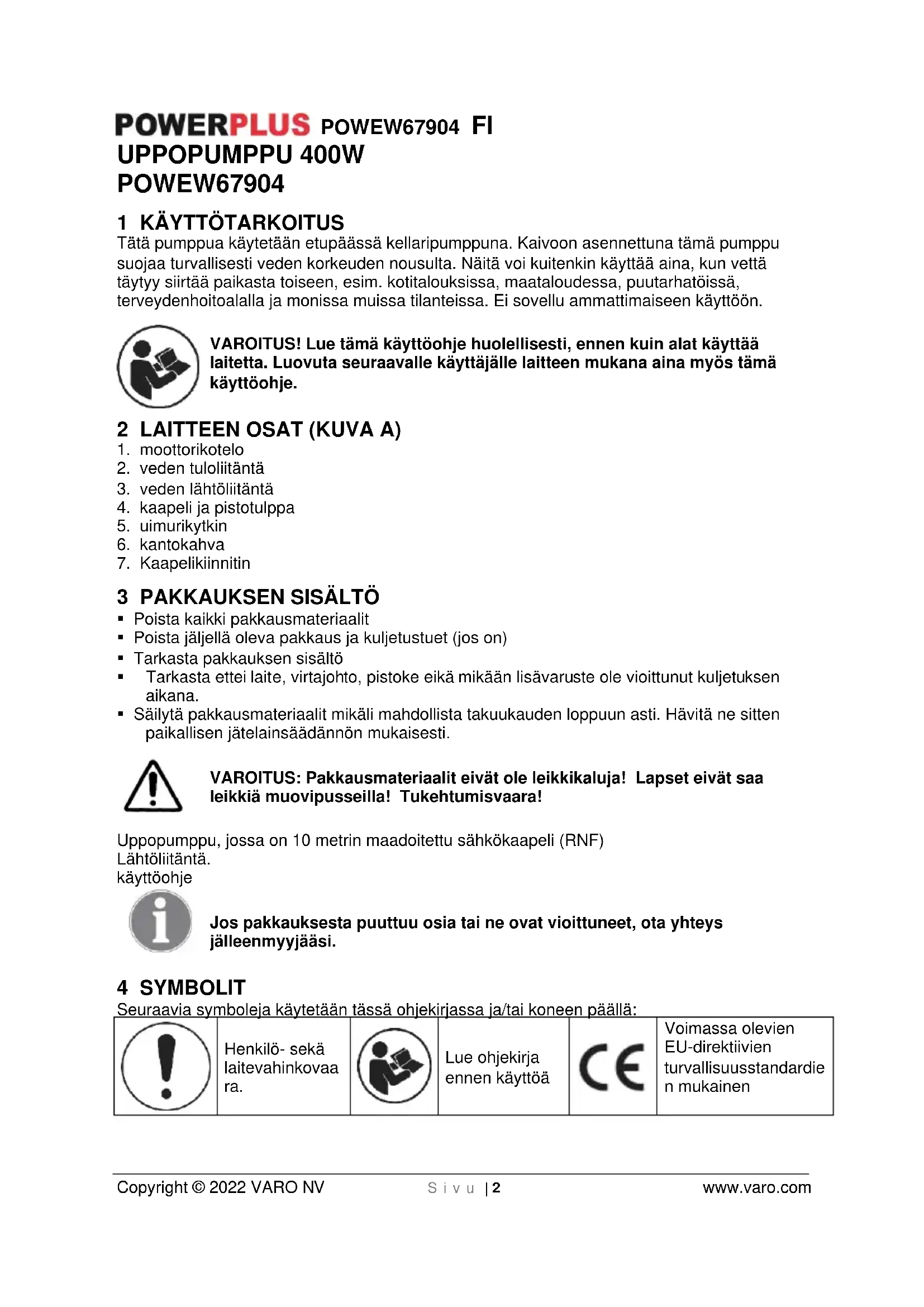 Jos joudut poistamaan laitteen käytöstä pitkäaikaisen käytön jälkeen, älä hävitä sitä tavallisen kotitalousjätteen mukana, vaan huolehdi sen hävittämisestä ympäristöä suojaavalla tavalla. Sähkölaitteiden tuottamia jätteitä ei saa käsitellä tavallisten kotitalousjätteiden tapaan. Vie ne kierrätettäväksi asianmukaiseen paikkaan. Kysy neuvoa kierrätyksestä paikallisilta viranomaisilta tai jälleenmyyjältä.POWEW67904 FI Copyright © 2022 VARO NV S i v u | 8 www.varo.com 16 YHDENMUKAISUUSILMOITUS VARO – Vic. Van Rompuy N.V. - Joseph Van Instraat 9 - BE2500 Lier - BELGIA ilmoittaa, että Tuote: uppopumppu 400W Tavaramerkki: POWERplus Malli: POWEW67904 on yhdenmukaistettuihin eurooppalaisiin standardien soveltamiseen perustuvien sovellettavien eurooppalaisten direktiivien olennaisten vaatimusten ja muiden asiaankuuluvien säännösten mukainen. Laitteen luvaton muokkaaminen johtaa tämän vakuutuksen mitätöitymiseen. Euroopan yhteisön direktiivit (sekä niiden mahdolliset muutokset allekirjoituspäivään saakka): 2011/65/EU 2014/35/EU 2014/30/EU Eurooppalaiset yhdenmukaistetut standardit (sekä niiden mahdolliset muutokset allekirjoituspäivään saakka): EN60335-1 : 2012 EN60335-2-41: 2003 EN55014-1 : 2017 EN55014-2 : 2015