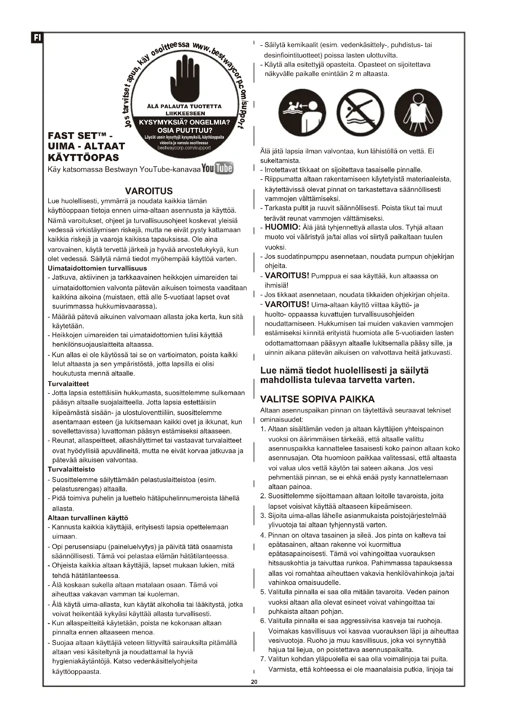 Käy katsomassa Bestwayn YouTube-kanavaa ÄLÄ PALAUTA TUOTETTALIIKKEESEENKYSYMYKSIÄ? ONGELMIA?OSIA PUUTTUU?Löydät usein kysyttyjä kysymyksiä, käyttöoppaitavideoita ja varosia osoitteessa bestwaycorp.com/support