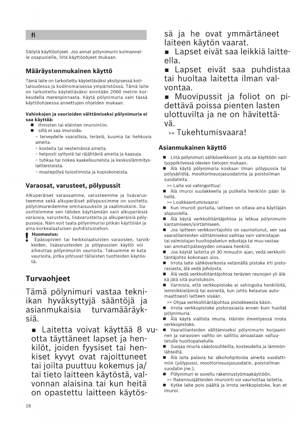 sä ja he ovat ymmärtäneet laiteen käytön vaarat. Lapset eivät saa leikkiä laitte- ella. Lapset eivät saa puhdistaa tai huoltaa laitetta ilman val- vontaa. Muovipussit ja foliot on pi- dettävä poissa pienten lasten ulottuvilta ja ne on hävitettä- vä. >= Tukehtumisvaara! Asianmukainen käyttö Liitä pölynimuri sähköverkkoon ja ota se käyttöön vain tyyppikilvessä olevien tietojen mukaan. Älä käytä pölynimuria koskaan ilman pölypussia tai pölysäiliötä, moottorinsuojasuodatinta ja poistoilman suodatinta. >= Laite voi vahingoittua! Älä imuroi suulakkeella ja putkella henkilön pään lä-hellä. >= Loukkaantumisvaara! Kun imuroit portaita, laitteen on oltava aina käyttäjän alapuolella. Älä käytä verkkoliitäntäjohtoa ja letkua pölynimurin kantamiseen/siirtämiseen. Jos laitteen verkkovirtajohto on vaurioitunut, sen saa vaaratilanteiden välttämiseksi vaihtaa vain valmistajan tai valmistajan huoltopalvelun edustaja tai muu vastaa-van ammattipätevyyden omaava henkilö. Jos käytät laitetta yli 30 minuutin ajan, vedä verkkolii-täntäjohto kokonaan ulos. Irrota laite sähköverkosta vetämällä pistoke irti pisto-rasiasta, älä vedä johdosta. Älä vedä verkkoliitäntäjohtoa terävien reunojen yli älä-kä jätä sitä puristuksiin. Varmista, että verkkopistoke ei vahingoita henkilöitä, lemmikkieläimiä tai esineitä, kun johto kelautuu auto-maattisesti laitteen sisään. >= Ohjaa verkkoliitäntäjohtoa pistokkeesta käsin. Irrota verkkopistoke pistorasiasta ennen kuin huollat pölynimuria. Älä käytä viallista imuria. Häiriön ilmentyessä irrota verkkopistoke. Vaaratilanteiden välttämiseksi pölynimurin korjaami-nen ja varaosien vaihto on sallittu ainoastaan valtuu-tetulle huoltopalvelulle. Suojaa imuria sääolosuhteilta, kosteudelta ja lämmön-lähteiltä. Älä laita palavia tai alkoholipitoisia aineita suodatti-miin (pölypussi, moottorinsuojasuodatin, poistoilman suodatin jne.). Pölynimuri ei sovellu rakennustyömaakäyttöön.>= Rakennusjätteiden imurointi voi vaurioittaa laitetta. Kytke laite pois päältä ja irrota verkkopistoke, kun et imuroi.17 Käytöstä poistetut laitteet tulee tehdä heti käyttökel- vottomiksi ja hävittää määräysten mukaisesti.