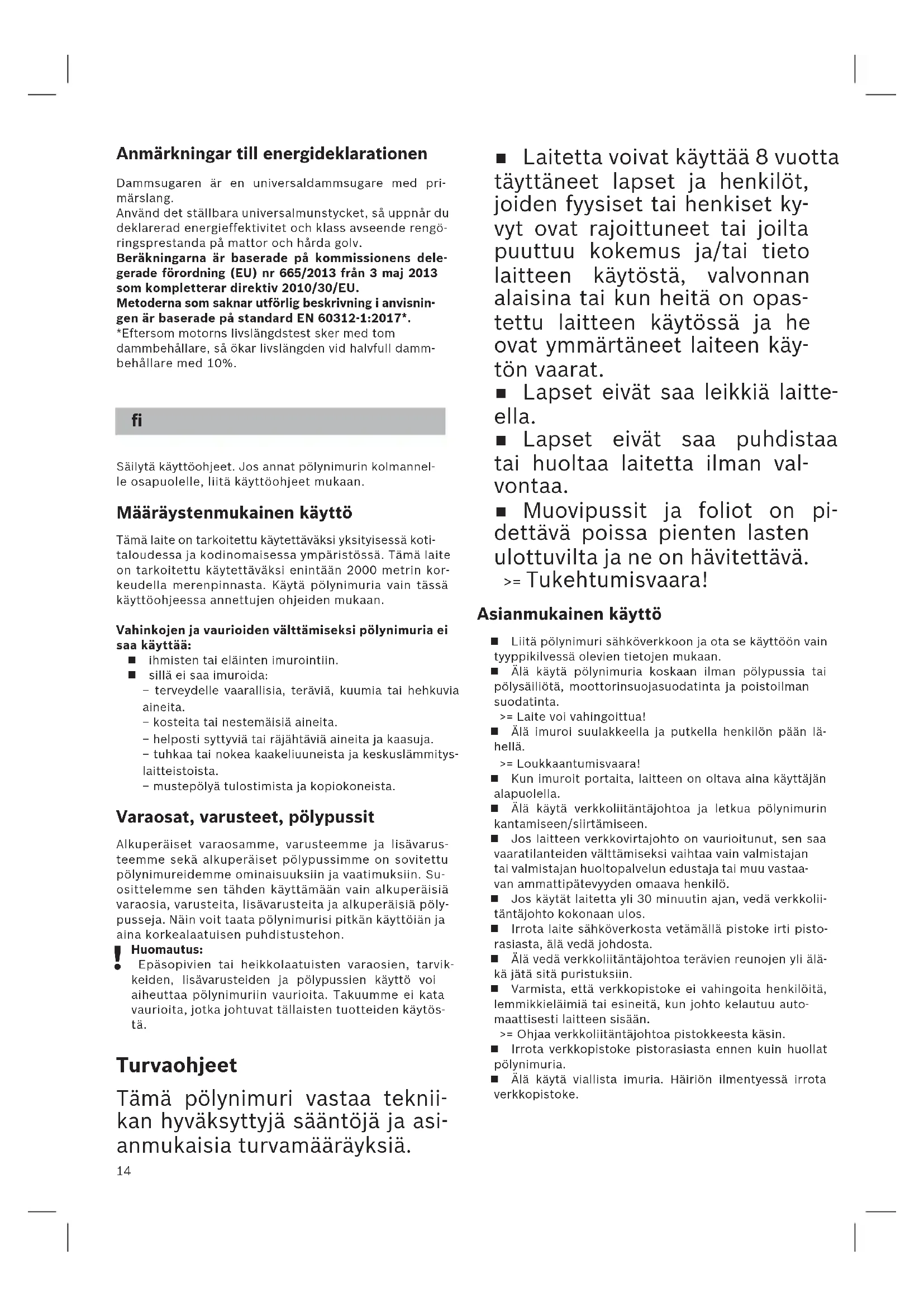 Laitetta voivat käyttää 8 vuotta täyttäneet lapset ja henkilöt, joiden fyysiset tai henkiset ky- vyt ovat rajoittuneet tai joilta puuttuu kokemus ja/tai tieto laitteen käytöstä, valvonnan alaisina tai kun heitä on opas- tettu laitteen käytössä ja he ovat ymmärtäneet laiteen käy- tön vaarat. Lapset eivät saa leikkiä laitte- ella. Lapset eivät saa puhdistaa tai huoltaa laitetta ilman val- vontaa. Muovipussit ja foliot on pi- dettävä poissa pienten lasten ulottuvilta ja ne on hävitettävä. >= Tukehtumisvaara! Asianmukainen käyttö Liitä pölynimuri sähköverkkoon ja ota se käyttöön vain tyyppikilvessä olevien tietojen mukaan. Älä käytä pölynimuria koskaan ilman pölypussia tai pölysäiliötä, moottorinsuojasuodatinta ja poistoilman suodatinta. >= Laite voi vahingoittua! Älä imuroi suulakkeella ja putkella henkilön pään lä-hellä. >= Loukkaantumisvaara! Kun imuroit portaita, laitteen on oltava aina käyttäjän alapuolella. Älä käytä verkkoliitäntäjohtoa ja letkua pölynimurin kantamiseen/siirtämiseen. Jos laitteen verkkovirtajohto on vaurioitunut, sen saa vaaratilanteiden välttämiseksi vaihtaa vain valmistajan tai valmistajan huoltopalvelun edustaja tai muu vastaa-van ammattipätevyyden omaava henkilö. Jos käytät laitetta yli 30 minuutin ajan, vedä verkkolii-täntäjohto kokonaan ulos. Irrota laite sähköverkosta vetämällä pistoke irti pisto-rasiasta, älä vedä johdosta. Älä vedä verkkoliitäntäjohtoa terävien reunojen yli älä-kä jätä sitä puristuksiin. Varmista, että verkkopistoke ei vahingoita henkilöitä, lemmikkieläimiä tai esineitä, kun johto kelautuu auto-maattisesti laitteen sisään. >= Ohjaa verkkoliitäntäjohtoa pistokkeesta käsin. Irrota verkkopistoke pistorasiasta ennen kuin huollat pölynimuria. Älä käytä viallista imuria. Häiriön ilmentyessä irrota verkkopistoke.15 Vaaratilanteiden välttämiseksi pölynimurin korjaami- nen ja varaosien vaihto on sallittu ainoastaan valtuu- tetulle huoltopalvelulle. Suojaa imuria sääolosuhteilta, kosteudelta ja lämmön- lähteiltä. Älä laita palavia tai alkoholipitoisia aineita suodatti- miin (pölypussi, moottorinsuojasuodatin, poistoilman suodatin jne.). Pölynimuri ei sovellu rakennustyömaakäyttöön. >= Rakennusjätteiden imurointi voi vaurioittaa laitetta. Kytke laite pois päältä ja irrota verkkopistoke, kun et imuroi. Käytöstä poistetut laitteet tulee tehdä heti käyttökel- vottomiksi ja hävittää määräysten mukaisesti.
