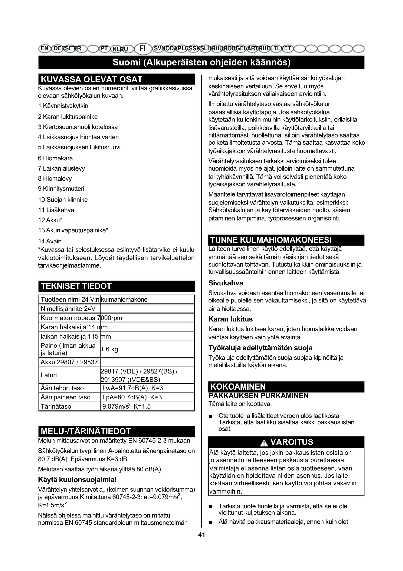 Kuvassa olevien osien numerointi viittaa graikkasivussa olevaan sähkötyökalun kuvaan. 1 Käynnistyskytkin 2 Karan lukituspainike 3 Kiertosuuntanuoli kotelossa 4 Laikkasuojus hiontaa varten 5 Laikkasuojuksen lukitusruuvi 6 Hiomakara 7 Laikan aluslevy 8 Hiomalevy 9 Kiinnitysmutteri 10 Suojan kiinnike 11 Lisäkahva 12 Akku* 13 Akun vapautuspainike* 14 Avain *Kuvassa tai selostuksessa esiintyvä lisätarvike ei kuulu vakiotoimitukseen. Löydät täydellisen tarvikeluettelon tarvikeohjelmastamme. TEKNISET TIEDOT Tuotteen nimi 24 V:n kulmahiomakone Nimellisjännite 24V Kuormaton nopeus 7000rpm Karan halkaisija 14 mm laikan halkaisija 115 mm Paino (ilman akkua ja laturia)