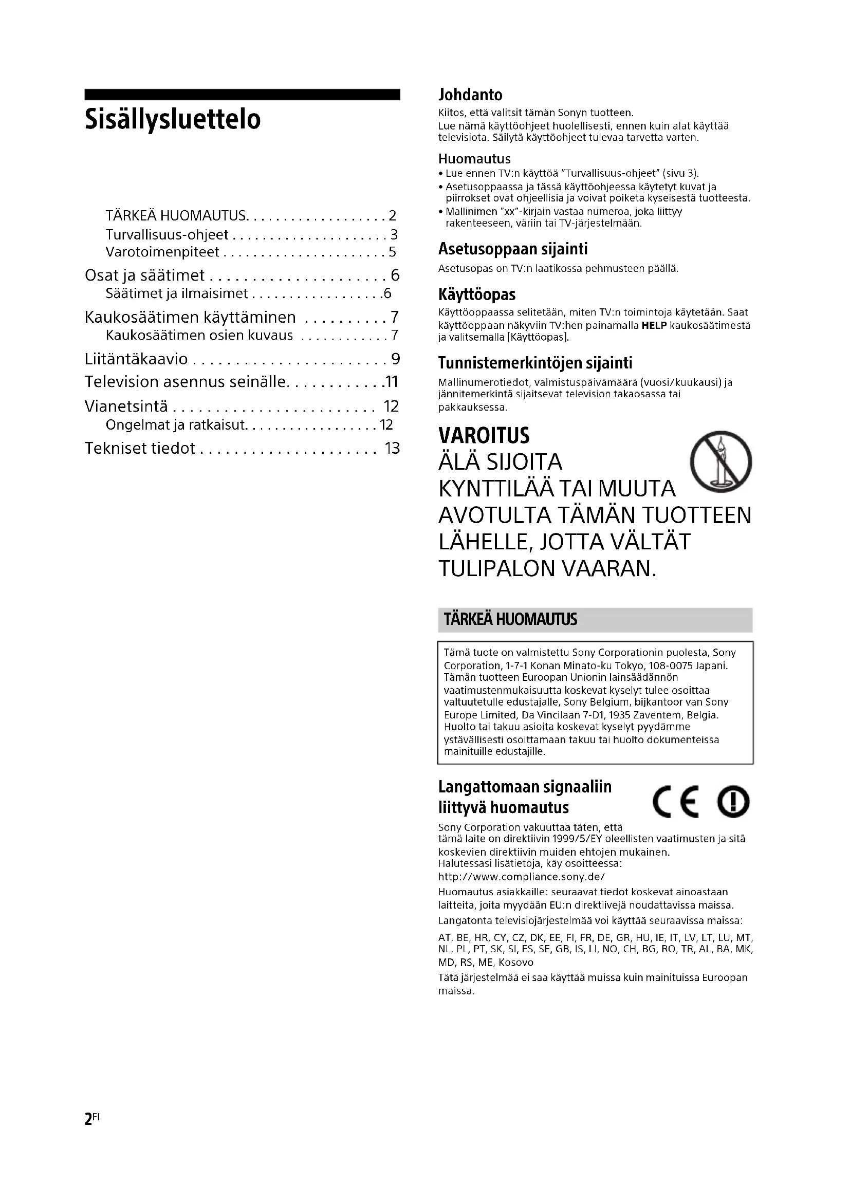 TULIPALON VAARAN. Langattomaan signaaliin liittyvä huomautus Sony Corporation vakuuttaa täten, että tämä laite on direktiivin 1999/5/EY oleellisten vaatimusten ja sitä koskevien direktiivin muiden ehtojen mukainen.Halutessasi lisätietoja, käy osoitteessa:http://www.compliance.sony.de/Huomautus asiakkaille: seuraavat tiedot koskevat ainoastaan laitteita, joita myydään EU:n direktiivejä noudattavissa maissa.Langatonta televisiojärjestelmää voi käyttää seuraavissa maissa: AT, BE, HR, CY, CZ, DK, EE, FI, FR, DE, GR, HU, IE, IT, LV, LT, LU, MT, NL, PL, PT, SK, SI, ES, SE, GB, IS, LI, NO, CH, BG, RO, TR, AL, BA, MK, MD, RS, ME, KosovoTätä järjestelmää ei saa käyttää muissa kuin mainituissa Euroopan maissa.