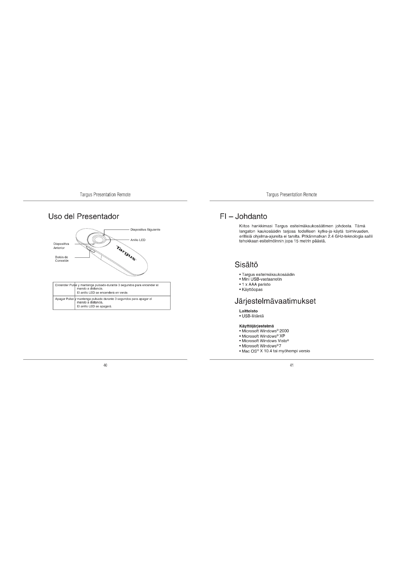 FI – Johdanto Kiitos hankkimasi Targus esitelmäkaukosäätimen johdosta. Tämä langaton kaukosäädin tarjoaa todellisen kytke-ja-käytä toimivuuden, erillisiä ohjelma-ajureita ei tarvita. Pitkänmatkan 2.4 GHz-teknologia sallii tehokkaan esitelmöinnin jopa 15 metrin päästä. Järjestelmävaatimukset Laitteisto