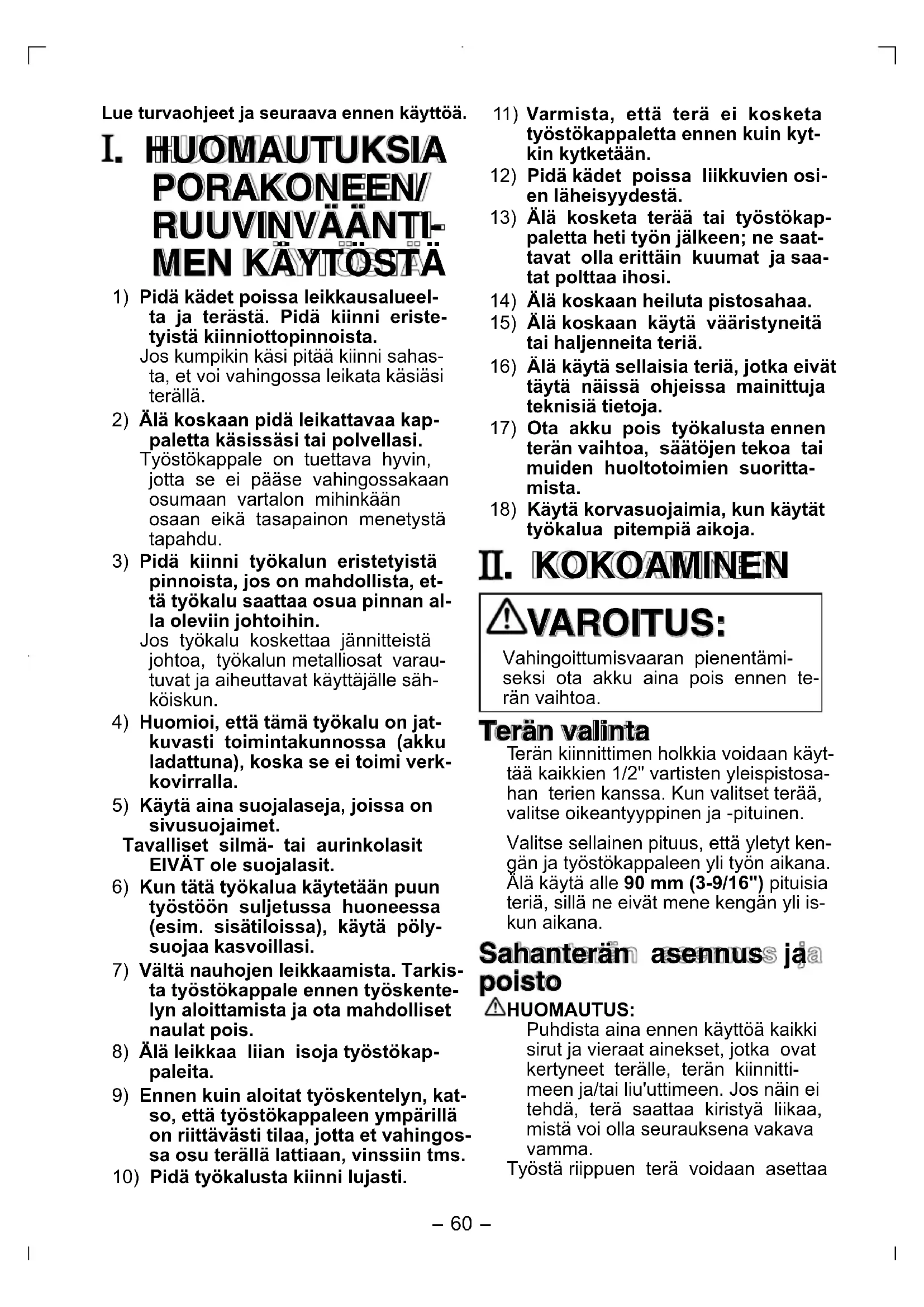 Lue turvaohjeet ja seuraava ennen käyttöä. . HUOMAUTUKSIA PORAKONEEN/ RUUVINVÄÄNTI-