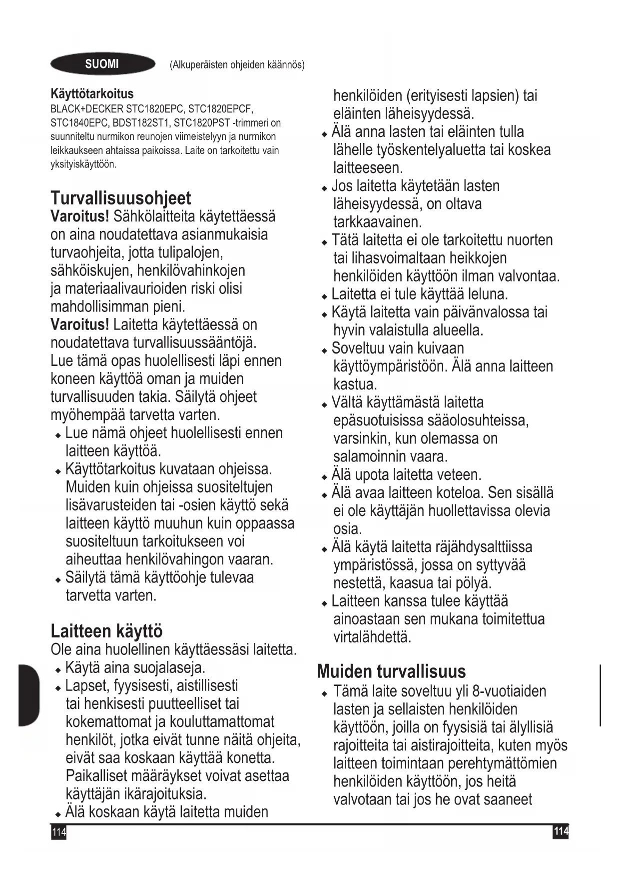Käyttötarkoitus BLACK+DECKER STC1820EPC, STC1820EPCF, STC1840EPC, BDST182ST1, STC1820PST -trimmeri on suunniteltu nurmikon reunojen viimeistelyyn ja nurmikon leikkaukseen ahtaissa paikoissa. Laite on tarkoitettu vain yksityiskäyttöön. Turvallisuusohjeet Varoitus! Sähkölaitteita käytettäessä on aina noudatettava asianmukaisia turvaohjeita, jotta tulipalojen, sähköiskujen, henkilövahinkojen ja materiaalivaurioiden riski olisi mahdollisimman pieni. Varoitus! Laitetta käytettäessä on noudatettava turvallisuussääntöjä. Lue tämä opas huolellisesti läpi ennen koneen käyttöä oman ja muiden turvallisuuden takia. Säilytä ohjeet myöhempää tarvetta varten. u Lue nämä ohjeet huolellisesti ennen laitteen käyttöä. u Käyttötarkoitus kuvataan ohjeissa. Muiden kuin ohjeissa suositeltujen lisävarusteiden tai -osien käyttö sekä laitteen käyttö muuhun kuin oppaassa suositeltuun tarkoitukseen voi aiheuttaa henkilövahingon vaaran. u Säilytä tämä käyttöohje tulevaa tarvetta varten. Laitteen käyttö Ole aina huolellinen käyttäessäsi laitetta. u Käytä aina suojalaseja.u Lapset, fyysisesti, aistillisesti tai henkisesti puutteelliset tai kokemattomat ja kouluttamattomat henkilöt, jotka eivät tunne näitä ohjeita, eivät saa koskaan käyttää konetta. Paikalliset määräykset voivat asettaa käyttäjän ikärajoituksia. u Älä koskaan käytä laitetta muiden henkilöiden (erityisesti lapsien) tai eläinten läheisyydessä. u Älä anna lasten tai eläinten tulla lähelle työskentelyaluetta tai koskea laitteeseen. u Jos laitetta käytetään lasten läheisyydessä, on oltava tarkkaavainen. u Tätä laitetta ei ole tarkoitettu nuorten tai lihasvoimaltaan heikkojen henkilöiden käyttöön ilman valvontaa. u Laitetta ei tule käyttää leluna.u Käytä laitetta vain päivänvalossa tai hyvin valaistulla alueella. u Soveltuu vain kuivaan käyttöympäristöön. Älä anna laitteen kastua. u Vältä käyttämästä laitetta epäsuotuisissa sääolosuhteissa, varsinkin, kun olemassa on salamoinnin vaara. u Älä upota laitetta veteen.u Älä avaa laitteen koteloa. Sen sisällä ei ole käyttäjän huollettavissa olevia osia. u Älä käytä laitetta räjähdysalttiissa ympäristössä, jossa on syttyvää nestettä, kaasua tai pölyä. u Laitteen kanssa tulee käyttää ainoastaan sen mukana toimitettua virtalähdettä. Muiden turvallisuus u Tämä laite soveltuu yli 8-vuotiaiden lasten ja sellaisten henkilöiden käyttöön, joilla on fyysisiä tai älyllisiä rajoitteita tai aistirajoitteita, kuten myös laitteen toimintaan perehtymättömien henkilöiden käyttöön, jos heitä valvotaan tai jos he ovat saaneet115 (Alkuperäisten ohjeiden käännös) SUOMI laitteen turvalliseen käyttöön liittyvää opastusta ja ymmärtävät laitteen käyttöön liittyvät vaarat. Älä anna lasten leikkiä laitteella. Puhdistus- ja huoltotöitä ei saa jättää lapsille ilman valvontaa. u Lapsia on valvottava ja heitä on estettävä leikkimästä laitteella. Muut riskit Myös muut kuin turvavaroituksissa mainitut riskit ovat mahdollisia työkalua käytettäessä. Nämä riskit voivat liittyä muun muassa virheelliseen tai pitkäaikaiseen käyttöön. Tiettyjä jäännösriskejä ei voi välttää, vaikka noudatat kaikkia turvamääräyksiä ja käytät turvalaitteita. Näitä ovat: u Pyörivien tai liikkuvien osien koskettamisen aiheuttamat vahingot. u Osia, teriä tai lisävarusteita vaihdettaessa aiheutuneet vahingot. u Työkalun pitkäaikaisen käytön aiheuttamat vahingot. Varmista, että pidät säännöllisesti taukoja työkalun pitkäaikaisen käytön aikana. u Kuulon heikkeneminen.u Työkalua käytettäessä (esimerkiksi puuta, erityisesti tammea, pyökkiä ja MDF-levyjä käsiteltäessä) syntyneen pölyn sisäänhengityksen aiheuttamat terveysriskit. Käytön jälkeen u Kun laitetta ei käytetä, säilytä sitä kuivassa, hyvin tuuletetussa paikassa poissa lasten ulottuvilta. u Pidä laite lasten ulottumattomissa.u Kun laitetta säilytetään tai kuljetetaan ajoneuvossa, sijoita se tavaratilaan tai kiinnitä se kunnolla, ettei se matkan aikana pääse liikkumaan. Tarkastus ja korjaus u Tarkista ennen laitteen käyttöä, ettei laitteessa ole vahingoittuneita tai viallisia osia. Tarkista osien ja kytkimien kunto sekä muut seikat, jotka voivat vaikuttaa laitteen toimintaan. u Älä käytä laitetta, jos jokin osa on vahingoittunut tai viallinen. u Korjauta tai vaihdata vaurioituneet tai vialliset osat valtuutetussa huoltoliikkeessä. u Älä yritä korjata tai vaihtaa muita kuin tässä käyttöohjeessa erikseen määriteltyjä osia. Tärinä Teknisissä tiedoissa ja vaatimustenmukaisuusilmoituksessa ilmoitetut tärinäpäästöarvot on mitattu standardin EN50636 testausmenetelmän mukaisesti, ja niiden avulla voidaan vertailla työkaluja keskenään. Ilmoitettua tärinäpäästöarvoa voidaan käyttää myös altistumisen alustavaan arviointiin. Varoitus! Sähkötyökalun käytön aikana mitattu todellinen tärinäpäästöarvo voi poiketa ilmoitetusta tärinäpäästöarvosta työkalun käyttötavan mukaan. Tärinätaso voi olla ilmoitettua tasoa suurempi. Kun tärinälle altistumista arvioidaan sen määrittämiseksi, mitä direktiivin 2002/44/ EY mukaisia turvatoimenpiteitä vaaditaan sähkötyökaluja säännöllisesti käyttävien henkilöiden suojelemiseksi, tärinälle altistumisen arvioinnissa on otettava huomioon todelliset käyttöolosuhteet ja116 (Alkuperäisten ohjeiden käännös) SUOMI työkalun käyttötavat. Todellisen käytön lisäksi on kiinnitettävä huomiota myös siihen, milloin työkalu on sammutettuna tai se käy tyhjäkäynnillä. Ruohotrimmereiden lisäturvaohjeet Varoitus! Leikkaavien osien pyöriminen jatkuu senkin jälkeen, kun moottori on sammutettu. u Tutustu hallintalaitteisiin ja opettele laitteen oikea käyttö. u Irrota akku aina laitteesta kun se jätetään ilman valvontaa, ennen tukoksen poistamista, ennen puhdistusta 