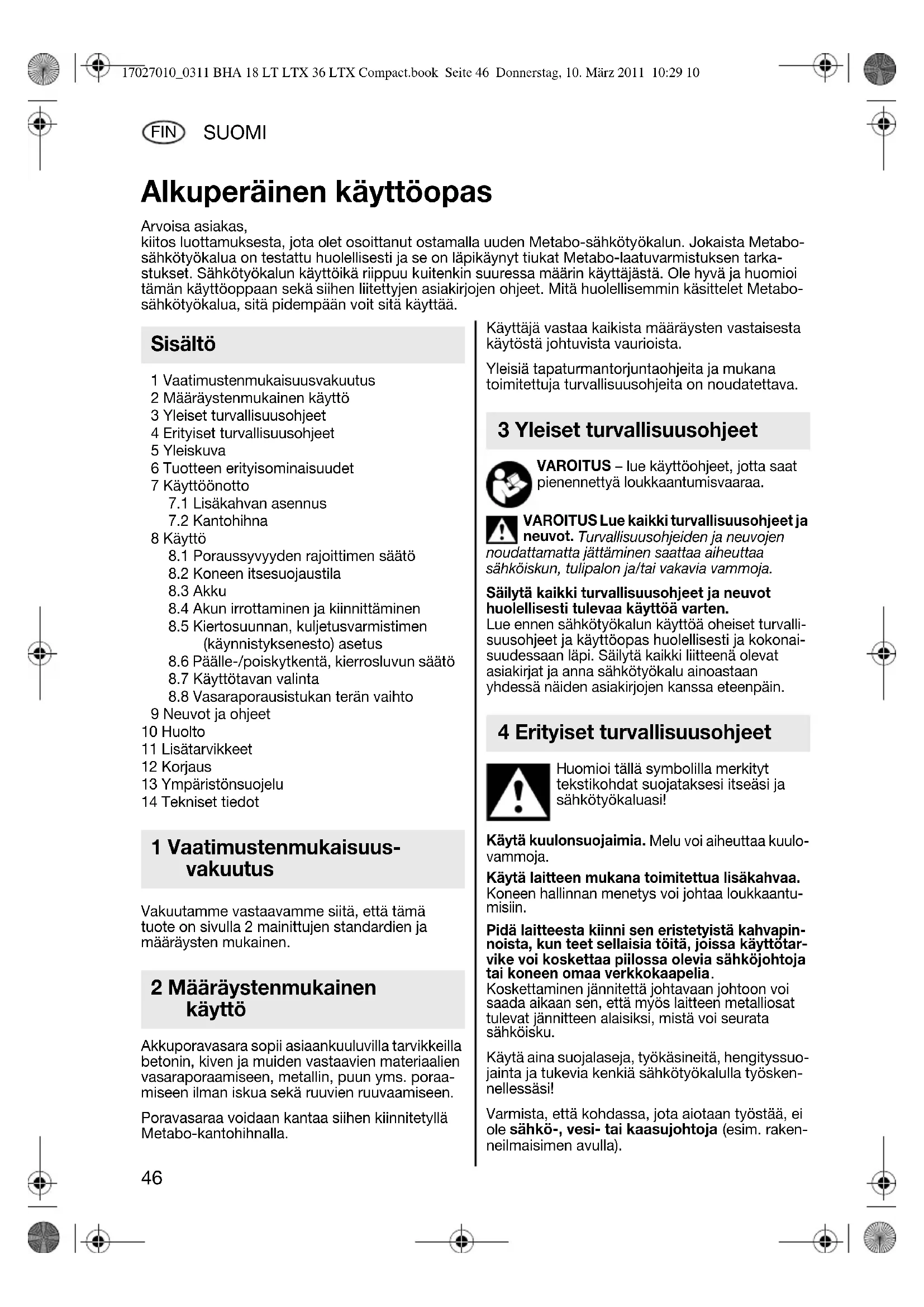 Koskettaminen jännitettä johtavaan johtoon voi saada aikaan sen, että myös laitteen metalliosat tulevat jännitteen alaisiksi, mistä voi seurata sähköisku. Käytä aina suojalaseja, työkäsineitä, hengityssuo- jainta ja tukevia kenkiä sähkötyökalulla työsken- nellessäsi! Varmista, että kohdassa, jota aiotaan työstää, ei ole sähkö-, vesi- tai kaasujohtoja (esim. raken- neilmaisimen avulla). Alkuperäinen käyttöopas Arvoisa asiakas, kiitos luottamuksesta, jota olet osoittanut ostamalla uuden Metabo-sähkötyökalun. Jokaista Metabo- sähkötyökalua on testattu huolellisesti ja se on läpikäynyt tiukat Metabo-laatuvarmistuksen tarka- stukset. Sähkötyökalun käyttöikä riippuu kuitenkin suuressa määrin käyttäjästä. Ole hyvä ja huomioi tämän käyttöoppaan sekä siihen liitettyjen asiakirjojen ohjeet. Mitä huolellisemmin käsittelet Metabo- sähkötyökalua, sitä pidempään voit sitä käyttää. Sisältö 1 Vaatimustenmukaisuus- vakuutus 2 Määräystenmukainen käyttö 3 Yleiset turvallisuusohjeet 4 Erityiset turvallisuusohjeet 17027010_0311 BHA 18 LT LTX 36 LTX Compact.book Seite 46 Donnerstag, 10. März 2011 10:29 10SUOMI