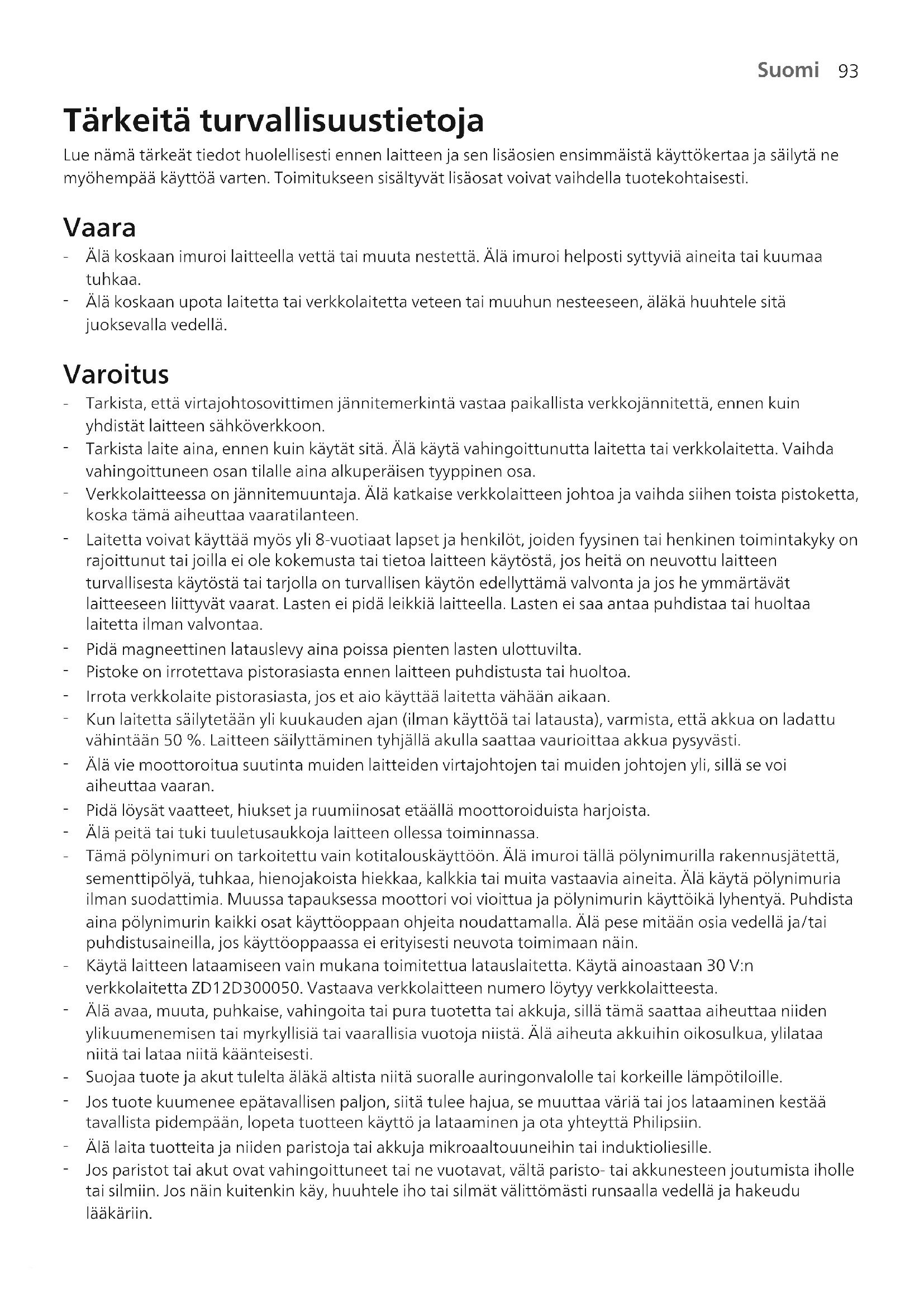 Älä koskaan imuroi laitteella vettä tai muuta nestettä. Älä imuroi helposti syttyviä aineita tai kuumaa tuhkaa.