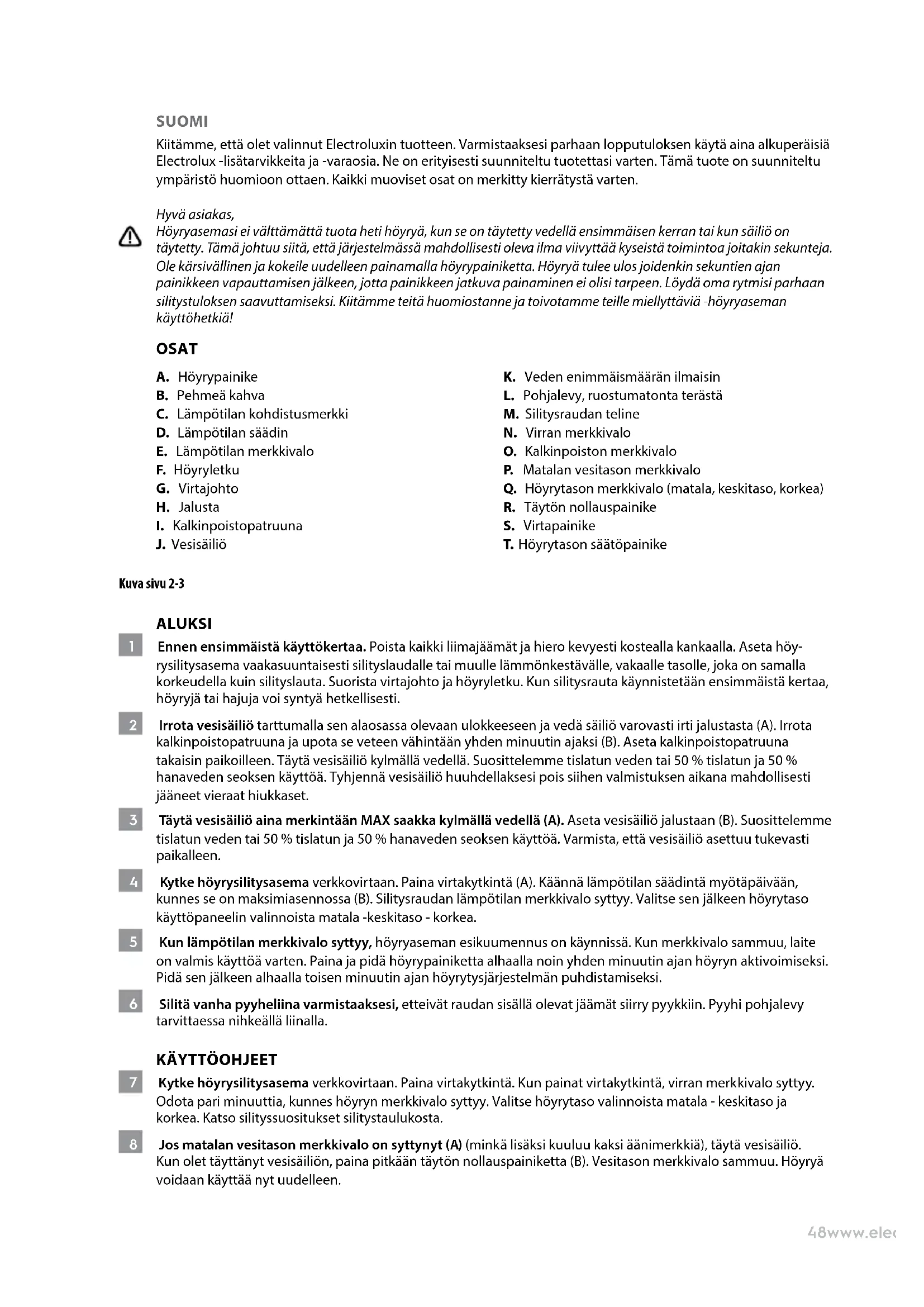 Kiitämme, etta olet valinnut Electroluxin tuotteen. Varmistaaksesi parhaan lopputuloksen käytä aina alkuperäisia Electrolux -lisātarvikkeita ja -varaosia. Ne on erityisesti suunniteltu tuotettasi varten. Tämä tuote on suunniteltu ymparistö huomioon ottan. Kaikki muoviset osat on merkitty kierrätstä varten.