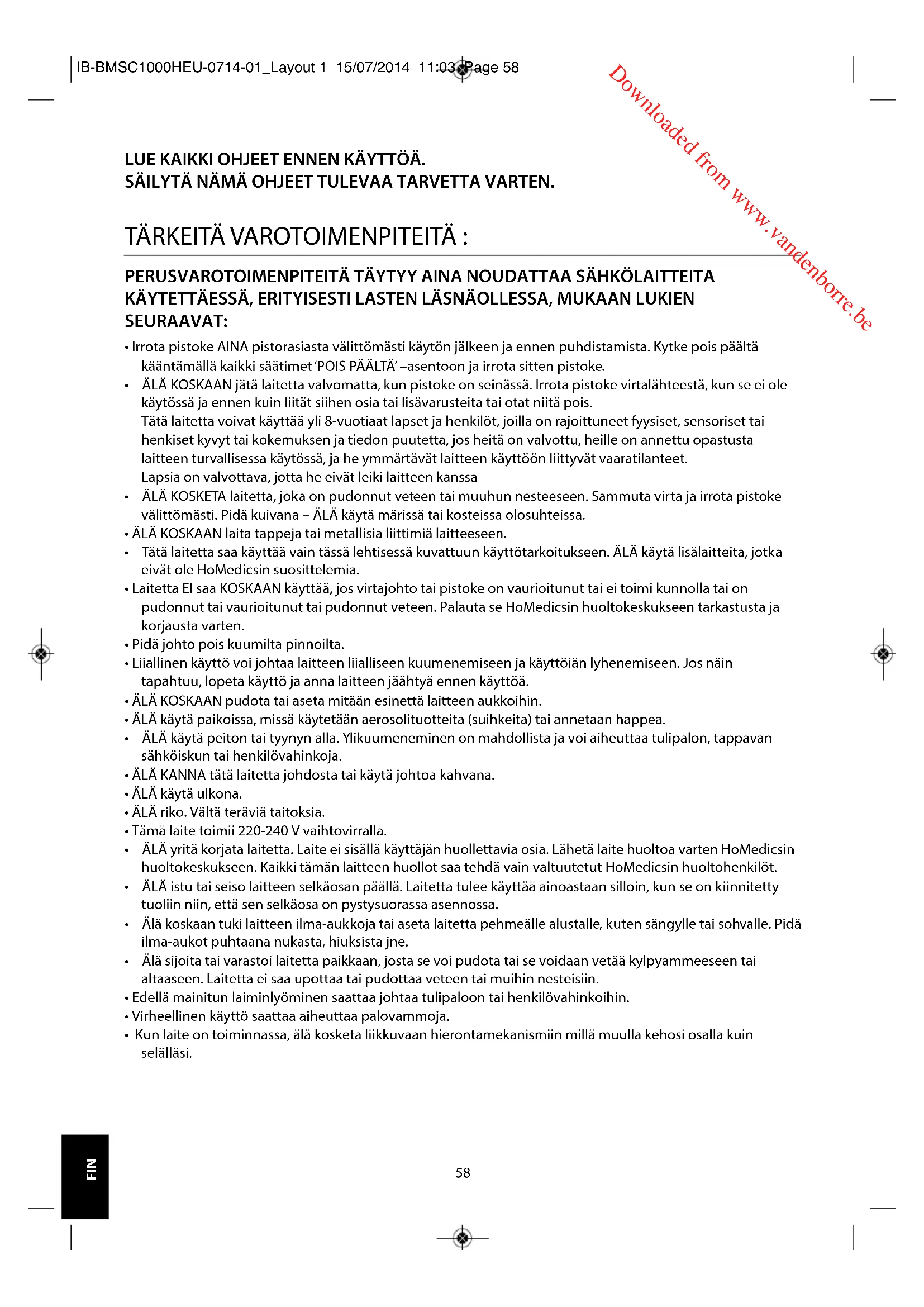 - Kun laite on toiminnassa, älä kosketa liikkuvaan hierontamekanismiin millä muulla kehosi osalla kuin selälläsi. IB-BMSC1000HEU-0714-01_Layout 1 15/07/2014 11:03 Page 58 Downloaded from www.vandenborre.be59 FIN VAROTOIMENPITEET : LUE TÄMÄ OSIO HUOLELLISESTI ENNEN LAITTEEN KÄYTTÖÄ.