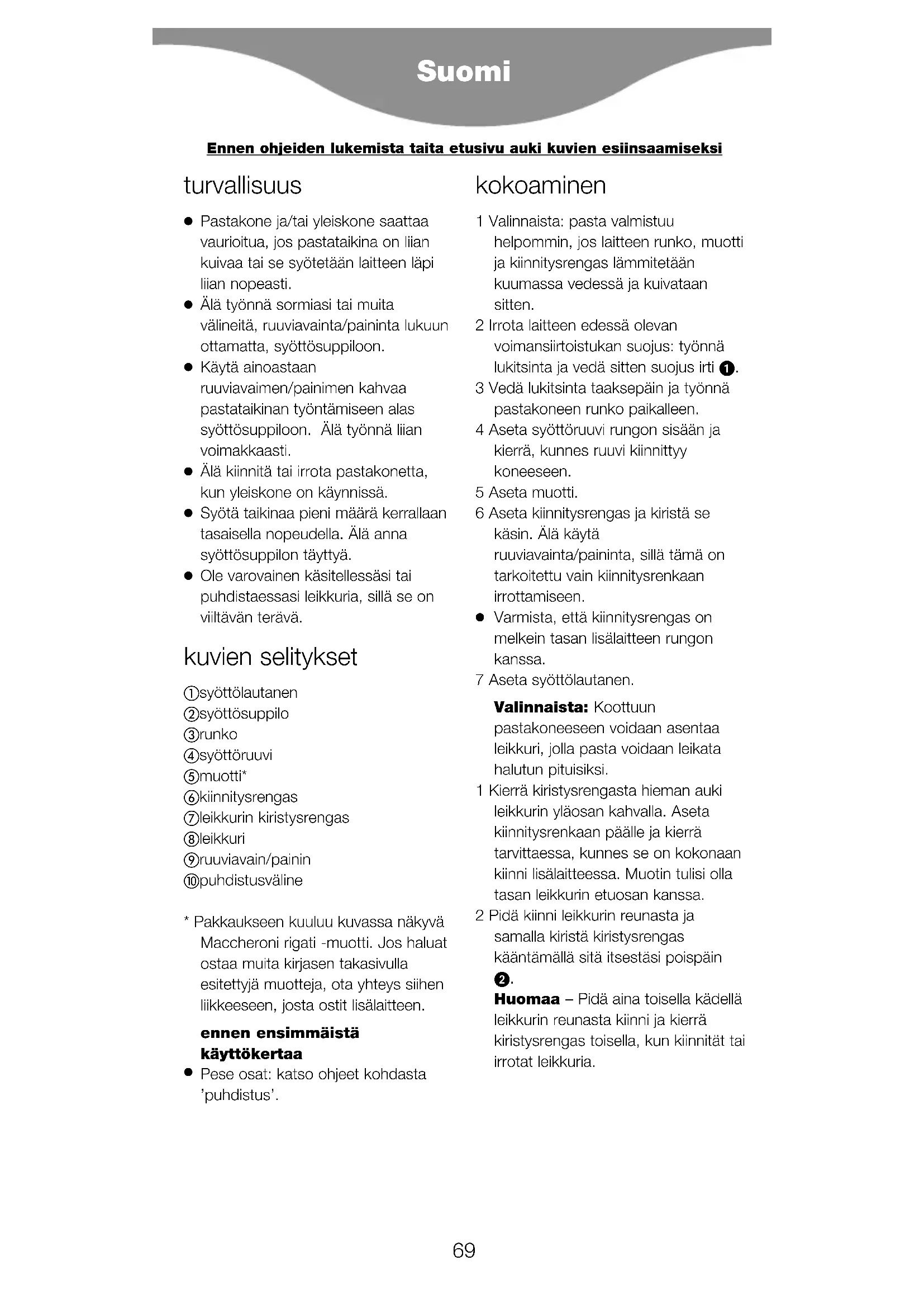 Suomi Ennen ohjeiden lukemista taita etusivu auki kuvien esiinsaamiseksipastakoneen käyttö 1 Valmista pastataikina mukana tulevan ohjeen mukaisesti.
