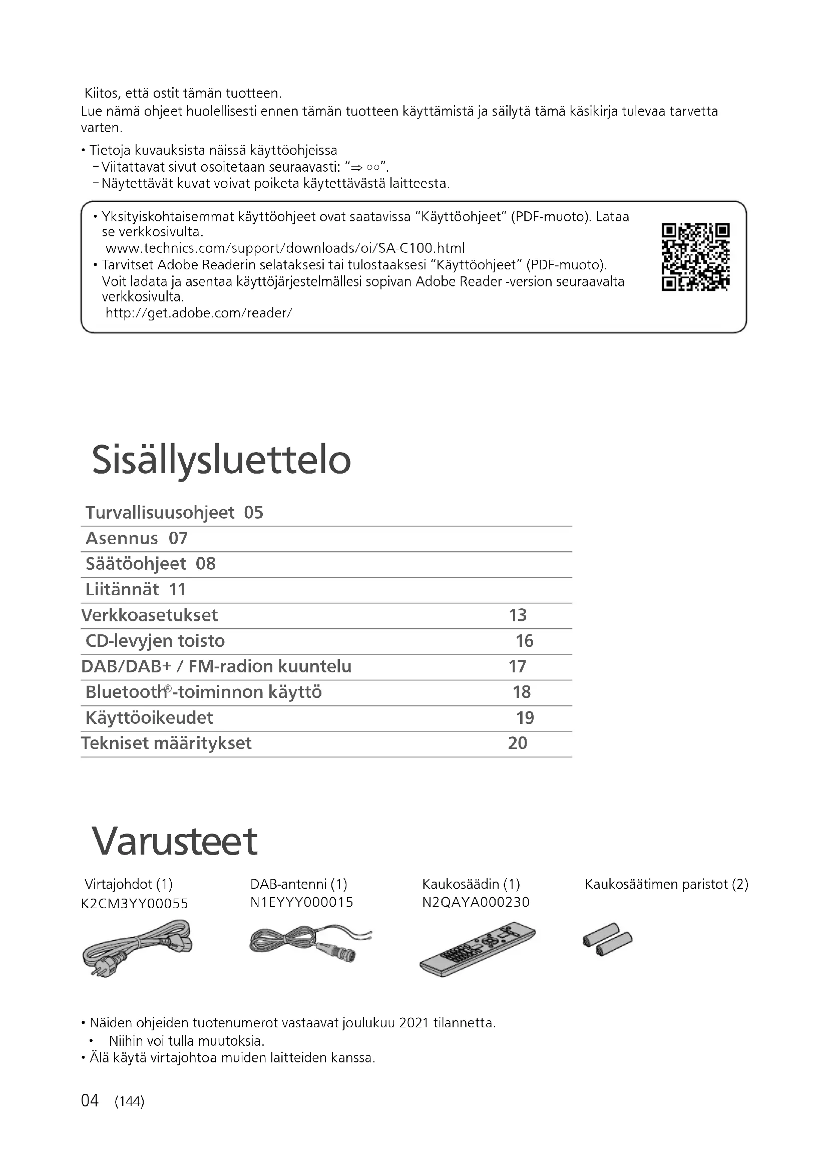 - Yksityiskohtaisemmat käyttöohjeet ovat saatavissa “Käyttöohjeet” (PDF-muoto). Lataa se verkkosivulta. www.technics.com/support/downloads/oi/SA-C100.html