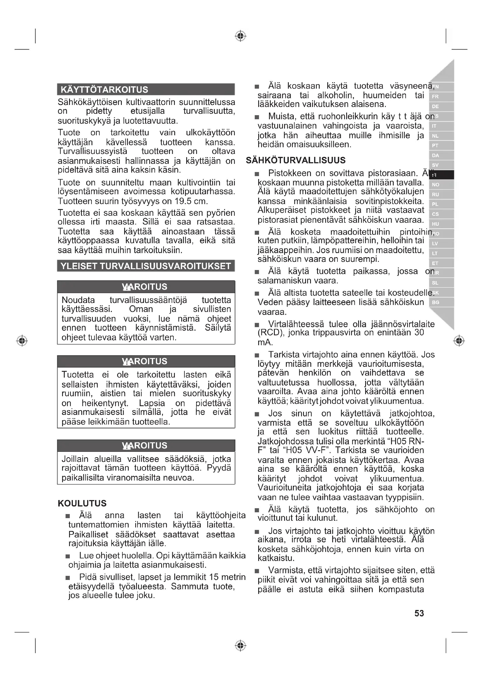 Sähkökäyttöisen kultivaattorin suunnittelussa on pidetty etusijalla turvallisuutta, suorituskykyä ja luotettavuutta. Tuote on tarkoitettu vain ulkokäyttöön käyttäjän kävellessä tuotteen kanssa. Turvallisuussyistä tuotteen on oltava asianmukaisesti hallinnassa ja käyttäjän on pideltävä sitä aina kaksin käsin. Tuote on suunniteltu maan kultivointiin tai löysentämiseen avoimessa kotipuutarhassa. Tuotteen suurin työsyvyys on 19.5 cm. Tuotetta ei saa koskaan käyttää sen pyörien ollessa irti maasta. Sillä ei saa ratsastaa. Tuotetta saa käyttää ainoastaan tässä käyttöoppaassa kuvatulla tavalla, eikä sitä saa käyttää muihin tarkoituksiin. YLEISET TURVALLISUUSVAROITUKSET VAROITUS Noudata turvallisuussääntöjä tuotetta käyttäessäsi. Oman ja sivullisten turvallisuuden vuoksi, lue nämä ohjeet ennen tuotteen käynnistämistä. Säilytä ohjeet tulevaa käyttöä varten. VAROITUS Tuotetta ei ole tarkoitettu lasten eikä sellaisten ihmisten käytettäväksi, joiden ruumiin, aistien tai mielen suorituskyky on heikentynyt. Lapsia on pidettävä asianmukaisesti silmällä, jotta he eivät pääse leikkimään tuotteella. VAROITUS Joillain alueilla vallitsee säädöksiä, jotka rajoittavat tämän tuotteen käyttöä. Pyydä paikallisilta viranomaisilta neuvoa. KOULUTUS Ŷ Älä anna lasten tai käyttöohjeita tuntemattomien ihmisten käyttää laitetta. Paikalliset säädökset saattavat asettaa rajoituksia käyttäjän iälle. Ŷ Lue ohjeet huolella. Opi käyttämään kaikkia ohjaimia ja laitetta asianmukaisesti. Ŷ Pidä sivulliset, lapset ja lemmikit 15 metrin etäisyydellä työalueesta. Sammuta tuote, jos alueelle tulee joku. Ŷ Älä koskaan käytä tuotetta väsyneenä, sairaana tai alkoholin, huumeiden tai lääkkeiden vaikutuksen alaisena. Ŷ Muista, että ruohonleikkurin käy t t äjä on vastuunalainen vahingoista ja vaaroista, jotka hän aiheuttaa muille ihmisille ja heidän omaisuuksilleen.
