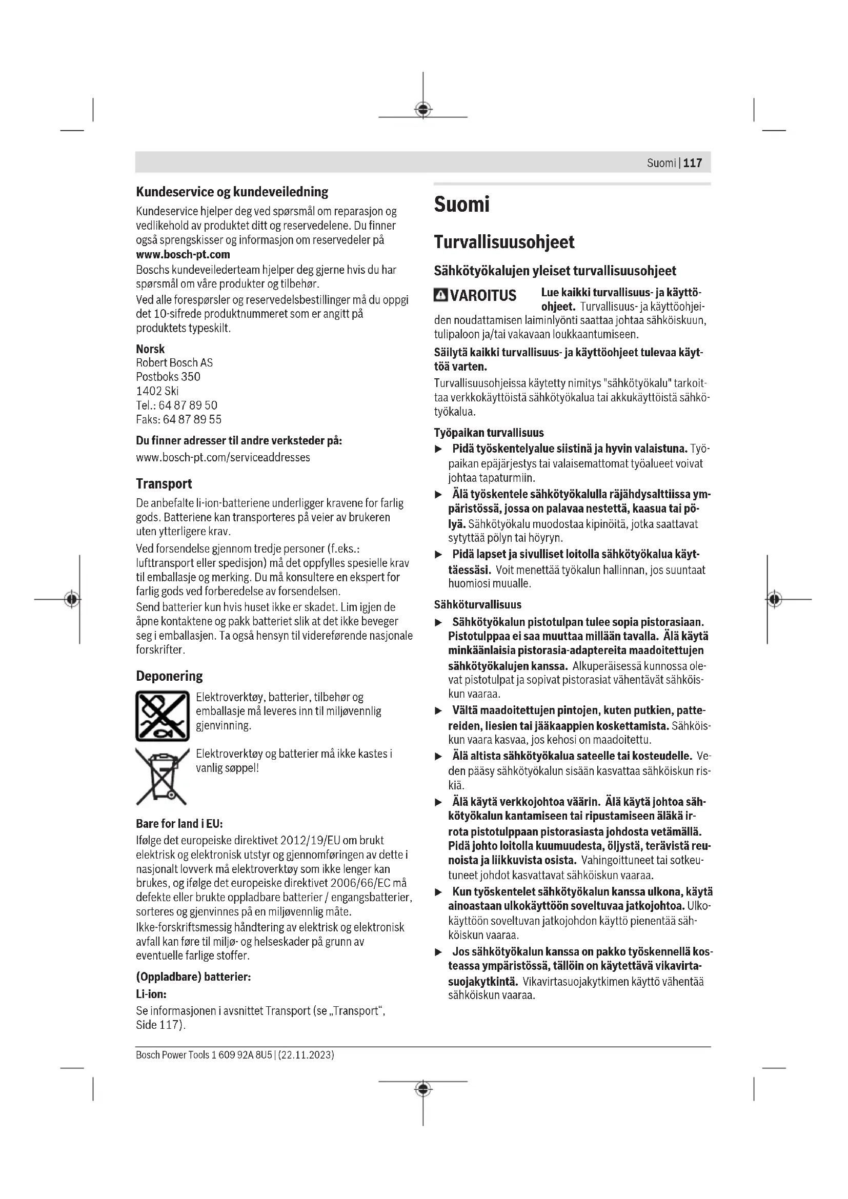 1,5 1,5 1,5 Näissä käyttöohjeissa ilmoitetut tärinä- ja melupäästötiedot on mitattu standardissa määritetyn mittausmenetelmän mu- kaan ja niitä voi käyttää sähkötyökalujen keskinäiseen vertai- luun. Ne soveltuvat myös tärinä- ja melupäästöjen alustavaan arviointiin. Ilmoitetut tärinä- ja melupäästöt vastaavat sähkötyökalun pääasiallisia käyttötapoja. Tärinä- ja melupäästöt saattavat kuitenkin poiketa ilmoitetuista arvoista, jos sähkötyökalua käytetään toisiin töihin, muilla käyttötarvikkeilla tai riittämät- tömästi huollettuna. Tämä saattaa suurentaa koko työsken- telyajan tärinä- ja melupäästöjä huomattavasti. Tärinä- ja melupäästöjen tarkaksi arvioimiseksi on huomioi- tava myös ne ajat, jolloin laite on sammutettuna tai tyhjä- käynnillä. Tämä voi vähentää huomattavasti koko työskente- lyajan tärinä- ja melupäästöjä. Määrittele tarvittavat lisävarotoimenpiteet käyttäjän suojele- miseksi tärinän aiheuttamilta haitoilta (esimerkiksi sähkötyö- kalujen ja käyttötarvikkeiden huolto, käsien pitäminen lämpi- minä ja työprosessien organisointi). Akku u Irrota akku, ennen kuin alat tehdä sähkötyökaluun liit- tyviä töitä (esim. huolto, käyttötarvikkeen vaihto, jne.). Irrota akku myös sähkötyökalun kuljetuksen ja säilytyksen ajaksi. Käynnistyskytkimen tahaton painal- lus aiheuttaa loukkaantumisvaaran. Bosch myy akkukäyttöisiä sähkötyökaluja myös ilman akkua. Pakkauksesta näet, sisältyykö akku sähkötyökalusi toimituk- seen. Akun lataminen u Käytä vain teknisissä tiedoissa ilmoitettuja latauslait- teita. Vain nämä latauslaitteet soveltuvat sähkötyökalus- sasi käytettävälle litiumioniakulle. Huomautus: kansainvälisten kuljetusmääräysten mukaisesti Li-ion-akut toimitetaan osittain ladattuina. Akun täyden suo- rituskyvyn varmistamiseksi akku tulee ladata täyteen ennen ensikäyttöä. Akun asentaminen Työnnä ladattu akku akun kiinnityskohtaan niin, että se lukit- tuu paikalleen. Akun irrottaminen Kun haluat ottaa akun pois, paina akun vapautuspainiketta ja vedä akku irti. Älä irrota akkua väkisin. Akussaon 2 lukitusvaihetta, millä estetään akun irtoaminen, jos painat tahattomasti akunvapautuspainiketta. Sähkötyö- kalussa oleva akku pysyy paikallaan jousen avulla. Akun lataustilan näyttö Huomautus: lataustilan näyttöä ei ole kaikissa akkutyypeissä. Akun lataustilan näytön vihreät LED-valot ilmoittavat akun la- taustilan. Turvallisuussyistä lataustilan tarkistaminen on mahdollista vain sähkötyökalun ollessa pysähdyksissä. Kun haluat nähdä lataustilan, paina lataustilan näytön paini- ketta tai . Tämä on mahdollista myös akun ollessa irro- tettuna. Jos lataustilan näytön painikkeen painaminen ei sytytä yh- tään LED-valoa, akku on viallinen ja täytyy vaihtaa. Akun lataustila näytetään myös käyttöliittymässä (katso "Ti- lan näytöt", Sivu123). Akkutyyppi GBA 18V... LED-valo Kapasiteetti 3vihreää LED-valoa palaa jatkuvasti 60–100% 2vihreää LED-valoa palaa jatkuvasti 30–60% 1vihreä LED-valo palaa jatkuvasti 5–30% 1vihreä LED-valo vilkkuu 0–5% Bosch Power Tools 1 609 92A 8U5 | (22.11.2023)122 | Suomi Akkutyyppi ProCORE18V... LED-valo Kapasiteetti 5vihreää LED-valoa palaa jatkuvasti 80–100% 4vihreää LED-valoa palaa jatkuvasti 60–80% 3vihreää LED-valoa palaa jatkuvasti 40–60% 2vihreää LED-valoa palaa jatkuvasti 20–40% 1vihreä LED-valo palaa jatkuvasti 5–20% 1vihreä LED-valo vilkkuu 0–5% Ohjeita akun optimaaliseen käsittelyyn Suojaa akku kosteudelta ja vedeltä. Säilytä akkua vain –20...50°C lämpötilassa. Älä jätä akkua esimerkiksi kuumana kesäpäivänä pitkäksi ajaksi autoon. Puhdista akun tuuletusaukot säännöllisin väliajoin peh- meällä, puhtaalla ja kuivalla siveltimellä. Huomattavasti lyhentynyt käyntiaika latauksen jälkeen osoit- taa, että akku on elinikänsä lopussa ja täytyy vaihtaa uuteen. Huomioi hävitysohjeet. Asennus u Irrota akku, ennen kuin alat tehdä sähkötyökaluun liit- tyviä töitä (esim. huolto, käyttötarvikkeen vaihto, jne.). Irrota akku myös sähkötyökalun kuljetuksen ja säilytyksen ajaksi. Käynnistyskytkimen tahaton painal- lus aiheuttaa loukkaantumisvaaran. Lippaan täyttö (katso kuvat A1−A4) u Irrota akku, ennen kuin säädät laitetta, vaihdat tarvik- keita tai asetat sähkötyökalun syrjään. Tämä varotoi- menpide estää sähkötyökalun tahattoman käynnistymi- sen. Käytä vain alkuperäisiäBosch-tarvikkeita. Sähkötyökalun tarkkuusosat, kuten lipas, suuosa ja iskukanava, on suunniteltuBosch-tarvikevalikoiman hakasille, nauloille ja sinkilöille. Muut valmistajat käyttävät muita teräslaatuja ja mitoituksia. Huomautus: käytä vain "Tekniset tiedot" -taulukossa mainit- tuja kiinnitystarvikkeita. Kiellettyjen naulojen käyttö voi vahingoittaa sähkötyökalua ja aiheuttaa vammoja. Kun täytät lipasta, pidä sähkötyökalusta kiinni niin, ettei suuosa (18) osoita vartaloasi tai muita ihmisiä kohti. – Puhdista tarvittaessa lippaan luisti (15) ja varmista, ettei lippaassa (14) ole likaa. – Työnnä sopiva naulanauha (20) lippaan (14) päässä ole- vaan T-uraan. – Työnnä naulanauhaa eteenpäin, kunnes viimeinen naula pysähtyy lippaan jousen (21) eteen. Huomautus: elektroninen valvonta tunnistaa, onko lip- paassa nauloja. Liipaisua ei tapahdu, jos varmistin työnne- tään pohjaan lippaan ollessa tyhjä. Tällä estetään tyhjät lau- kaisut. – Paina esijännitetty naulan vääntiö (16) lippaan luistia (15) vasten ja vedä samanaikaisesti lippaan luisti lippaan (14) loppupäähän. Huomautus: lippaan luistin täytyy liukua kevyesti takaisin (pelkällä sormivoimalla). Lippaan luistin jumittuminen ai- heuttaa seuraavia häiriöitä: naulaa ei laukaista, naula juuttuu iskukanavaan (katso Jumittuma) tai naula laukaistaan vää- rässä kulmassa. – Ohjaa lippaan luistia (15) painamalla naulan v