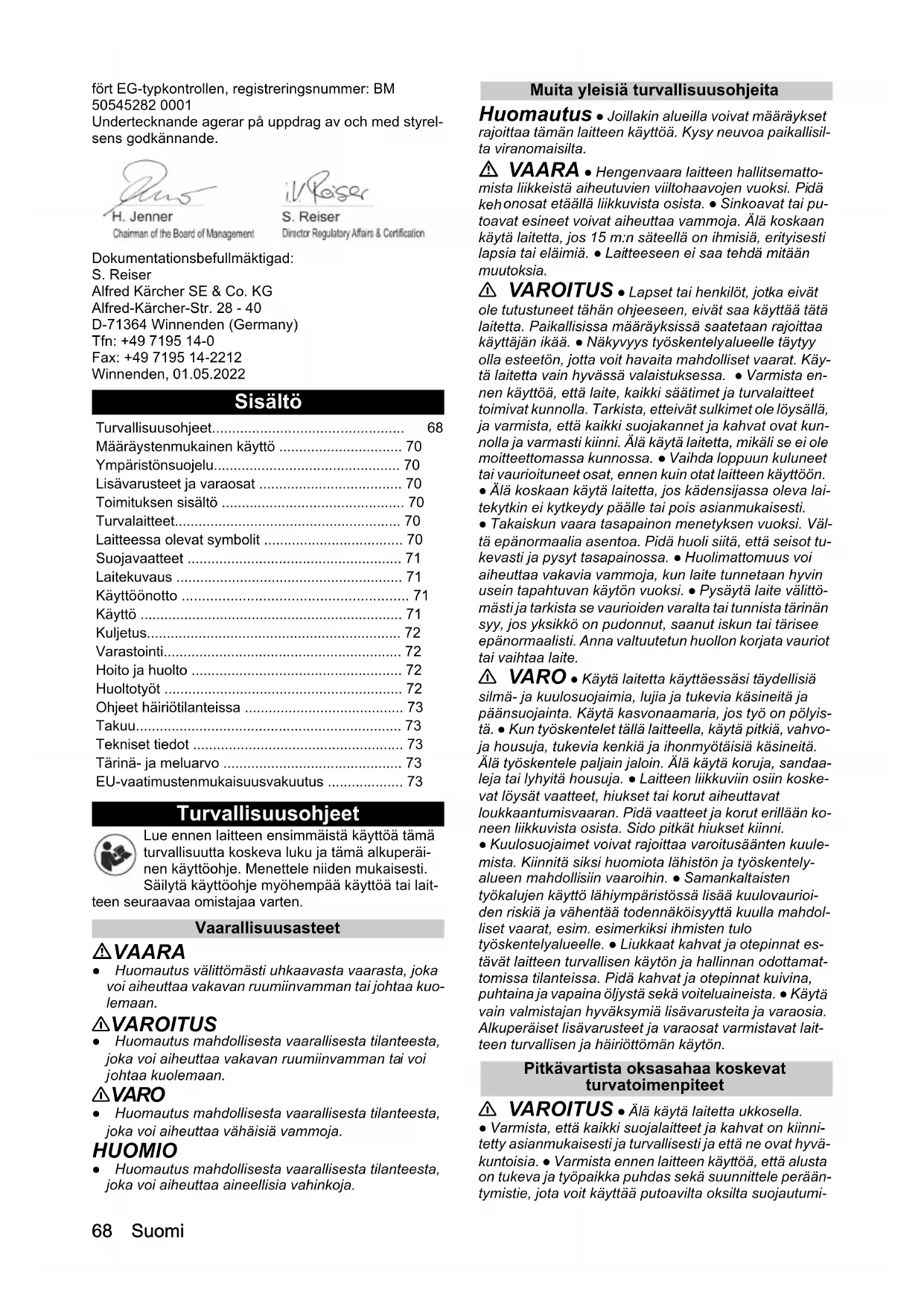 Undertecknande agerar på uppdrag av och med styrel- sens godkännande. Dokumentationsbefullmäktigad: S. Reiser Alfred Kärcher SE & Co. KG Alfred-Kärcher-Str. 28 - 40 D-71364 Winnenden (Germany) Tfn: +49 7195 14-0 Fax: +49 7195 14-2212 Winnenden, 01.05.2022 Sisältö Turvallisuusohjeet Lue ennen laitteen ensimmäistä käyttöä tämä turvallisuutta koskeva luku ja tämä alkuperäi- nen käyttöohje. Menettele niiden mukaisesti. Säilytä käyttöohje myöhempää käyttöä tai lait- teen seuraavaa omistajaa varten. Vaarallisuusasteet VAARA ● Huomautus välittömästi uhkaavasta vaarasta, joka voi aiheuttaa vakavan ruumiinvamman tai johtaa kuo- lemaan. 몇 VAROITUS ● Huomautus mahdollisesta vaarallisesta tilanteesta, joka voi aiheuttaa vakavan ruumiinvamman ta i voi