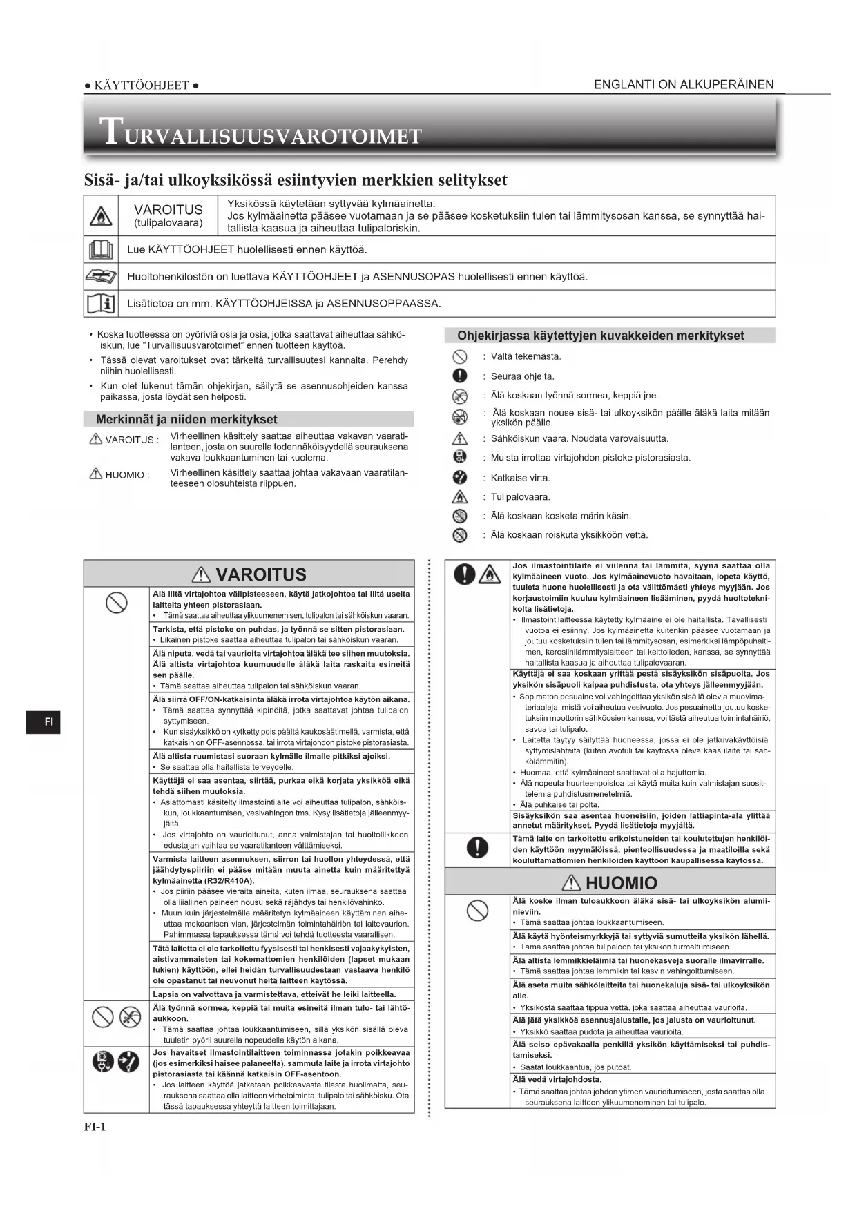 - Koska tuotteessa on pyöriviä osia ja osia, jotka saattavat aiheuttaa sähkö-iskun, lue “Turvallisuusvarotoimet” ennen tuotteen käyttöä.• Tässä olevat varoitukset ovat tärkeitä turvallisuutesi kannalta. Perehdy niihin huolellisesti.• Kun olet lukenut tämän ohjekirjan, säilytä se asennusohjeiden kanssa paikassa, josta löydät sen helposti. Merkinnät ja niiden merkitykset VAROITUS :Virheellinen käsittely saattaa aiheuttaa vakavan vaarati-lanteen, josta on suurella todennäköisyydellä seurauksena vakava loukkaantuminen tai kuolema. HUOMIO :Virheellinen käsittely saattaa johtaa vakavaan vaaratilan-teeseen olosuhteista riippuen. Ohjekirjassa käytettyjen kuvakkeiden merkitykset : Vältä tekemästä. : Seuraa ohjeita. : Älä koskaan työnnä sormea, keppiä jne. : Älä koskaan nouse sisä- tai ulkoyksikön päälle äläkä laita mitään yksikön päälle. : Sähköiskun vaara. Noudata varovaisuutta. : Muista irrottaa virtajohdon pistoke pistorasiasta. : Katkaise virta. : Tulipalovaara. : Älä koskaan kosketa märin käsin. : Älä koskaan roiskuta yksikköön vettä. Sisä- ja/tai ulkoyksikössä esiintyvien merkkien selitykset VAROITUS (tulipalovaara)Yksikössä käytetään syttyvää kylmäainetta.Jos kylmäainetta pääsee vuotamaan ja se pääsee kosketuksiin tulen tai lämmitysosan kanssa, se synnyttää hai-tallista kaasua ja aiheuttaa tulipaloriskin.Lue KÄYTTÖOHJEET huolellisesti ennen käyttöä.Huoltohenkilöstön on luettava KÄYTTÖOHJEET ja ASENNUSOPAS huolellisesti ennen käyttöä.Lisätietoa on mm. KÄYTTÖOHJEISSA ja ASENNUSOPPAASSA. VAROITUS Älä liitä virtajohtoa välipisteeseen, käytä jatkojohtoa tai liitä useita laitteita yhteen pistorasiaan. Tämä saattaa aiheuttaa ylikuumenemisen, tulipalon tai sähköiskun vaaran.Tarkista, että pistoke on puhdas, ja työnnä se sitten pistorasiaan.• Likainen pistoke saattaa aiheuttaa tulipalon tai sähköiskun vaaran.Älä niputa, vedä tai vaurioita virtajohtoa äläkä tee siihen muutoksia. Älä altista virtajohtoa kuumuudelle äläkä laita raskaita esineitä sen päälle.• Tämä saattaa aiheuttaa tulipalon tai sähköiskun vaaran.Älä siirrä OFF/ON-katkaisinta äläkä irrota virtajohtoa käytön aikana.• Tämä saattaa synnyttää kipinöitä, jotka saattavat johtaa tulipalon syttymiseen. Kun sisäyksikkö on kytketty pois päältä kaukosäätimellä, varmista, että katkaisin on OFF-asennossa, tai irrota virtajohdon pistoke pistorasiasta. Älä altista ruumistasi suoraan kylmälle ilmalle pitkiksi ajoiksi.• Se saattaa olla haitallista terveydelle.Käyttäjä ei saa asentaa, siirtää, purkaa eikä korjata yksikköä eikä tehdä siihen muutoksia.• Asiattomasti käsitelty ilmastointilaite voi aiheuttaa tulipalon, sähköis-kun, loukkaantumisen, vesivahingon tms. Kysy lisätietoja jälleenmyy-jältä.• Jos virtajohto on vaurioitunut, anna valmistajan tai huoltoliikkeen edustajan vaihtaa se vaaratilanteen välttämiseksi.Varmista laitteen asennuksen, siirron tai huollon yhteydessä, että jäähdytyspiiriin ei pääse mitään muuta ainetta kuin määritettyä kylmäainetta (R32/R410A).• Jos piiriin pääsee vieraita aineita, kuten ilmaa, seurauksena saattaa olla liiallinen paineen nousu sekä räjähdys tai henkilövahinko. • Muun kuin järjestelmälle määritetyn kylmäaineen käyttäminen aihe-uttaa mekaanisen vian, järjestelmän toimintahäiriön tai laitevaurion. Pahimmassa tapauksessa tämä voi tehdä tuotteesta vaarallisen.Tätä laitetta ei ole tarkoitettu fyysisesti tai henkisesti vajaakykyisten, aistivammaisten tai kokemattomien henkilöiden (lapset mukaan lukien) käyttöön, ellei heidän turvallisuudestaan vastaava henkilö ole opastanut tai neuvonut heitä laitteen käytössä.Lapsia on valvottava ja varmistettava, etteivät he leiki laitteella. Älä työnnä sormea, keppiä tai muita esineitä ilman tulo- tai lähtö-aukkoon.• Tämä saattaa johtaa loukkaantumiseen, sillä yksikön sisällä oleva tuuletin pyörii suurella nopeudella käytön aikana. Jos havaitset ilmastointilaitteen toiminnassa jotakin poikkeavaa (jos esimerkiksi haisee palaneelta), sammuta laite ja irrota virtajohto pistorasiasta tai käännä katkaisin OFF-asentoon.• Jos laitteen käyttöä jatketaan poikkeavasta tilasta huolimatta, seu-rauksena saattaa olla laitteen virhetoiminta, tulipalo tai sähköisku. Ota tässä tapauksessa yhteyttä laitteen toimittajaan. Jos ilmastointilaite ei viilennä tai lämmitä, syynä saattaa olla kylmäaineen vuoto. Jos kylmäainevuoto havaitaan, lopeta käyttö, tuuleta huone huolellisesti ja ota välittömästi yhteys myyjään. Jos korjaustoimiin kuuluu kylmäaineen lisääminen, pyydä huoltotekni-kolta lisätietoja.• Ilmastointilaitteessa käytetty kylmäaine ei ole haitallista. Tavallisesti vuotoa ei esiinny. Jos kylmäainetta kuitenkin pääsee vuotamaan ja joutuu kosketuksiin tulen tai lämmitysosan, esimerkiksi lämpöpuhalti-men, kerosiinilämmityslaitteen tai keittolieden, kanssa, se synnyttää haitallista kaasua ja aiheuttaa tulipalovaaran.Käyttäjä ei saa koskaan yrittää pestä sisäyksikön sisäpuolta. Jos yksikön sisäpuoli kaipaa puhdistusta, ota yhteys jälleenmyyjään.• Sopimaton pesuaine voi vahingoittaa yksikön sisällä olevia muovima-teriaaleja, mistä voi aiheutua vesivuoto. Jos pesuainetta joutuu koske-tuksiin moottorin sähköosien kanssa, voi tästä aiheutua toimintahäiriö, savua tai tulipalo.• Laitetta täytyy säilyttää huoneessa, jossa ei ole jatkuvakäyttöisiä syttymislähteitä (kuten avotuli tai käytössä oleva kaasulaite tai säh-kölämmitin).• Huomaa, että kylmäaineet saattavat olla hajuttomia.• Älä nopeuta huurteenpoistoa tai käytä muita kuin valmistajan suosit-telemia puhdistusmenetelmiä.• Älä puhkaise tai polta.Sisäyksikön saa asentaa huoneisiin, joiden lattiapinta-ala ylittää annetut määritykset. Pyydä lisätietoja myyjältä. Tämä laite on tarkoitettu eriko