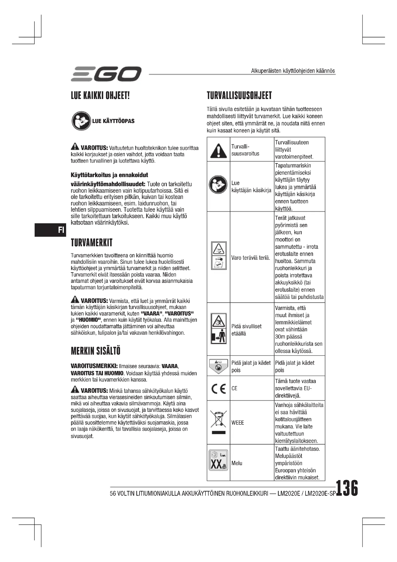 VAROITUSMERKKI: Ilmaisee seuraavia: VAARA, VAROITUS TAI HUOMIO. Voidaan käyttää yhdessä muiden merkkien tai kuvamerkkien kanssa. VAROITUS: Minkä tahansa sähkötyökalun käyttö saattaa aiheuttaa vierasesineiden sinkoutumisen silmiin, mikä voi aiheuttaa vakavia silmävammoja. Käytä aina suojalaseja, joissa on sivusuojat, ja tarvittaessa koko kasvot peittävää suojaa, kun käytät sähkötyökaluja. Silmälasien päällä suosittelemme käytettäväksi suojamaskia, jossa on laaja näkökenttä, tai tavallisia suojalaseja, joissa on sivusuojat. TURVALLISUUSOHJEET Tällä sivulla esitetään ja kuvataan tähän tuotteeseen mahdollisesti liittyvät turvamerkit. Lue kaikki koneen ohjeet siten, että ymmärrät ne, ja noudata niitä ennen kuin kasaat koneen ja käytät sitä.Turvalli-suusvaroitusTurvallisuuteen liittyvät varotoimenpiteet.Lue käyttäjän käsikirjaTapaturmariskin pienentämiseksi käyttäjän täytyy lukea ja ymmärtää käyttäjän käsikirja ennen tuotteen käyttöä.Varo teräviä teriä.Terät jatkavat pyörimistä sen jälkeen, kun moottori on sammutettu - irrota erotuslaite ennen huoltoa. Sammuta ruohonleikkuri ja poista irrotettava akkuyksikkö (tai erotuslaite) ennen säätöä tai puhdistustaPidä sivulliset etäälläVarmista, että muut ihmiset ja lemmikkieläimet ovat vähintään 30m päässä ruohonleikkurista sen ollessa käytössä.Pidä jalat ja kädet pois Pidä jalat ja kädet pois