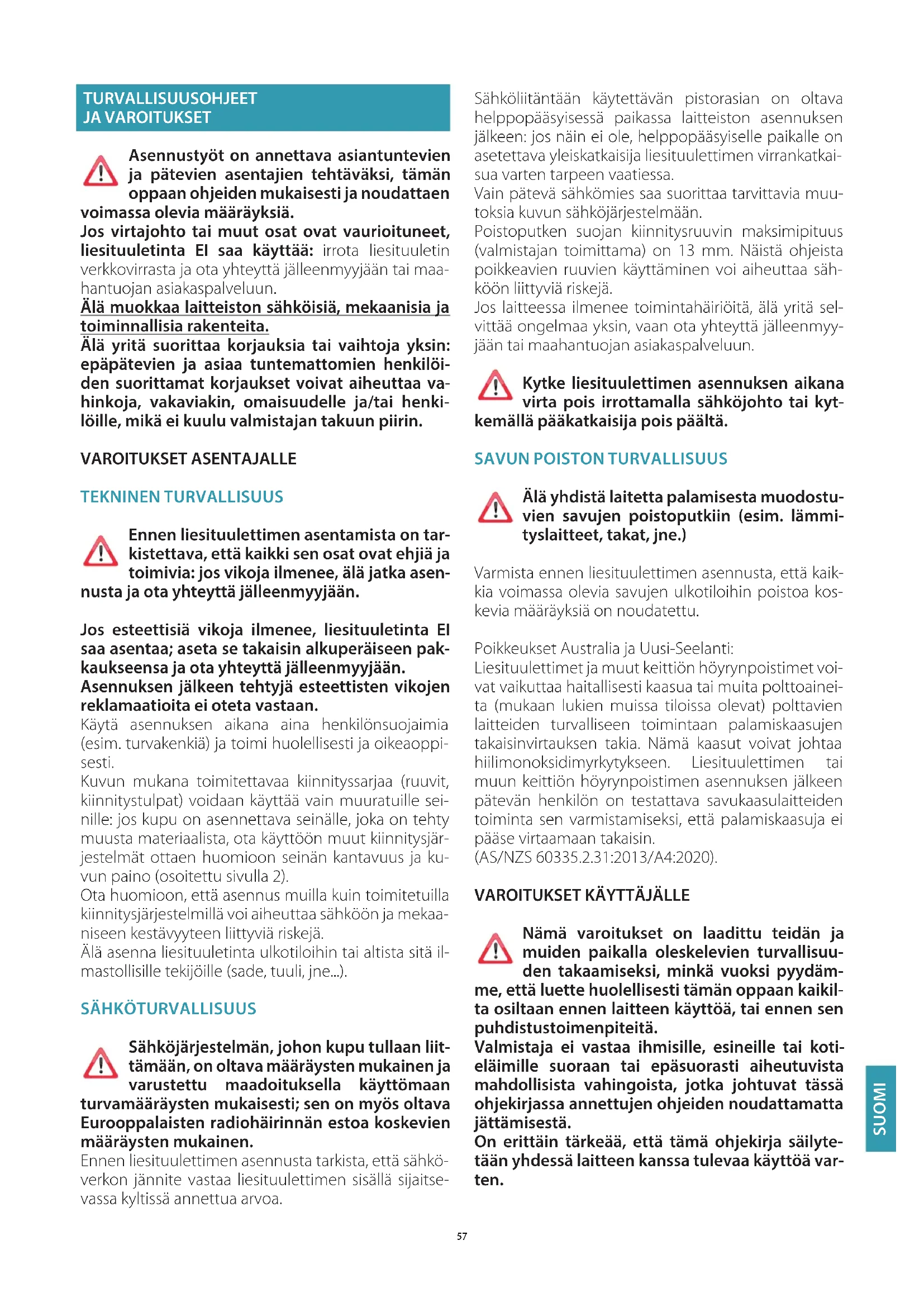 Älä yhdistä laitetta palamisesta muodostu- vien savujen poistoputkiin (esim. lämmi- tyslaitteet, takat, jne.) Varmista ennen liesituulettimen asennusta, että kaik- kia voimassa olevia savujen ulkotiloihin poistoa kos- kevia määräyksiä on noudatettu. Poikkeukset Australia ja Uusi-Seelanti: Liesituulettimet ja muut keittiön höyrynpoistimet voi- vat vaikuttaa haitallisesti kaasua tai muita polttoainei- ta (mukaan lukien muissa tiloissa olevat) polttavien laitteiden turvalliseen toimintaan palamiskaasujen takaisinvirtauksen takia. Nämä kaasut voivat johtaa hiilimonoksidimyrkytykseen. Liesituulettimen tai muun keittiön höyrynpoistimen asennuksen jälkeen pätevän henkilön on testattava savukaasulaitteiden toiminta sen varmistamiseksi, että palamiskaasuja ei pääse virtaamaan takaisin. (AS/NZS 60335.2.31:2013/A4:2020).