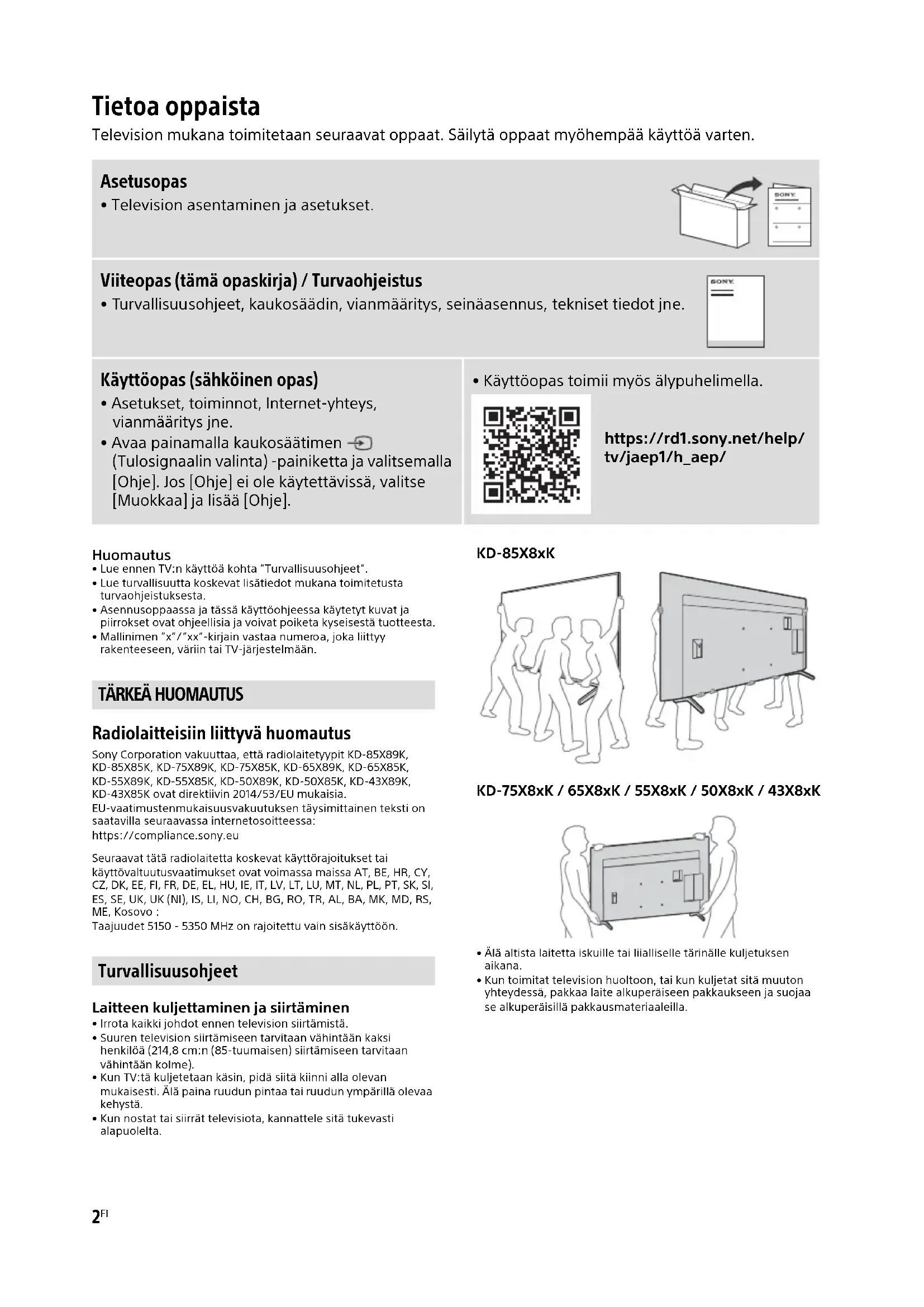 - Mallinimen ”x”/”xx”-kirjain vastaa numeroa, joka liittyy rakenteeseen, väriin tai TV-järjestelmään. Radiolaitteisiin liittyvä huomautus Sony Corporation vakuuttaa, että radiolaitetyypit KD-85X89K, KD-85X85K, KD-75X89K, KD-75X85K, KD-65X89K, KD-65X85K, KD-55X89K, KD-55X85K, KD-50X89K, KD-50X85K, KD-43X89K, KD-43X85K ovat direktiivin 2014/53/EU mukaisia. EU-vaatimustenmukaisuusvakuutuksen täysimittainen teksti on saatavilla seuraavassa internetosoitteessa: https://compliance.sony.eu Seuraavat tätä radiolaitetta koskevat käyttörajoitukset tai käyttövaltuutusvaatimukset ovat voimassa maissa AT, BE, HR, CY, CZ, DK, EE, FI, FR, DE, EL, HU, IE, IT, LV, LT, LU, MT, NL, PL, PT, SK, SI, ES, SE, UK, UK (NI), IS, LI, NO, CH, BG, RO, TR, AL, BA, MK, MD, RS, ME, Kosovo : Taajuudet 5150 - 5350 MHz on rajoitettu vain sisäkäyttöön. Laitteen kuljettaminen ja siirtäminen