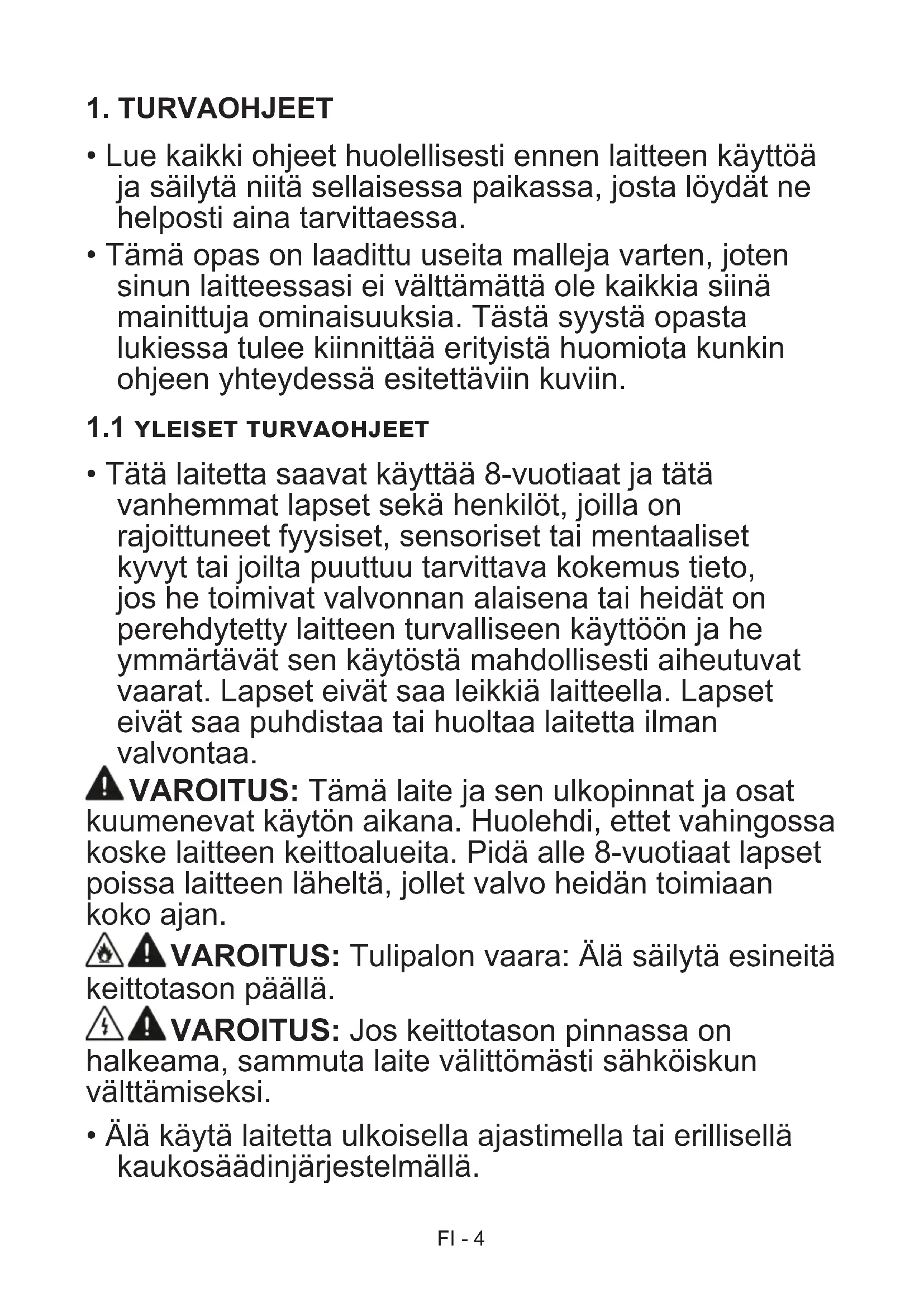 - Tätä laitetta saavat käyttää 8-vuotiaat ja tätä vanhemmat lapset sekä henkilöt, joilla on rajoittuneet fyysiset, sensoriset tai mentaaliset kyvyt tai joilta puuttuu tarvittava kokemus tieto, jos he toimivat valvonnan alaisena tai heidät on perehdytetty laitteen turvalliseen käyttöön ja he ymmärtävät sen käytöstä mahdollisesti aiheutuvat vaarat. Lapset eivät saa leikkiä laitteella. Lapset eivät saa puhdistaa tai huoltaa laitetta ilman valvontaa. VAROITUS: Tämä laite ja sen ulkopinnat ja osat kuumenevat käytön aikana. Huolehdi, ettet vahingossa koske laitteen keittoalueita. Pidä alle 8-vuotiaat lapset poissa laitteen läheltä, jollet valvo heidän toimiaan koko ajan. VAROITUS: Tulipalon vaara: Älä säilytä esineitä keittotason päällä. VAROITUS: Jos keittotason pinnassa on halkeama, sammuta laite välittömästi sähköiskun välttämiseksi.