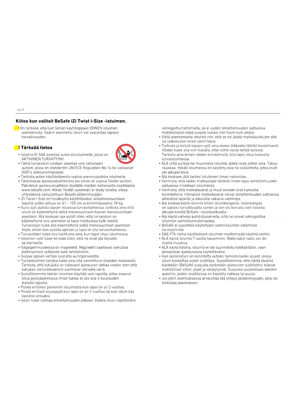 - Jos jokin asennuksessa arveluttaa ota yhteys jälleenmyyjään, joka voi tarkistaa asennuksen. ! On tärkeää, että luet tämän käyttöoppaan ENNEN istuimen asentamista. Väärin asennettu istuin voi vaarantaa lapsesi turvallisuuden. Kiitos kun valitsit BeSafe iZi Twist i-Size -istuimen.28 29