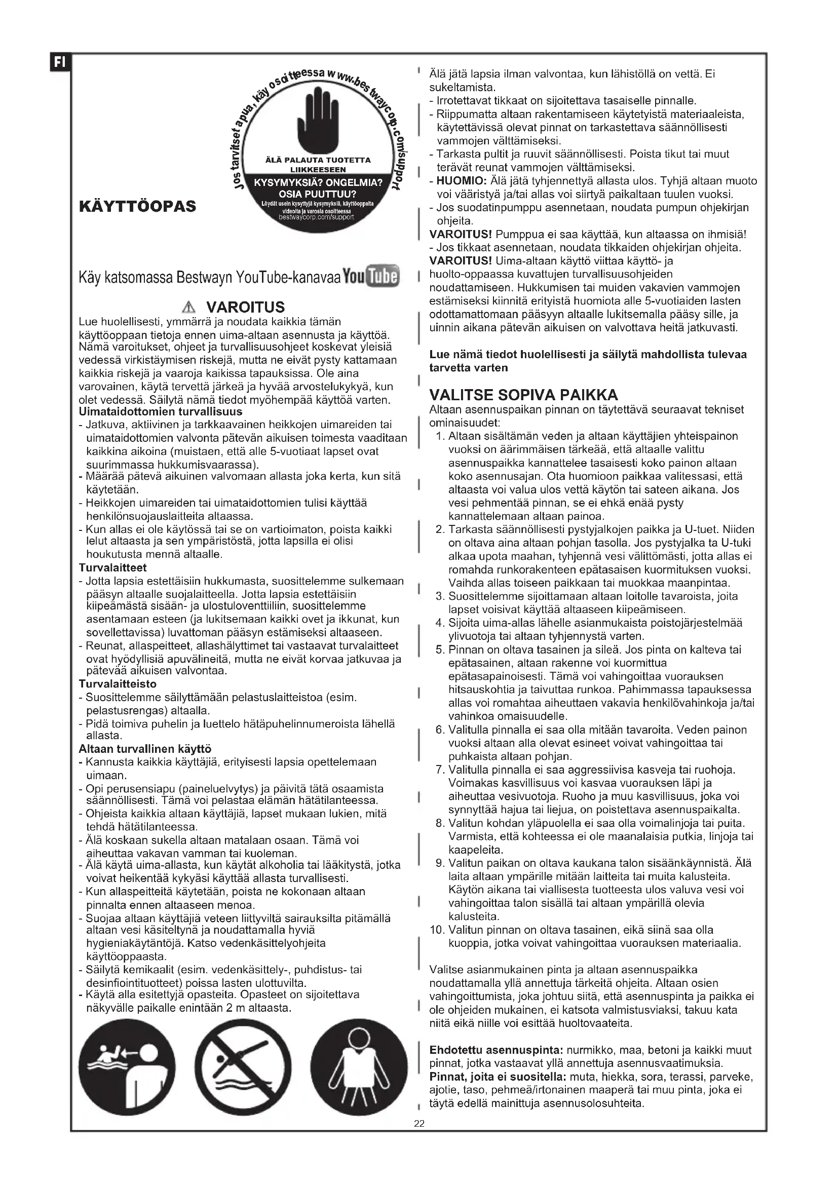 VAROITUS Lue huolellisesti, ymmärrä ja noudata kaikkia tämän käyttöoppaan tietoja ennen uima-altaan asennusta ja käyttöä. Nämä varoitukset, ohjeet ja turvallisuusohjeet koskevat yleisiä vedessä virkistäymisen riskejä, mutta ne eivät pysty kattamaan kaikkia riskejä ja vaaroja kaikissa tapauksissa. Ole aina varovainen, käytä tervettä järkeä ja hyvää arvostelukykyä, kun olet vedessä. Säilytä nämä tiedot myöhempää käyttöä varten.Uimataidottomien turvallisuus- Jatkuva, aktiivinen ja tarkkaavainen heikkojen uimareiden tai uimataidottomien valvonta pätevän aikuisen toimesta vaaditaan kaikkina aikoina (muistaen, että alle 5-vuotiaat lapset ovat suurimmassa hukkumisvaarassa).- Määrää pätevä aikuinen valvomaan allasta joka kerta, kun sitä käytetään.- Heikkojen uimareiden tai uimataidottomien tulisi käyttää henkilönsuojauslaitteita altaassa.- Kun allas ei ole käytössä tai se on vartioimaton, poista kaikki lelut altaasta ja sen ympäristöstä, jotta lapsilla ei olisi houkutusta mennä altaalle.Turvalaitteet- Jotta lapsia estettäisiin hukkumasta, suosittelemme sulkemaan pääsyn altaalle suojalaitteella. Jotta lapsia estettäisiin kiipeämästä sisään- ja ulostuloventtiiliin, suosittelemme asentamaan esteen (ja lukitsemaan kaikki ovet ja ikkunat, kun sovellettavissa) luvattoman pääsyn estämiseksi altaaseen.- Reunat, allaspeitteet, allashälyttimet tai vastaavat turvalaitteet ovat hyödyllisiä apuvälineitä, mutta ne eivät korvaa jatkuvaa ja pätevää aikuisen valvontaa.Turvalaitteisto- Suosittelemme säilyttämään pelastuslaitteistoa (esim. pelastusrengas) altaalla.- Pidä toimiva puhelin ja luettelo hätäpuhelinnumeroista lähellä allasta.Altaan turvallinen käyttö- Kannusta kaikkia käyttäjiä, erityisesti lapsia opettelemaan uimaan.- Opi perusensiapu (paineluelvytys) ja päivitä tätä osaamista säännöllisesti. Tämä voi pelastaa elämän hätätilanteessa.- Ohjeista kaikkia altaan käyttäjiä, lapset mukaan lukien, mitä tehdä hätätilanteessa.- Älä koskaan sukella altaan matalaan osaan. Tämä voi aiheuttaa vakavan vamman tai kuoleman.- Älä käytä uima-allasta, kun käytät alkoholia tai lääkitystä, jotka voivat heikentää kykyäsi käyttää allasta turvallisesti.- Kun allaspeitteitä käytetään, poista ne kokonaan altaan pinnalta ennen altaaseen menoa.- Suojaa altaan käyttäjiä veteen liittyviltä sairauksilta pitämällä altaan vesi käsiteltynä ja noudattamalla hyviä hygieniakäytäntöjä. Katso vedenkäsittelyohjeita käyttöoppaasta.- Säilytä kemikaalit (esim. vedenkäsittely-, puhdistus- tai desinfiointituotteet) poissa lasten ulottuvilta.- Käytä alla esitettyjä opasteita. Opasteet on sijoitettava näkyvälle paikalle enintään 2 m altaasta.