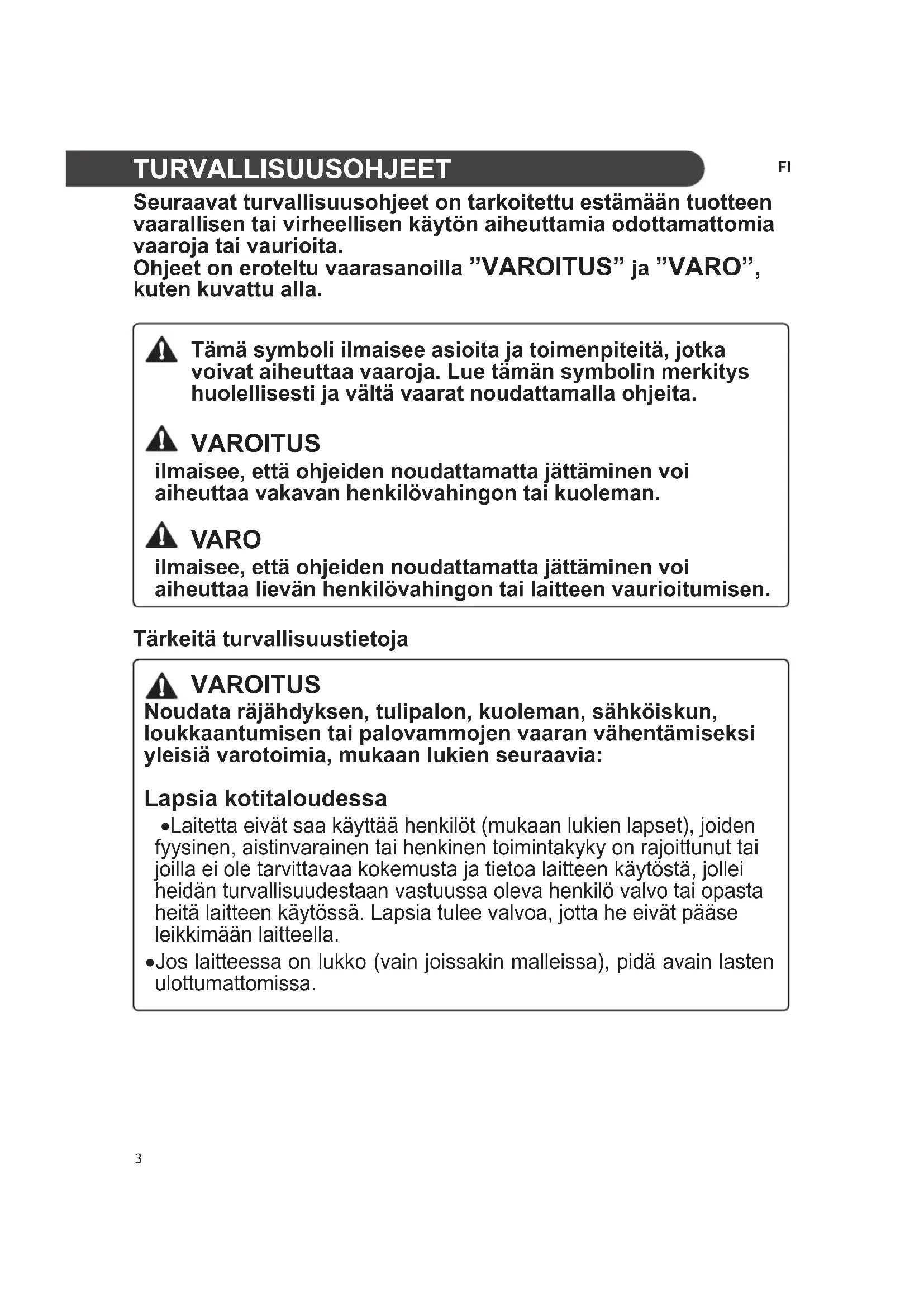 - Jos laitteessa on lukko (vain joissakin malleissa), pidä avain lasten ulottumattomissa. Tämä symboli ilmaisee asioita ja toimenpiteitä, jotka voivat aiheuttaa vaaroja. Lue tämän symbolin merkitys huolellisesti ja vältä vaarat noudattamalla ohjeita. VAROITUS ilmaisee, että ohjeiden noudattamatta jättäminen voi aiheuttaa vakavan henkilövahingon tai kuoleman. VARO ilmaisee, että ohjeiden noudattamatta jättäminen voi aiheuttaa lievän henkilövahingon tai laitteen vaurioitumisen. 3FI Eurooppalaisille käyttäjille: Laitetta saavat käyttää vähintään 8-vuotiaat lapset ja henkilöt, joiden fyysinen, aistinvarainen tai henkinen toimintakyky on rajoittunut tai joilla ei ole tarvittavaa kokemusta ja tietoa laitteen käytöstä, jos heitä valvotaan tai opastetaan laitteen turvalliseen käyttöön, ja he ymmärtävät käyttöön liittyvät vaarat. Lapset eivät saa leikkiä laitteella. Lapset eivät saa tehdä puhdistus- tai kunnossapitotoimenpiteitä ilman valvontaa. Asentaminen