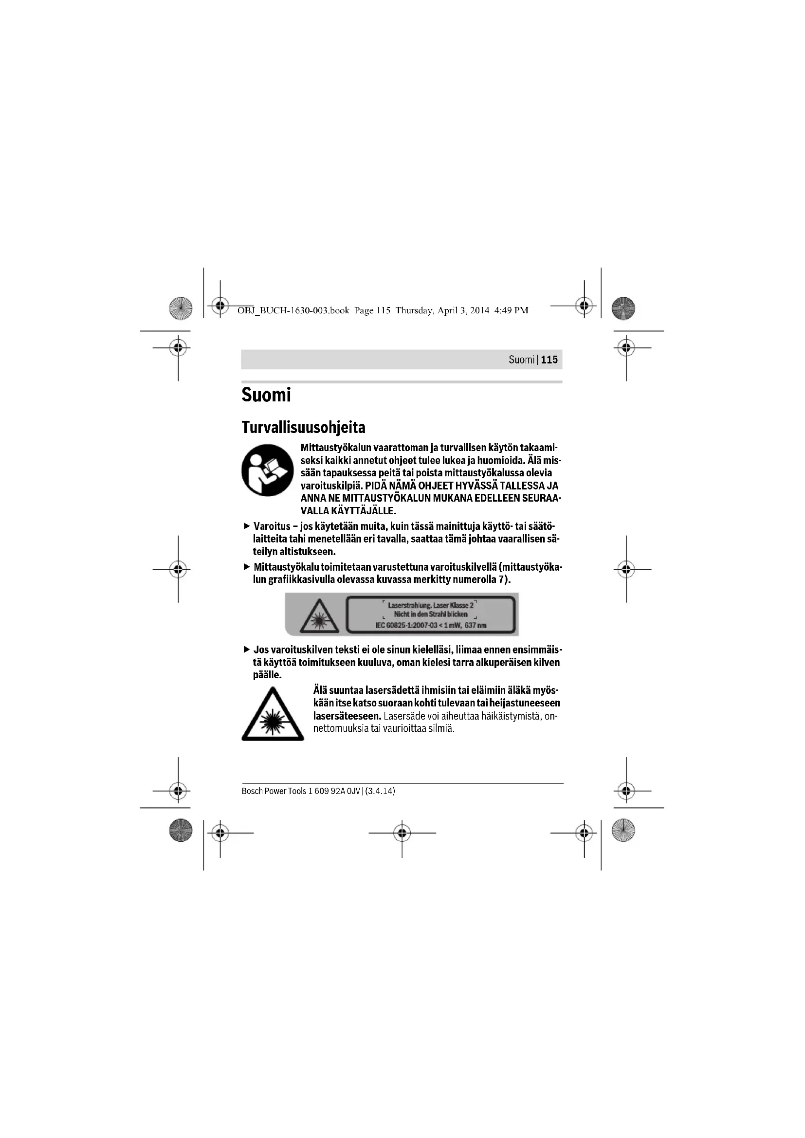 Älä käytä lasertarkkailulaseja aurinkolaseina tai tieliikenteessä. Lasertark- kailulasit eivät anna täydellistä UV-suojaa, ja ne alentavat värien erotuskykyä. OBJ_BUCH-1630-003.book Page 122 Thursday, April 3, 2014 4:49 PMSuomi | 123 Bosch Power Tools 1 609 92A 0JV | (3.4.14) Hoito ja huolto Huolto ja puhdistus Pidä aina mittaustyökalu puhtaana. Älä koskaan upota mittaustyökalua veteen tai muihin nesteisiin. Pyyhi pois lika kostealla pehmeällä rievulla. Älä käytä puhdistusaineita tai liuottimia. Puhdista erityisesti pinnat laserin ulostuloaukossa säännöllisesti ja varo nukkaa. Jos mittaustyökalussa huolellisesta valmistuksesta ja koestusmenettelystä huo- limatta esiintyy vikaa, tulee korjaus antaa Bosch-huollon tehtäväksi. Älä itse avaa mittaustyökalua. Ilmoita ehdottomasti kaikissa kyselyissä ja varaosatilauksissa 10-numeroinen tuotenumero, joka löytyy mittaustyökalun tyyppikilvestä. Asiakaspalvelu ja käyttöneuvonta Asiakaspalvelu vastaa tuotteesi korjausta ja huoltoa sekä varaosia koskeviin ky- symyksiin. Räjähdyspiirustuksia ja tietoja varaosista löydät myös osoitteesta: www.bosch-pt.com Boschin asiakaspalvelu auttaa mielellään sinua tuotteitamme ja niiden lisätarvik- keita koskevissa kysymyksissä. Suomi Robert Bosch Oy Bosch-keskushuolto Pakkalantie 21 A 01510 Vantaa Voitte tilata varaosat suoraan osoitteesta www.bosch-pt.fi. Puh.: 0800 98044 Faksi: 010 296 1838 www.bosch.fi OBJ_BUCH-1630-003.book Page 123 Thursday, April 3, 2014 4:49 PM1 609 92A 0JV | (3.4.14) Bosch Power Tools 124 | Suomi Hävitys Toimita mittaustyökalut, lisätarvikkeet ja pakkausmateriaali ympäristöystävälli- seen kierrätykseen. Älä heitä mittaustyökaluja tai akkuja/paristoja talousjätteisiin! Vain EU-maita varten: Eurooppalaisen direktiivin 2012/19/EU mukaan käyttökelvot- tomat mittaustyökalut ja eurooppalaisen direktiivin 2006/66/EY mukaan vialliset tai loppuun käytetyt akut/paris- tot täytyy kerätä erikseen ja toimittaa ympäristöystävälliseen kierrätykseen. Oikeus teknisiin muutoksiin pidätetään. OBJ_BUCH-1630-003.book Page 124 Thursday, April 3, 2014 4:49 PMΕλληνικά | 125 Bosch Power Tools 1 609 92A 0JV | (3.4.14)