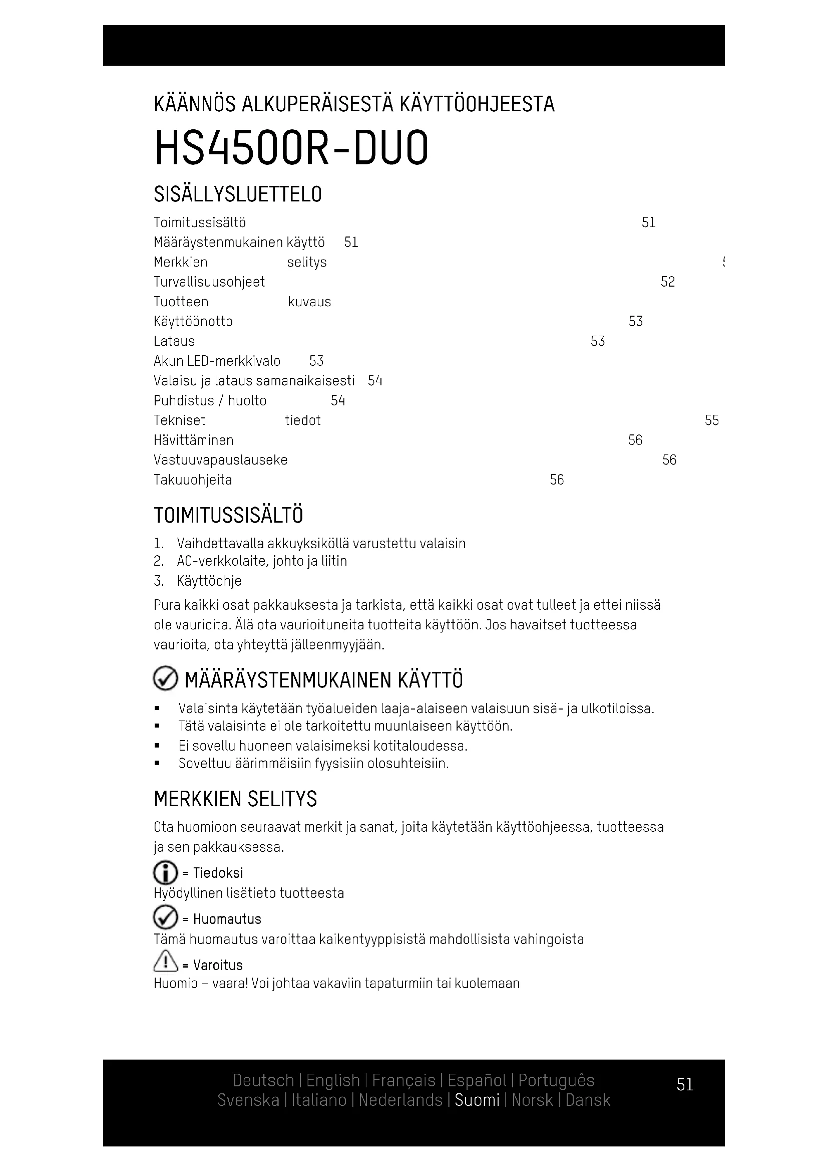 Lue tämä käyttöohje huolellisesti ennen ensimmäistä käyttökertaa ja toimi sen ohjeiden mukaisesti. Säilytä tämä käyttöohje myöhempää käyttöä tai valaisimen seuraavaa omistajaa varten. Jos käyttöohjetta ja turvallisuusohjeita ei oteta huomioon, tuotteeseen voi syntyä vaurioita tai sen käyttäjä ja muut henkilöt ovat vaarassa (loukkaantumiset).