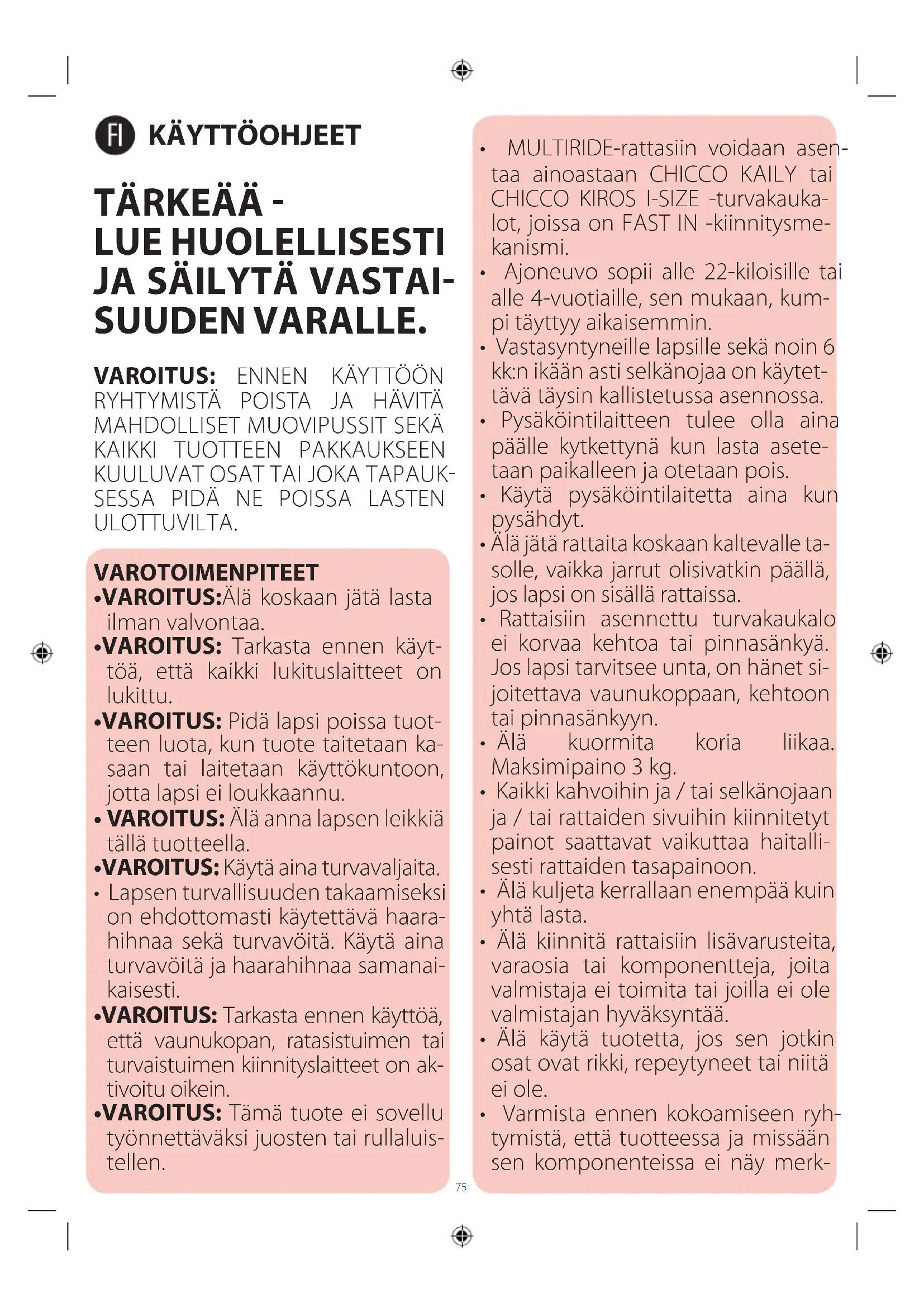 - MULTIRIDE-rattasiin voidaan asen- taa ainoastaan CHICCO KAILY tai CHICCO KIROS I-SIZE -turvakauka- lot, joissa on FAST IN -kiinnitysme- kanismi.