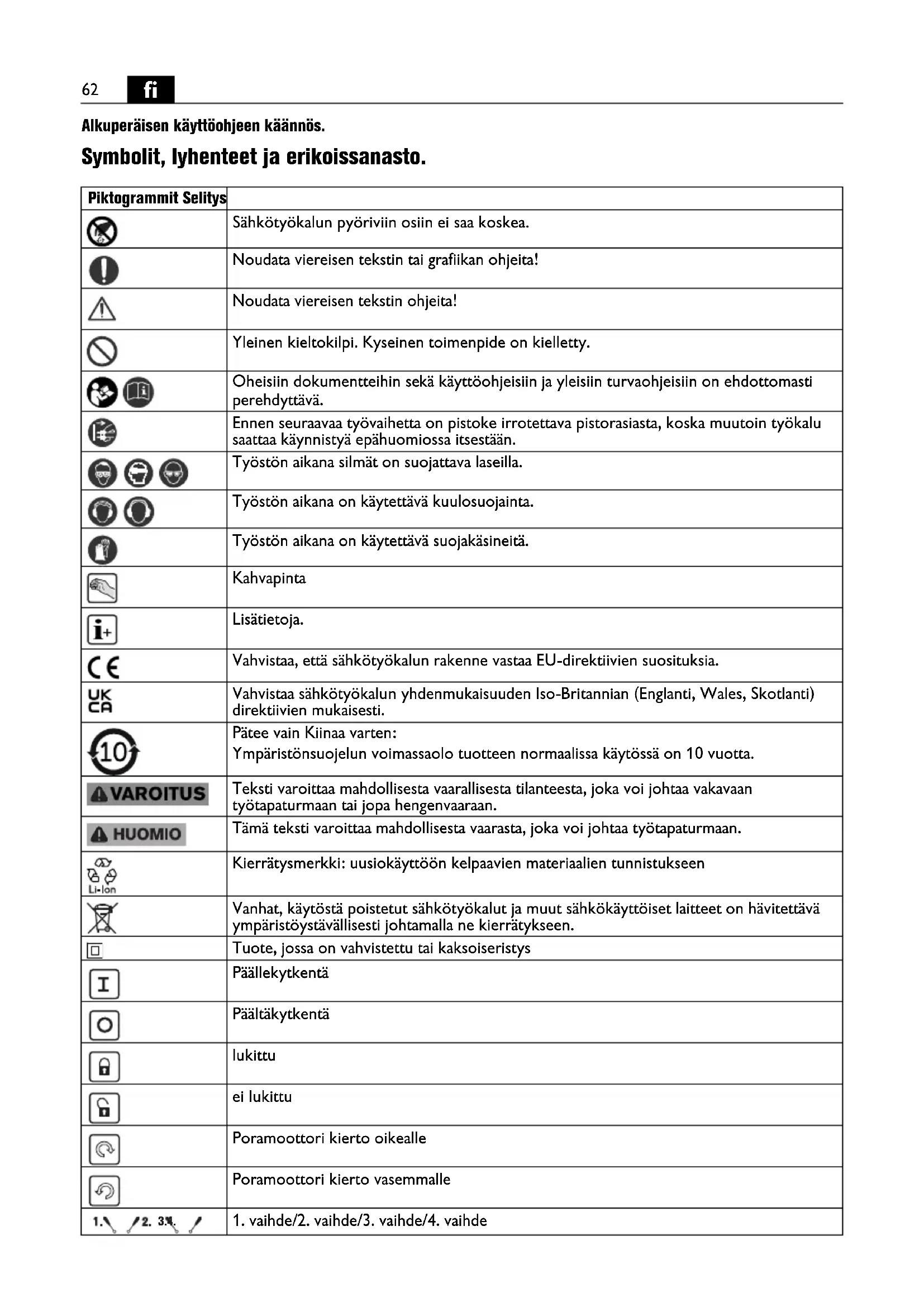 Alkuperäisen käyttöohjeen käännös. Symbolit, lyhenteet ja erikoissanasto. Piktogrammit Selitys Sähkötyökalun pyöriviin osiin ei saa koskea. Noudata viereisen tekstin tai grafiikan ohjeita! Noudata viereisen tekstin ohjeita! Yleinen kieltokilpi. Kyseinen toimenpide on kielletty. Oheisiin dokumentteihin sekä käyttöohjeisiin ja yleisiin turvaohjeisiin on ehdottomasti perehdyttävä. Ennen seuraavaa työvaihetta on pistoke irrotettava pistorasiasta, koska muutoin työkalu saattaa käynnistyä epähuomiossa itsestään. Työstön aikana silmät on suojattava laseilla. Työstön aikana on käytettävä kuulosuojainta. Työstön aikana on käytettävä suojakäsineitä. Kahvapinta Lisätietoja. Vahvistaa, että sähkötyökalun rakenne vastaa EU-direktiivien suosituksia. Vahvistaa sähkötyökalun yhdenmukaisuuden Iso-Britannian (Englanti, Wales, Skotlanti) direktiivien mukaisesti. Pätee vain Kiinaa varten: Ympäristönsuojelun voimassaolo tuotteen normaalissa käytössä on 10 vuotta. Teksti varoittaa mahdollisesta vaarallisesta tilanteesta, joka voi johtaa vakavaan työtapaturmaan tai jopa hengenvaaraan. Tämä teksti varoittaa mahdollisesta vaarasta, joka voi johtaa työtapaturmaan. Kierrätysmerkki: uusiokäyttöön kelpaavien materiaalien tunnistukseen Vanhat, käytöstä poistetut sähkötyökalut ja muut sähkökäyttöiset laitteet on hävitettävä ympäristöystävällisesti johtamalla ne kierrätykseen. Tuote, jossa on vahvistettu tai kaksoiseristys Päällekytkentä Päältäkytkentä lukittu ei lukittu Poramoottori kierto oikealle Poramoottori kierto vasemmalle