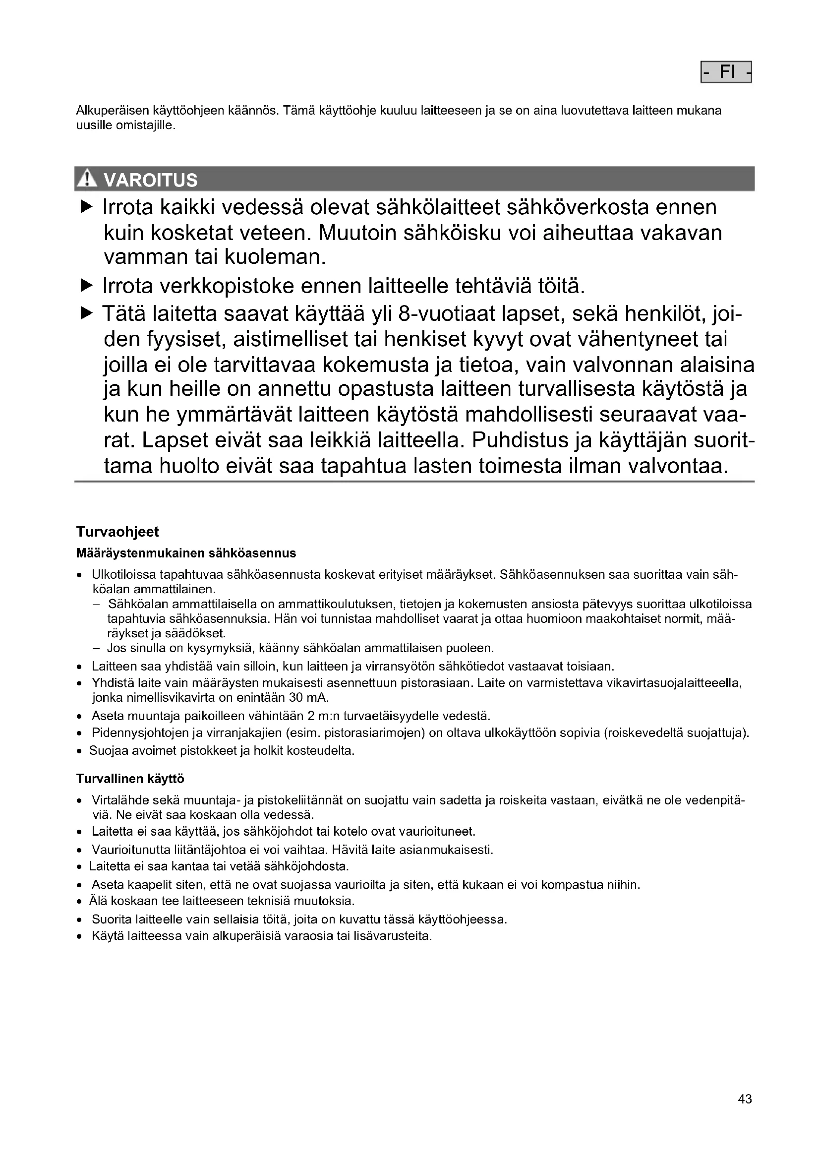 VAROIT US VAROITUS Irrota kaikki vedessä olevat sähkölaitteet sähköverkosta ennen kuin kosketat veteen. Muutoin sähköisku voi aiheuttaa vakavan vamman tai kuoleman. Irrota verkkopistoke ennen laitteelle tehtäviä töitä. Tätä laitetta saavat käyttää yli 8-vuotiaat lapset, sekä henkilöt, joi- den fyysiset, aistimelliset tai henkiset kyvyt ovat vähentyneet tai joilla ei ole tarvittavaa kokemusta ja tietoa, vain valvonnan alaisina ja kun heille on annettu opastusta laitteen turvallisesta käytöstä ja kun he ymmärtävät laitteen käytöstä mahdollisesti seuraavat vaa- rat. Lapset eivät saa leikkiä laitteella. Puhdistus ja käyttäjän suorit- tama huolto eivät saa tapahtua lasten toimesta ilman valvontaa.