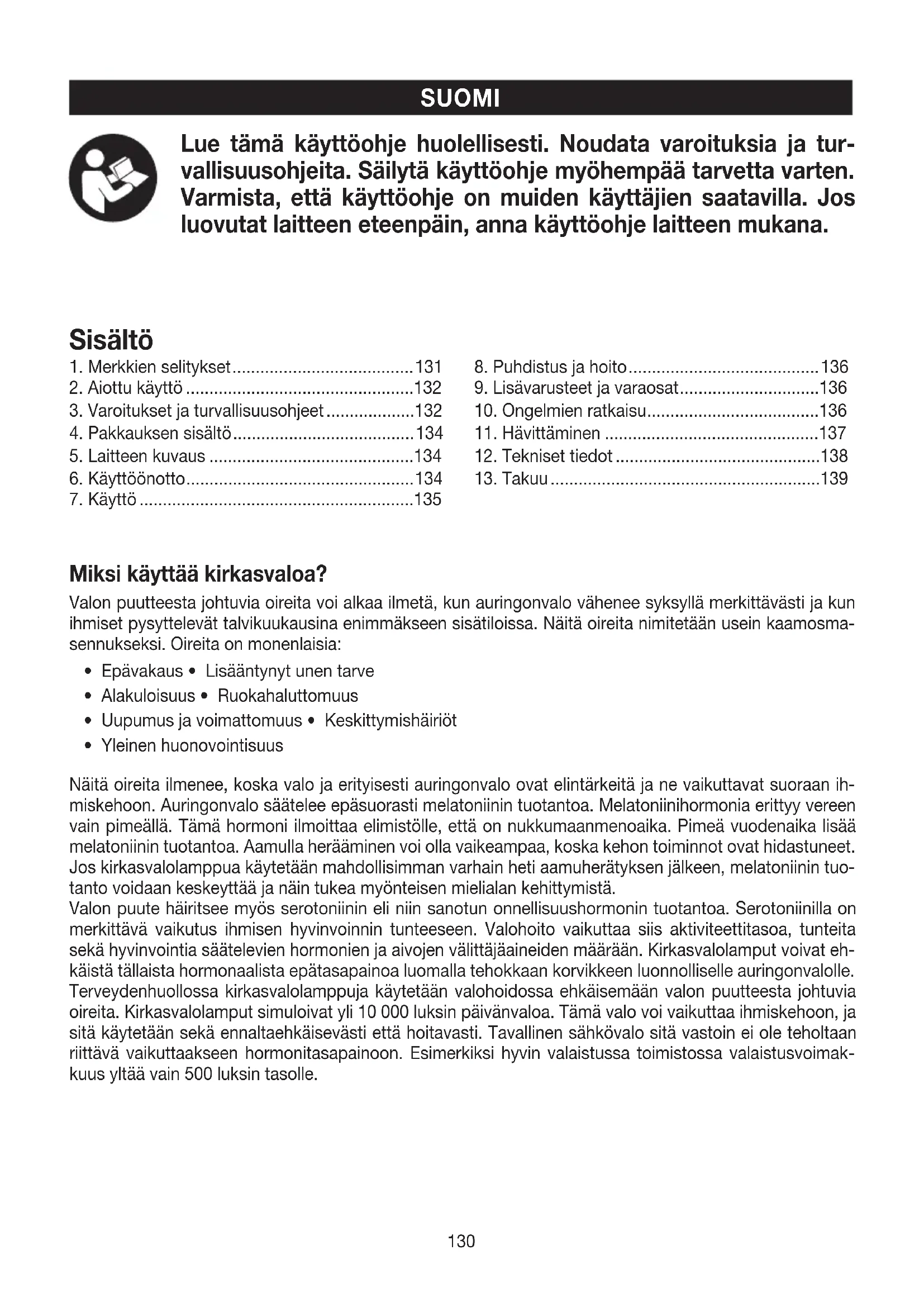 Du finner detaljert informasjon om garantien og garantivilkårene på det medfølgende garantiarket. Varsling om hendelser For brukere/pasienter i EU og identiske reguleringssystemer (forordning om medisinsk utstyr MDR (EU) 2017/745) gjelder følgende: Hvis det skulle oppstå en alvorlig hendelse under eller på grunn av bruken av produktet, skal dette rapporteres til produsenten og/eller dennes autoriserte representant samt respektive nasjonale myndighet i det landet der brukeren/pasienten befinner seg. Med forbehold om feil og endringer130 SUOMI Lue tämä käyttöohje huolellisesti. Noudata varoituksia ja tur- vallisuusohjeita. Säilytä käyttöohje myöhempää tarvetta varten. Varmista, että käyttöohje on muiden käyttäjien saatavilla. Jos luovutat laitteen eteenpäin, anna käyttöohje laitteen mukana. Miksi käyttää kirkasvaloa? Valon puutteesta johtuvia oireita voi alkaa ilmetä, kun auringonvalo vähenee syksyllä merkittävästi ja kun ihmiset pysyttelevät talvikuukausina enimmäkseen sisätiloissa. Näitä oireita nimitetään usein kaamosma