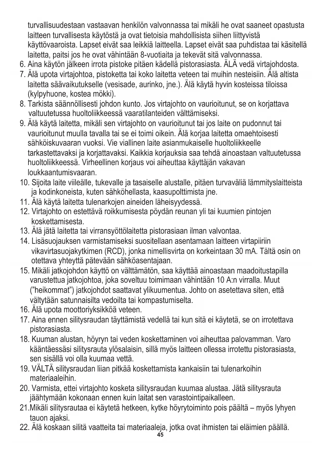 Käyttöturvallisuuden parantamiseksi yhteen sähköpiiriin ei saa kytkeä samanaikaisesti useampia sähkölaitteita. A környezet védelme érdekében kérjük külön karton dobozok és műanyag zsákokat és dobja őket a megfelelő hulladék közé. Használt készüléket kell eljuttatni a kijelölt gyűjtőhelyekre miatt veszélyes elemek alkatrészeket, amelyek hatással lehetnek a környezetre. Ne dobja a készüléket a közös szemétkosárba. SUOMI 44turvallisuudestaan vastaavan henkilön valvonnassa tai mikäli he ovat saaneet opastusta laitteen turvallisesta käytöstä ja ovat tietoisia mahdollisista siihen liittyvistä käyttövaaroista. Lapset eivät saa leikkiä laitteella. Lapset eivät saa puhdistaa tai käsitellä laitetta, paitsi jos he ovat vähintään 8-vuotiaita ja tekevät sitä valvonnassa.
