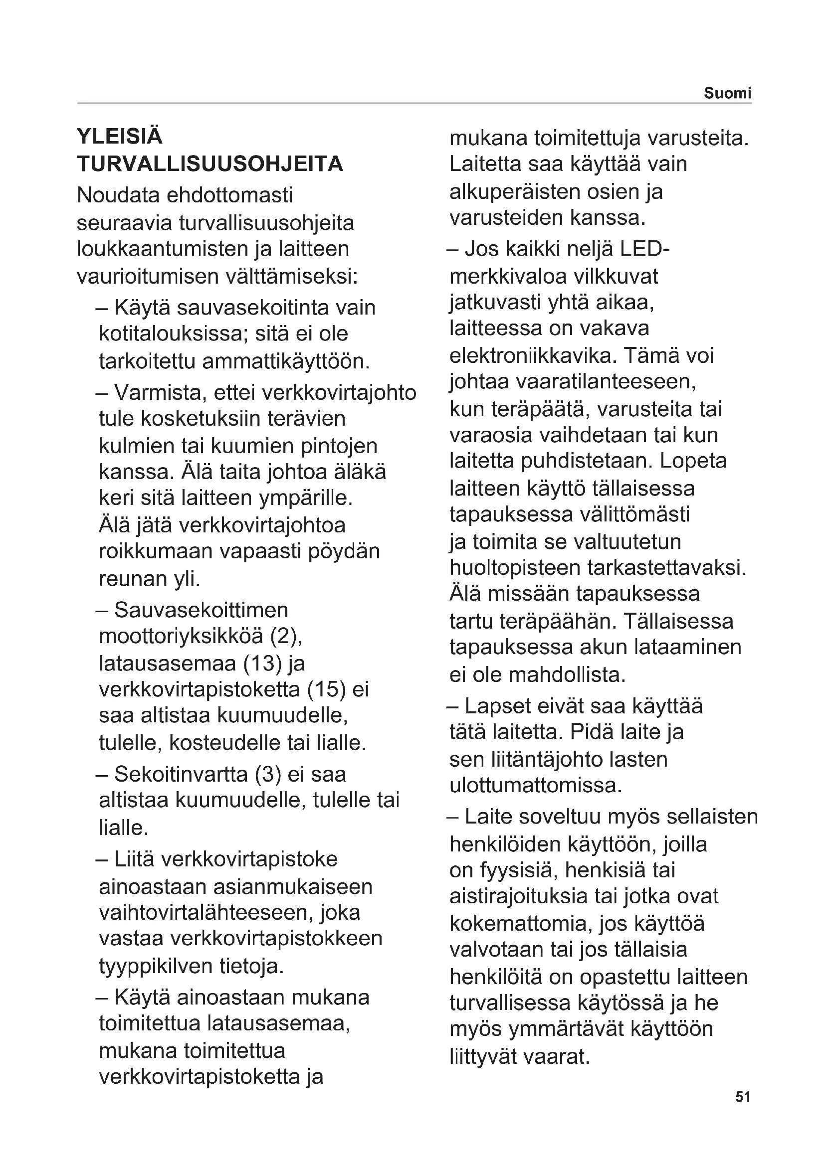 Símbolo Explicación Marcado CE: Este producto es conforme con los requisitos actuales de la unión Europea. Este producto se ha comercializado después del 13 de agosto de 2005. No se puede desechar con la basura doméstica. El símbolo del contenedor de basura tachado indica la necesidad de una recogida selectiva. Apto para el contacto con alimentos Fuente de alimentación conmutable Transformador de seguridad resistente a cortocircuitos Uso exclusivo en espacios interiores Dispositivo con clase de protección II Clase de protección II Polaridad de la conexión de corriente continua Clase de protección IP 20; protegido contra el acceso a partes peligrosas con un dedo Temperatura ambiente máxima 40 °C51 YLEISIÄ TURVALLISUUSOHJEITA Noudata ehdottomasti seuraavia turvallisuusohjeita loukkaantumisten ja laitteen vaurioitumisen välttämiseksi: – Käytä sauvasekoitinta vain kotitalouksissa; sitä ei ole tarkoitettu ammattikäyttöön. – Varmista, ettei verkkovirtajohto tule kosketuksiin terävien kulmien tai kuumien pintojen kanssa. Älä taita johtoa äläkä keri sitä laitteen ympärille. Älä jätä verkkovirtajohtoa roikkumaan vapaasti pöydän reunan yli. – Sauvasekoittimen moottoriyksikköä (2), latausasemaa (13) ja verkkovirtapistoketta (15) ei saa altistaa kuumuudelle, tulelle, kosteudelle tai lialle. – Sekoitinvartta (3) ei saa altistaa kuumuudelle, tulelle tai lialle. – Liitä verkkovirtapistoke ainoastaan asianmukaiseen vaihtovirtalähteeseen, joka vastaa verkkovirtapistokkeen tyyppikilven tietoja. – Käytä ainoastaan mukana toimitettua latausasemaa, mukana toimitettua verkkovirtapistoketta ja mukana toimitettuja varusteita. Laitetta saa käyttää vain alkuperäisten osien ja varusteiden kanssa. – Jos kaikki neljä LED- merkkivaloa vilkkuvat jatkuvasti yhtä aikaa, laitteessa on vakava elektroniikkavika. Tämä voi johtaa vaaratilanteeseen, kun teräpäätä, varusteita tai varaosia vaihdetaan tai kun laitetta puhdistetaan. Lopeta laitteen käyttö tällaisessa tapauksessa välittömästi ja toimita se valtuutetun huoltopisteen tarkastettavaksi. Älä missään tapauksessa tartu teräpäähän. Tällaisessa tapauksessa akun lataaminen ei ole mahdollista. – Lapset eivät saa käyttää tätä laitetta. Pidä laite ja sen liitäntäjohto lasten ulottumattomissa. – Laite soveltuu myös sellaisten henkilöiden käyttöön, joilla on fyysisiä, henkisiä tai aistirajoituksia tai jotka ovat kokemattomia, jos käyttöä valvotaan tai jos tällaisia henkilöitä on opastettu laitteen turvallisessa käytössä ja he myös ymmärtävät käyttöön liittyvät vaarat. Suomi52 – Lapset eivät saa leikkiä laitteella. – Käynnistä sauvasekoitin vasta sitten, kun se on asetettu tasapohjaiseen astiaan. – Sauvasekoitinta ei saa upottaa sekoitettavaan ainekseen sekoitinvarren ja moottoriyksikön välistä liitoskohtaa syvemmälle. – Älä jätä laitetta ilman valvontaa käytön aikana. – Älä koskaan upota koko sauvasekoitinta, latausasemaa tai verkkovirtapistoketta veteen tai muuhun nesteeseen. Älä koskaan altista laitetta sateelle tai muulle kosteudelle. Jos laite kuitenkin putoaa veteen, irrota ensin latausaseman verkkovirtapistoke pistorasiasta ja nosta vasta sitten laitteen osat vedestä. Anna valtuutetun huoltopisteen tarkastaa sen jälkeen koko laite, ennen kuin otat sen uudelleen käyttöön. – Älä käytä laitetta kostein käsin. Älä käytä laitetta, jos se on märkä tai kostea tai jos seisot kostealla lattialla. Älä käytä laitetta ulkotiloissa. – Sauvasekoitinta ja latausasemaa ei saa pestä astianpesukoneessa. – Älä missään tapauksessa koske teräpäähän käytön aikana äläkä työnnä mitään esineitä käynnissä olevaan sauvasekoittimeen. Loukkaantumisvaara – Irrota verkkovirtapistoke aina pistorasiasta, jos latausasemassa ilmenee toimintahäiriö. Irrota vetämällä suoraan pistokkeesta; älä vedä johdosta. – Jos havaitset vaurioita laitteen osissa, lopeta käyttö välittömästi vaaratilanteiden välttämiseksi. Anna valtuutetun huoltopisteen tarkastaa sen jälkeen koko laite, ennen kuin otat sen uudelleen käyttöön. – Jos verkkovirtapistoke tai -johto vaurioituu, verkkovirtapistoke on vaihdettava uuteen alkuperäisosaan. Näitä varaosia on saatavana valmistajalta tai valmistajan maakohtaisesta asiakaspalvelupisteestä. Suomi53 – Älä koskaan käynnistä sauvasekoitinta, kun puhdistat laitetta, irrotat tai kiinnität teräpäätä tai vaihdat varusteita tai varaosia. – Pidä sormesi loitolla laitteen painikkeista. Älä koske teräpäiden leikkuuosiin, sillä ne ovat erittäin teräviä. – Käsiteltävistä elintarvikkeista saattaa syntyä roiskeita. Anna siksi kuumien elintarvikkeiden jäähtyä ennen niiden käsittelyä, jotta vältät palovammojen vaaran. – Nosta kattila pois liedeltä, kun käytät sauvasekoitinta kattilassa. Suomi – Varmista, että käytettävän teräpään kolo asettuu kunnolla käyttöakselin tappiin. Väljästi istuvia teräpäitä ei saa käyttää, vaan ne on vaihdettava. Räjähdysvaara – Suojaa akut kuumuudelta ja tulelta. LED-ilmaisimen (6) yleiskatsaus LED-valot Kuvaus Sauvasekoitin latausasemassa pois päältä akku täyteen latautunut vilkkuvat yksitellen vasemmalta oikealle akku latautuu, viimeisin vilkkuva LED osoittaa lataustilan kaikki vilkkuvat yhdessä käyttövirhe (laite kytketty päälle latausasemassa) Sauvasekoitin irti latausasemasta 1, 2, 3 tai 4 LED-valoa palaa laite on käytössä, LED-valojen määrä osoittaa lataustilan LED 1 vilkkuu hitaasti (1 s päällä / 1 s pois) akku tyhjä LED 1 välähtelee lyhyesti (0,1 s päällä / 1 s pois) akkuvika (katso „AKUN VAIHTO“) kaikki 4 LED-valoa vilkkuvat hitaasti (1 s päällä / 1 s pois) ylikuormitussuoja (katso „TOIMINNAN KUVAUS“)54 Sauvasekoittimella on kolme toimintanopeutta. Ylikuormitussuoja aktivoituu ja kytkee laitteen automaattisesti pois päältä seuraavissa tapauksissa: –