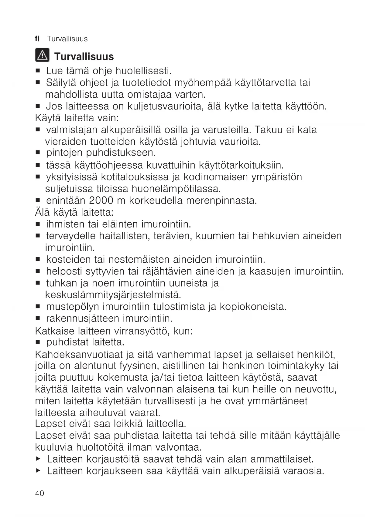 Turvallisuus ¡ Lue tämä ohje huolellisesti. ¡ Säilytä ohjeet ja tuotetiedot myöhempää käyttötarvetta tai mahdollista uutta omistajaa varten. ¡ Jos laitteessa on kuljetusvaurioita, älä kytke laitetta käyttöön. Käytä laitetta vain: ¡ valmistajan alkuperäisillä osilla ja varusteilla. Takuu ei kata vieraiden tuotteiden käytöstä johtuvia vaurioita. ¡ pintojen puhdistukseen. ¡ tässä käyttöohjeessa kuvattuihin käyttötarkoituksiin. ¡ yksityisissä kotitalouksissa ja kodinomaisen ympäristön suljetuissa tiloissa huonelämpötilassa. ¡ enintään 2000m korkeudella merenpinnasta. Älä käytä laitetta: ¡ ihmisten tai eläinten imurointiin. ¡ terveydelle haitallisten, terävien, kuumien tai hehkuvien aineiden imurointiin. ¡ kosteiden tai nestemäisten aineiden imurointiin. ¡ helposti syttyvien tai räjähtävien aineiden ja kaasujen imurointiin. ¡ tuhkan ja noen imurointiin uuneista ja keskuslämmitysjärjestelmistä. ¡ mustepölyn imurointiin tulostimista ja kopiokoneista. ¡ rakennusjätteen imurointiin. Katkaise laitteen virransyöttö, kun: ¡ puhdistat laitetta. Kahdeksanvuotiaat ja sitä vanhemmat lapset ja sellaiset henkilöt, joilla on alentunut fyysinen, aistillinen tai henkinen toimintakyky tai joilta puuttuu kokemusta ja/tai tietoa laitteen käytöstä, saavat käyttää laitetta vain valvonnan alaisena tai kun heille on neuvottu, miten laitetta käytetään turvallisesti ja he ovat ymmärtäneet laitteesta aiheutuvat vaarat. Lapset eivät saa leikkiä laitteella. Lapset eivät saa puhdistaa laitetta tai tehdä sille mitään käyttäjälle kuuluvia huoltotöitä ilman valvontaa. ▶ Laitteen korjaustöitä saavat tehdä vain alan ammattilaiset. ▶ Laitteen korjaukseen saa käyttää vain alkuperäisiä varaosia.Turvallisuus fi