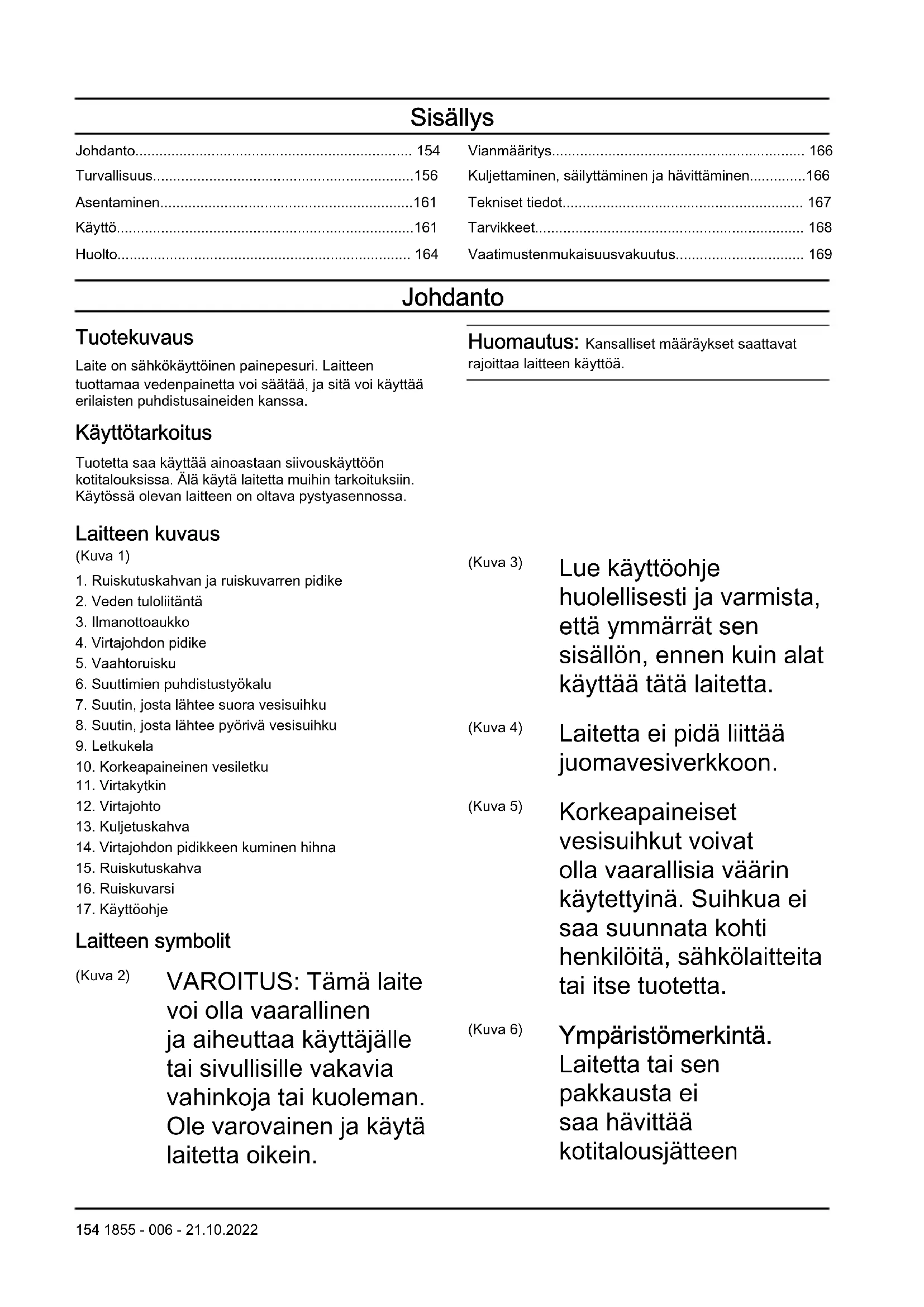 Laitteen symbolit (Kuva 2) VAROITUS: Tämä laite voi olla vaarallinen ja aiheuttaa käyttäjälle tai sivullisille vakavia vahinkoja tai kuoleman. Ole varovainen ja käytä laitetta oikein. (Kuva 3) Lue käyttöohje huolellisesti ja varmista, että ymmärrät sen sisällön, ennen kuin alat käyttää tätä laitetta. (Kuva 4) Laitetta ei pidä liittää juomavesiverkkoon. (Kuva 5) Korkeapaineiset vesisuihkut voivat olla vaarallisia väärin käytettyinä. Suihkua ei saa suunnata kohti henkilöitä, sähkölaitteita tai itse tuotetta. (Kuva 6) Ympäristömerkintä. Laitetta tai sen pakkausta ei saa hävittää kotitalousjätteen 154 1855 - 006 - 21.10.2022mukana. Vie se asianmukaiseen sähkö- ja elektroniikkalaitteiden keräyspisteeseen. (Kuva 7) Luokan II työkalu. (Kuva 8) Laite täyttää soveltuvien EY- direktiivien vaatimukset. (Kuva 9) Laite täyttää soveltuvien Euraasian tulliliiton direktiivien vaatimukset. (Kuva 10) Laite täyttää soveltuvien UkrSEPRO-direktiivien vaatimukset. (Kuva 11) Laite täyttää soveltuvien RCM- direktiivien vaatimukset. Koskee ainoastaan Australiaa ja Uutta- Seelantia. (Kuva 12) Melupäästöt ympäristöön -tarra EU:n ja Yhdistyneen kuningaskunnan direktiivien ja säädösten mukaisesti sekä Uuden Etelä-Walesin "Protection of the Environment Operations (Noise Control) Regulation 2017" -asetuksen mukaisesti. Laitteen taattu äänentehotaso on määritelty kohdassa Tekniset tiedot sivulla